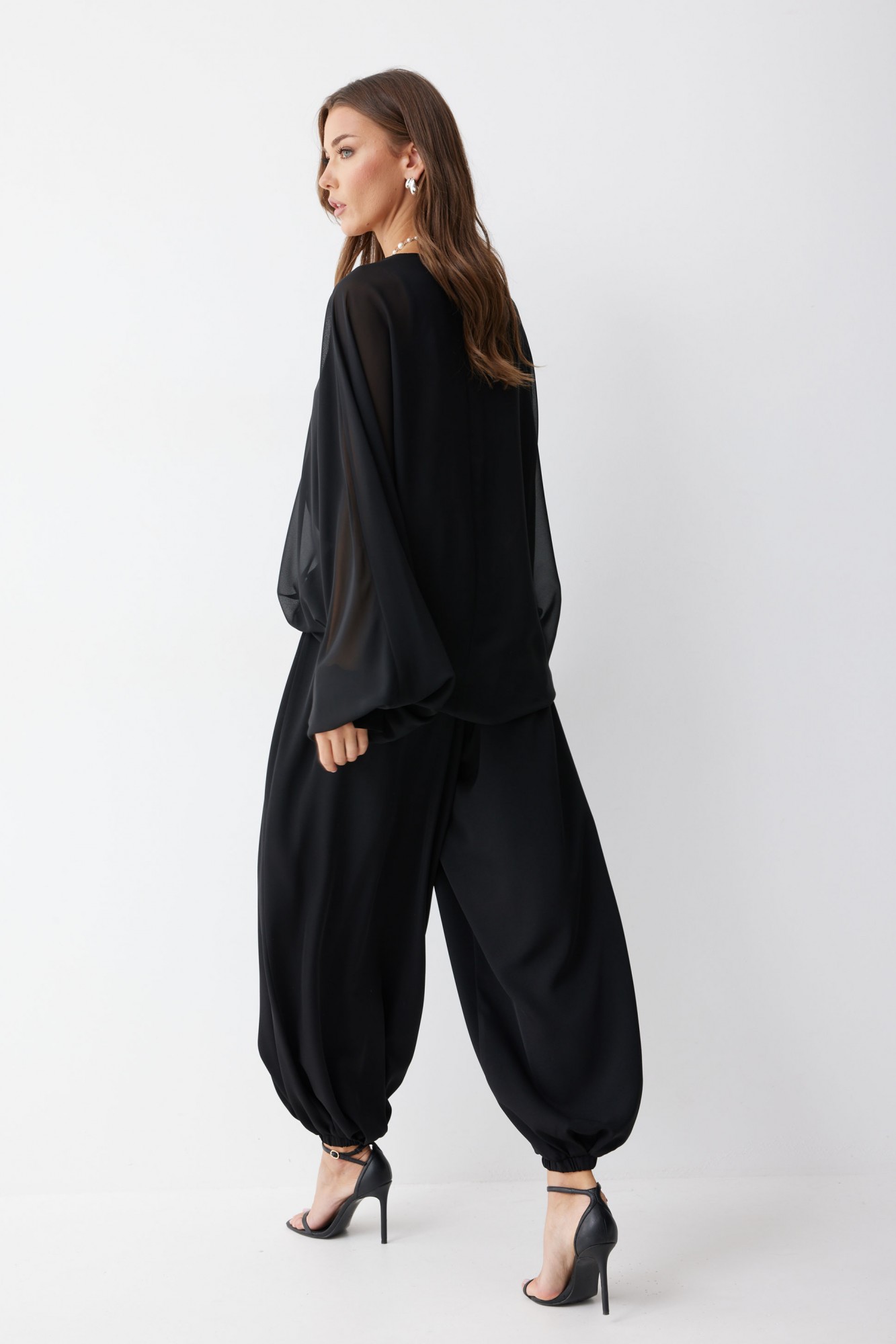 Брюки шаровары свободного, расширенного силуэта, по низу со сборкой. Из струящейся ткани. Пояс с резинкой. По низу манжеты с резинкой.