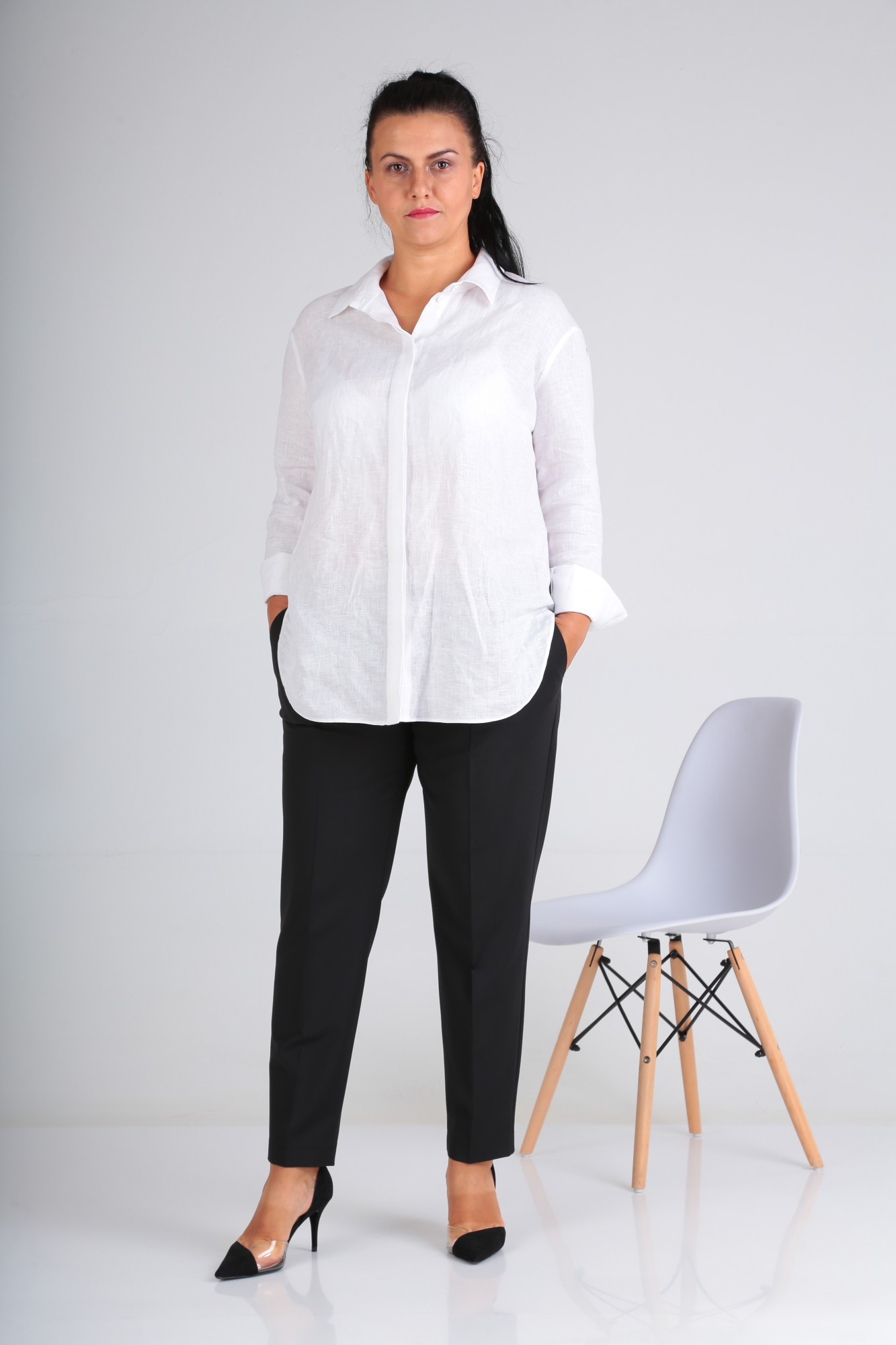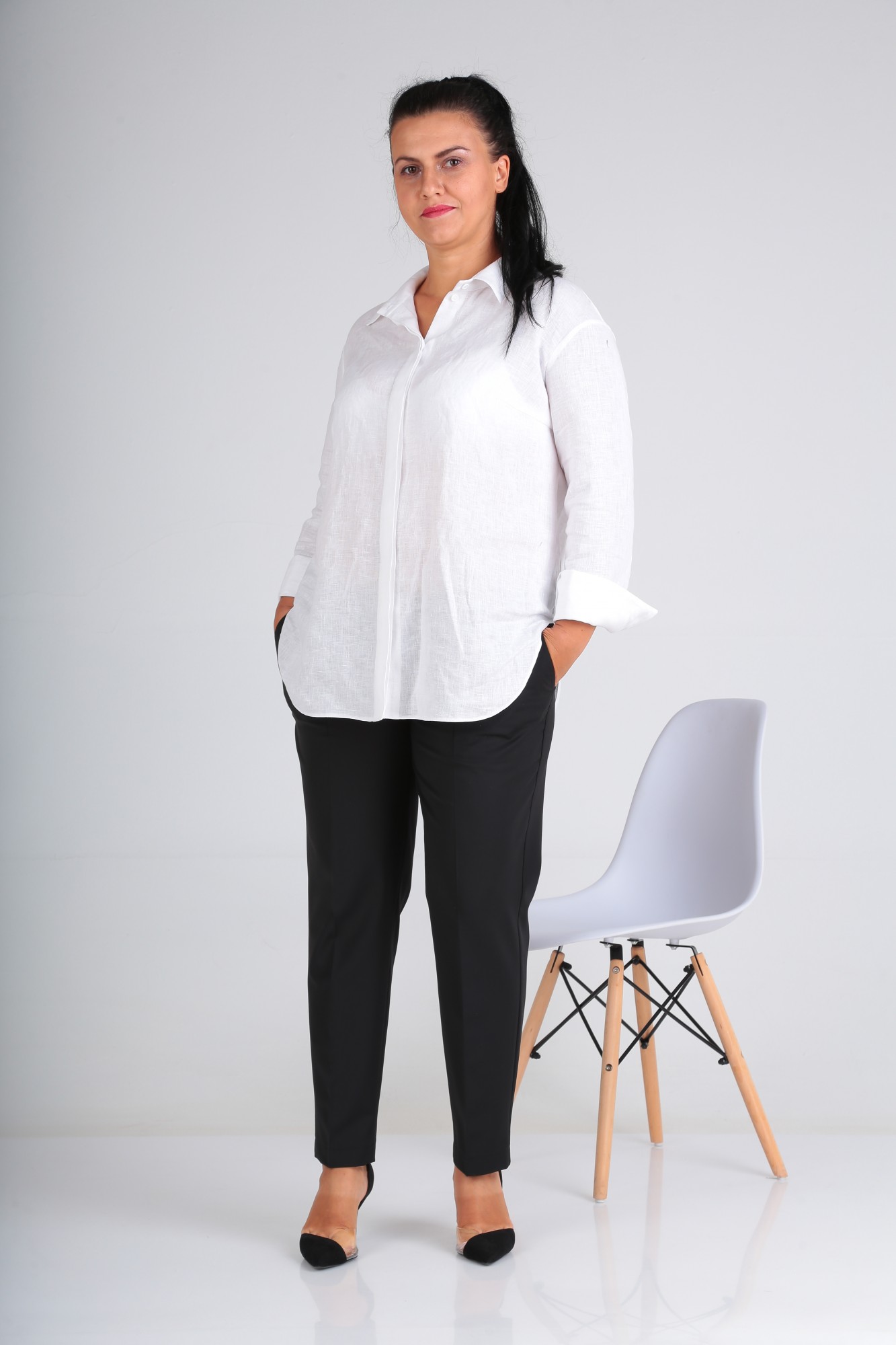 Классические брюки длиной до щиколотки, с боковыми карманами. Карман обработан в отрезном бочке. С классической посадкой по линии талии.