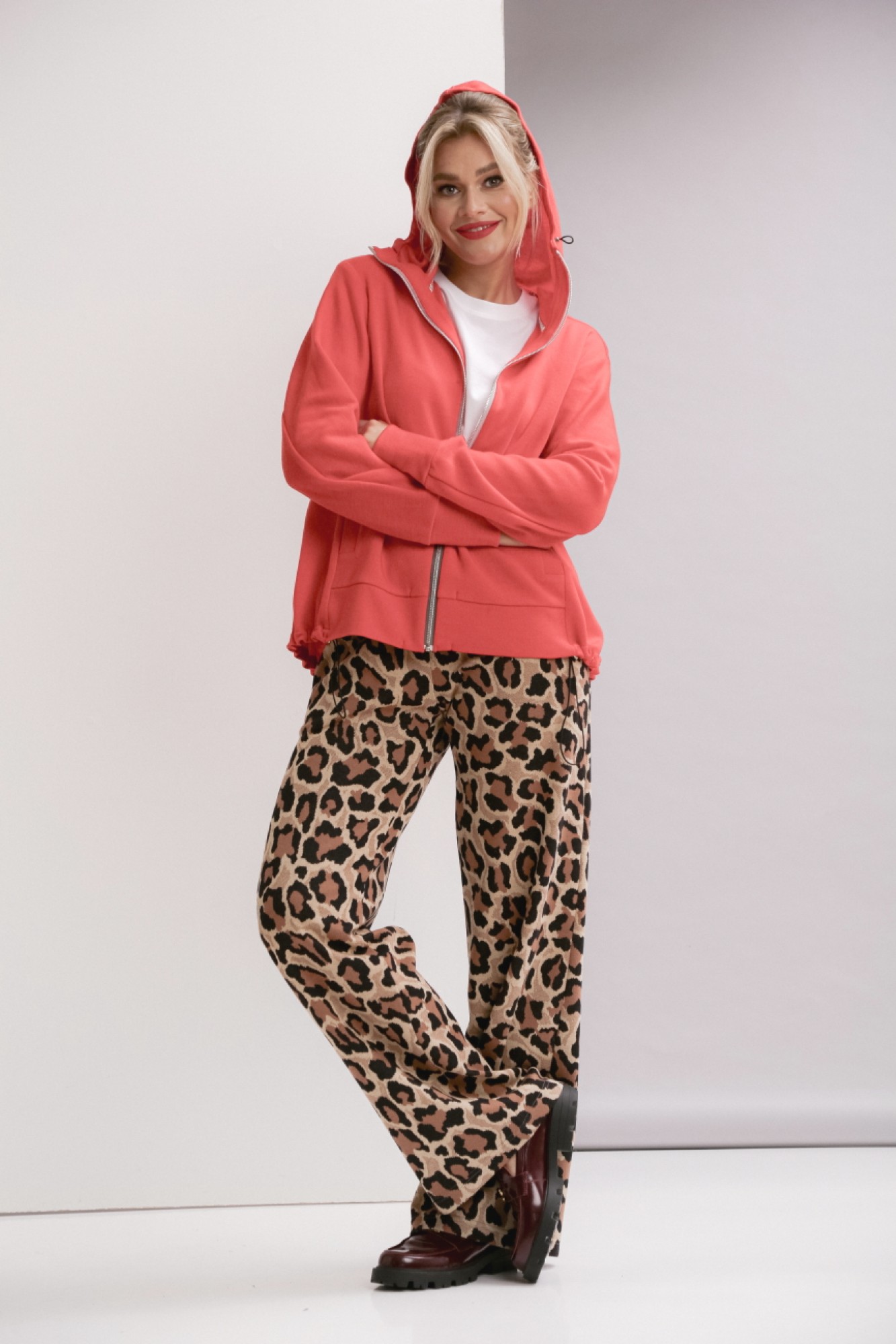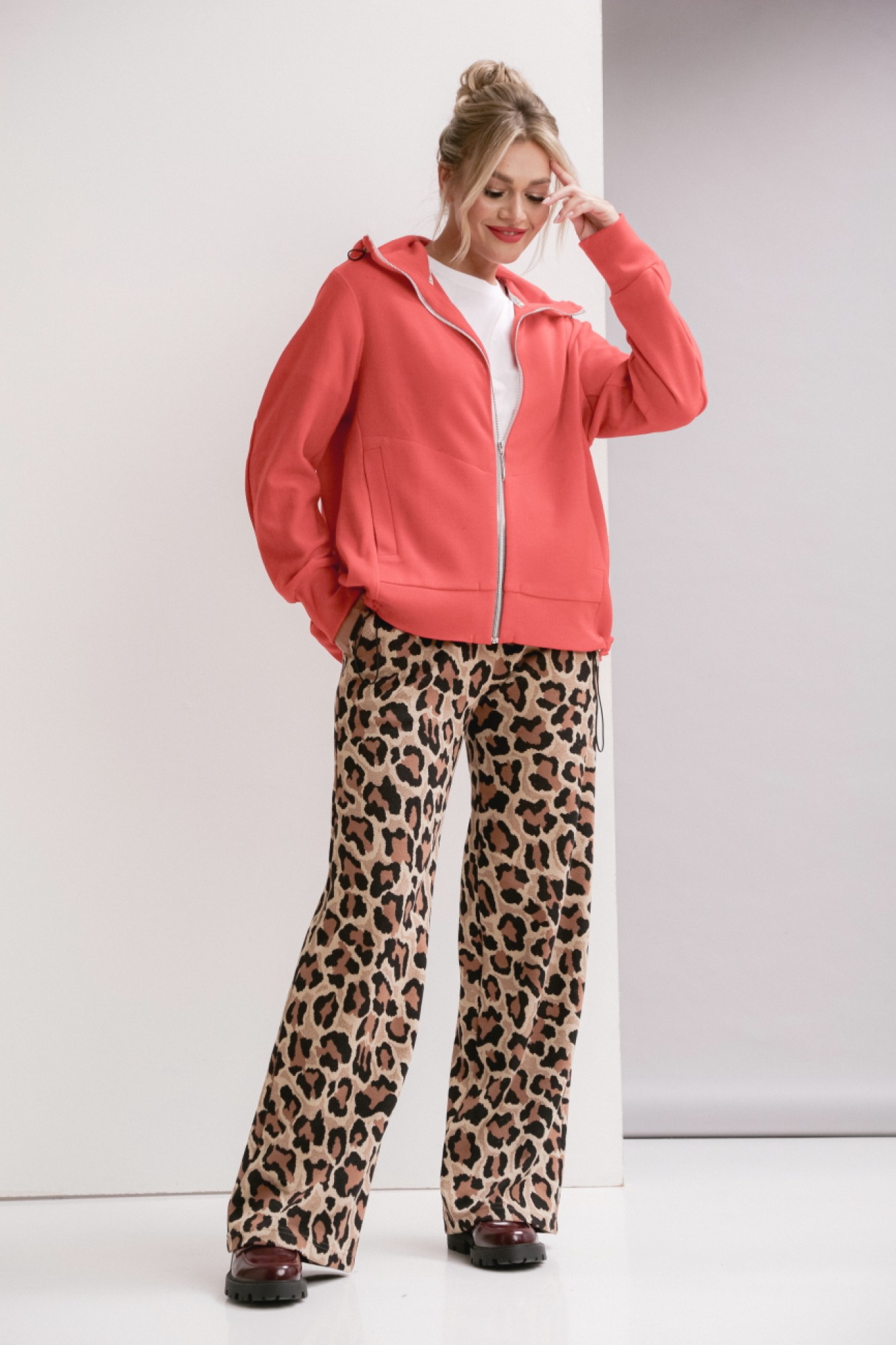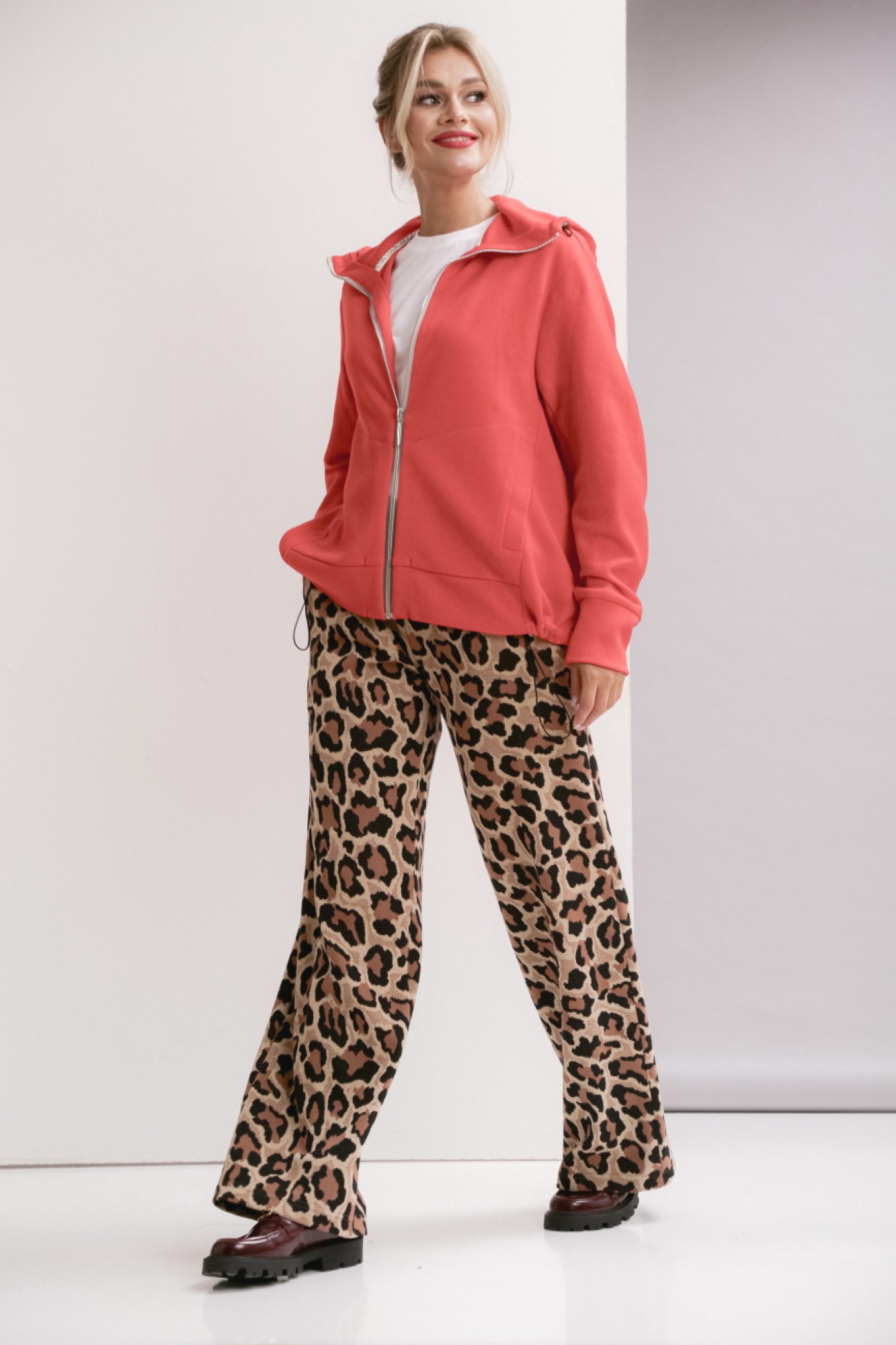 Брюки прямого силуэта с карманами в боковых швах. Ширина линии талии в брюках регулируется резинкой и шнуром.