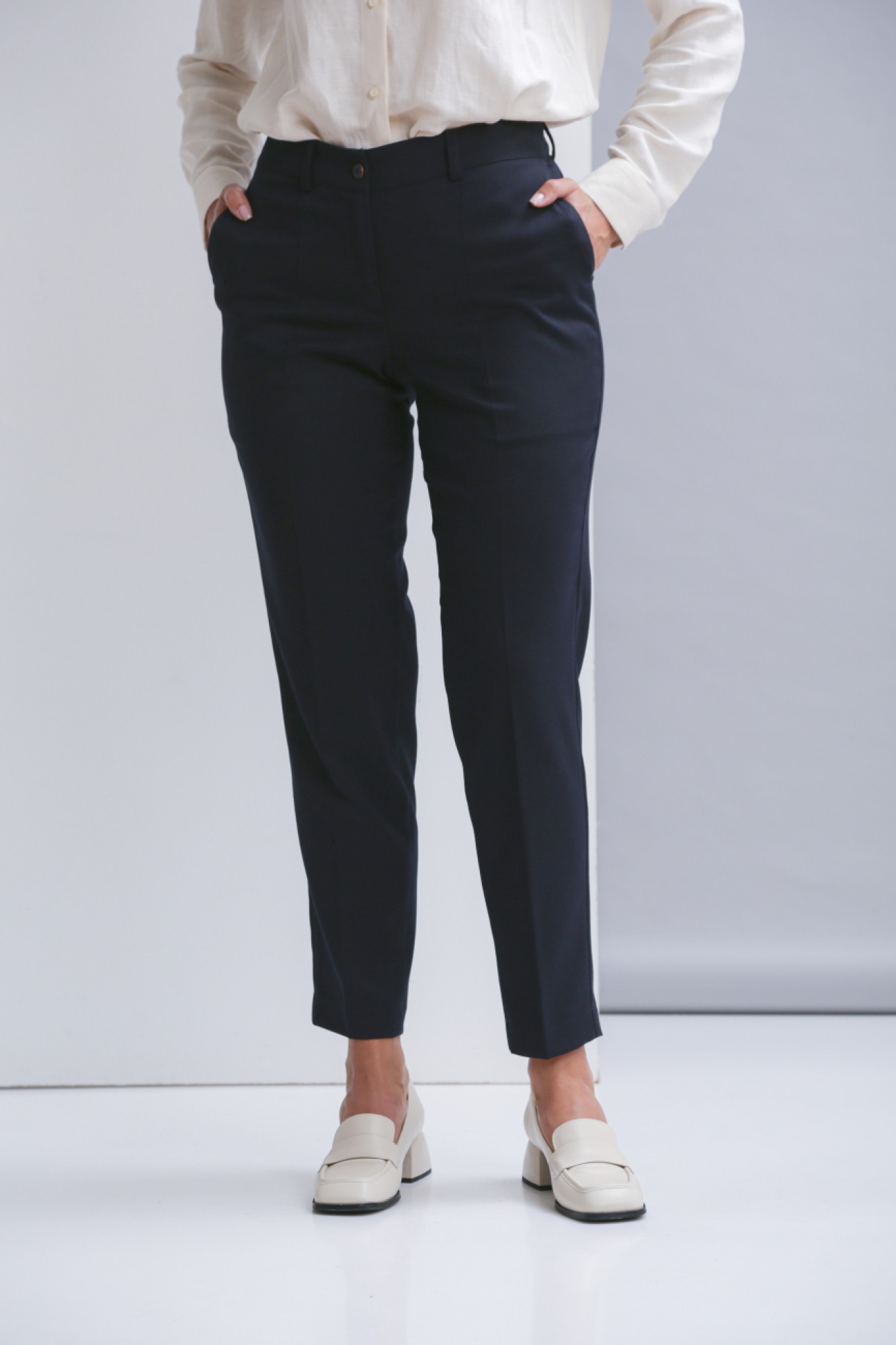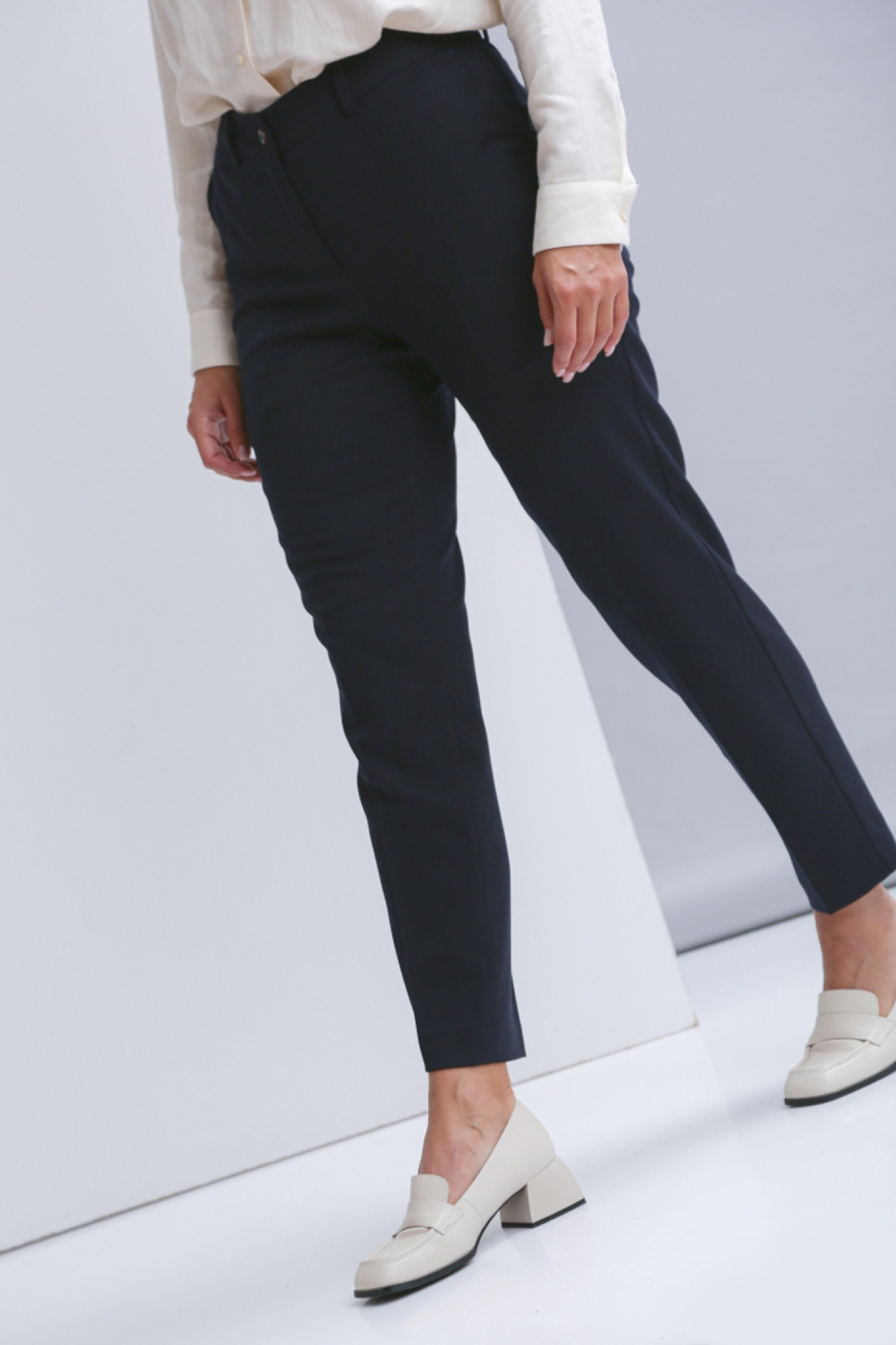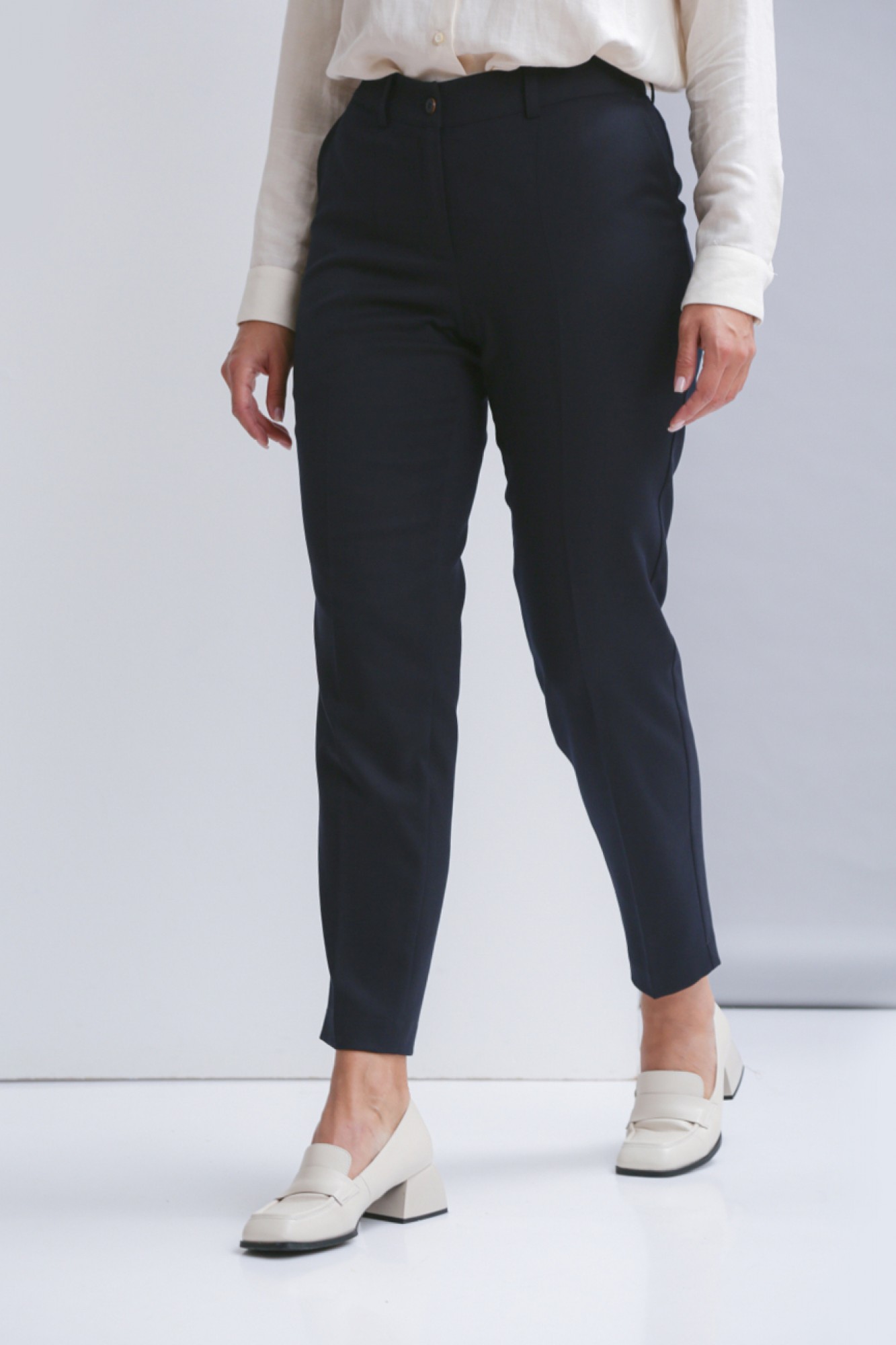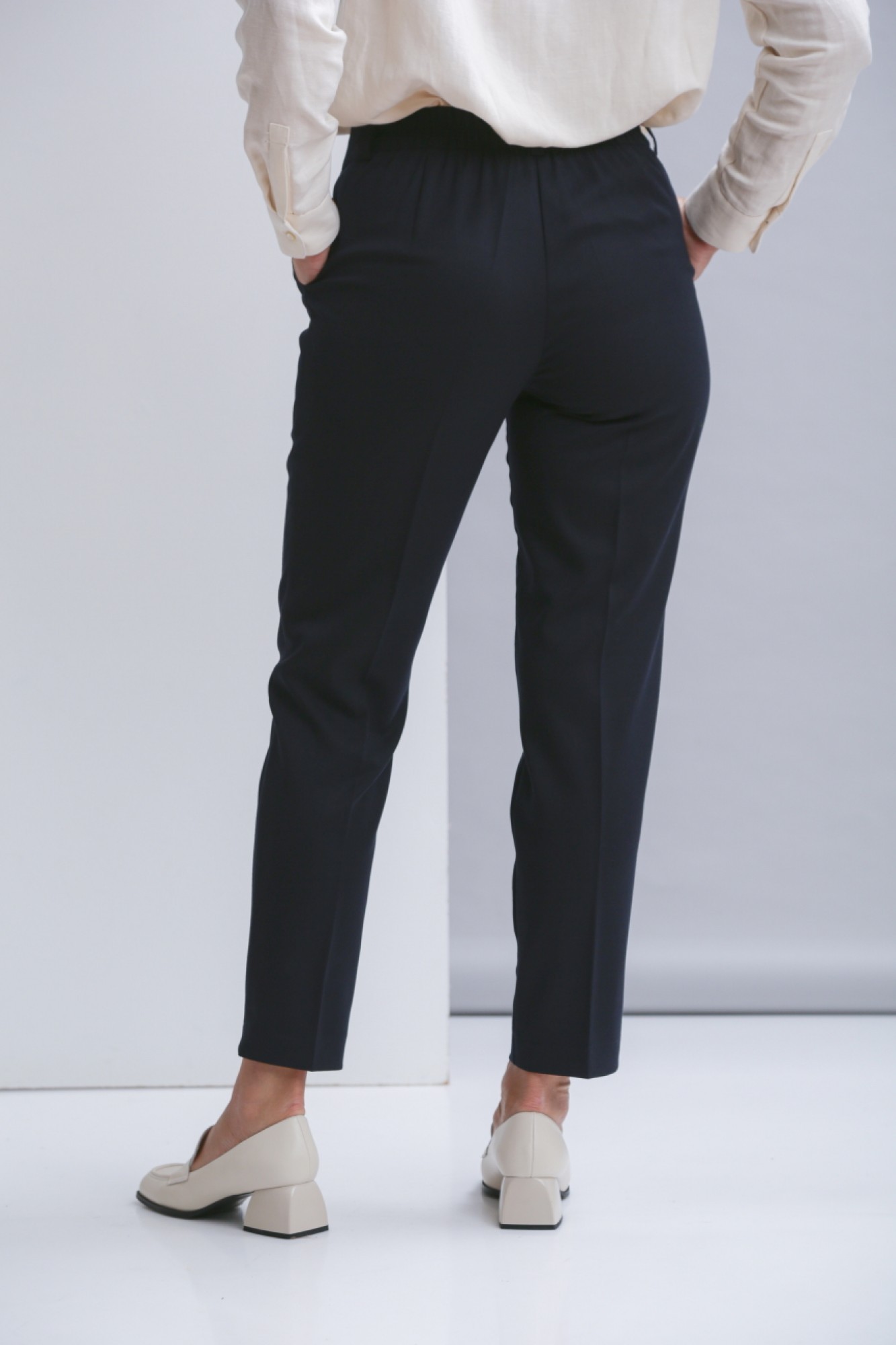 Брюки зауженные со стрелками. В боковых швах карманы. Застежка на тесьму-молнию. Ширина по линии талии регулируется по спинке резинкой.