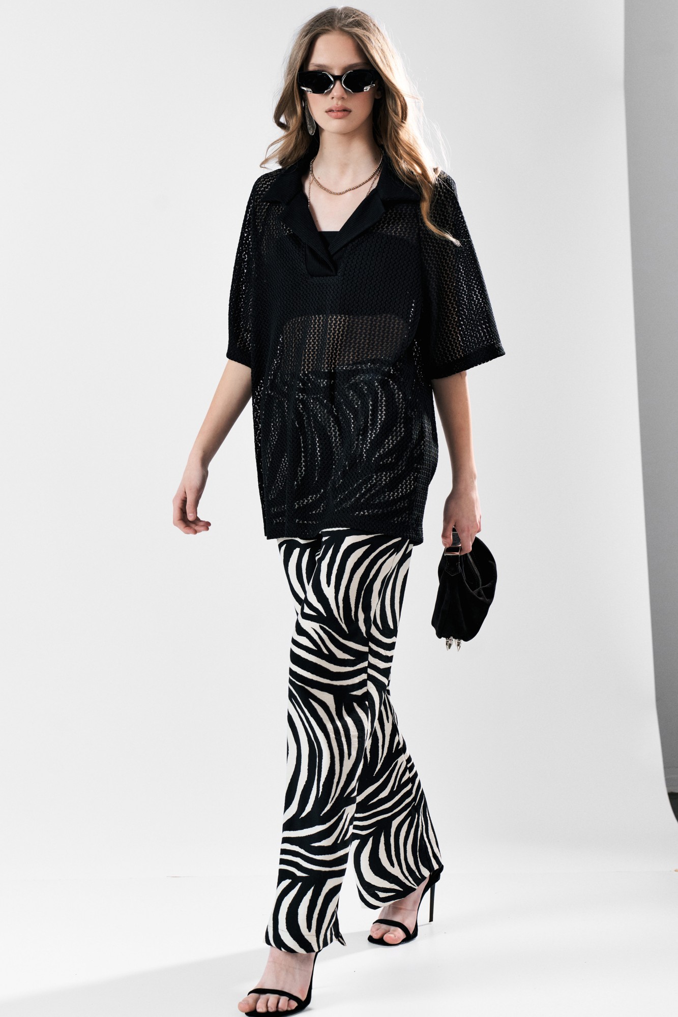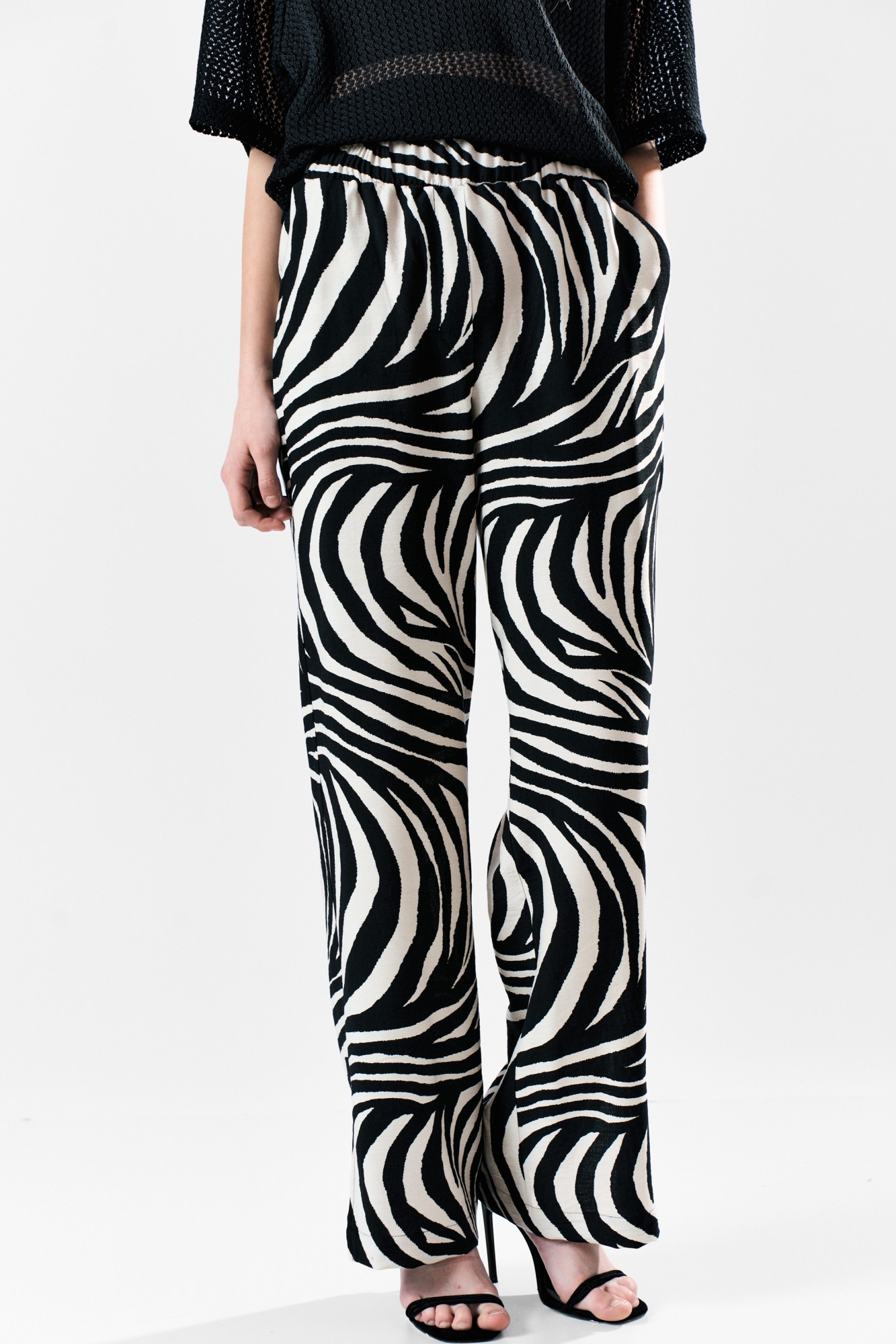 Брюки палаццо, пояс на резинке. Карманы в боковом шве. Разрез по низу брючин.