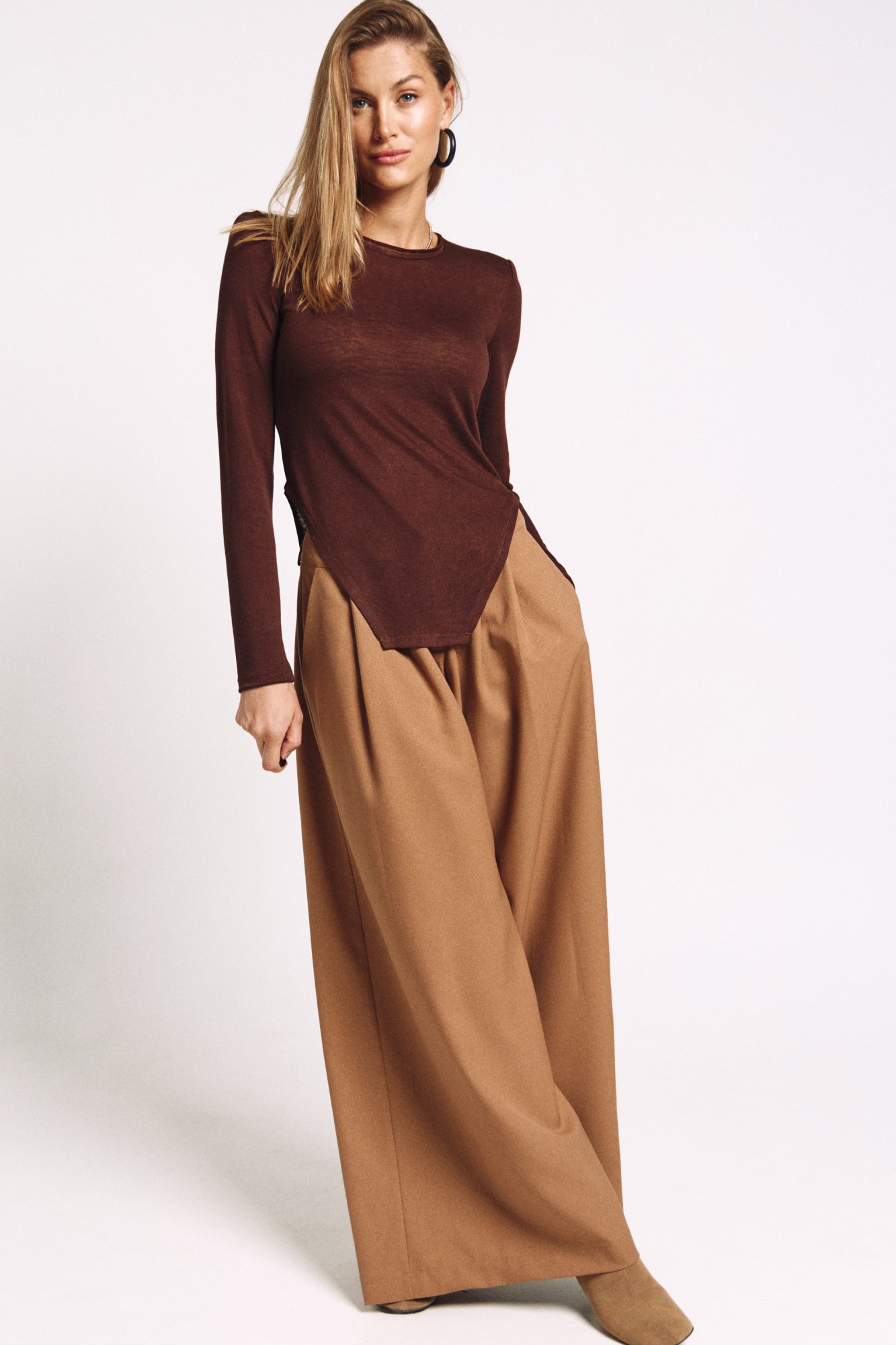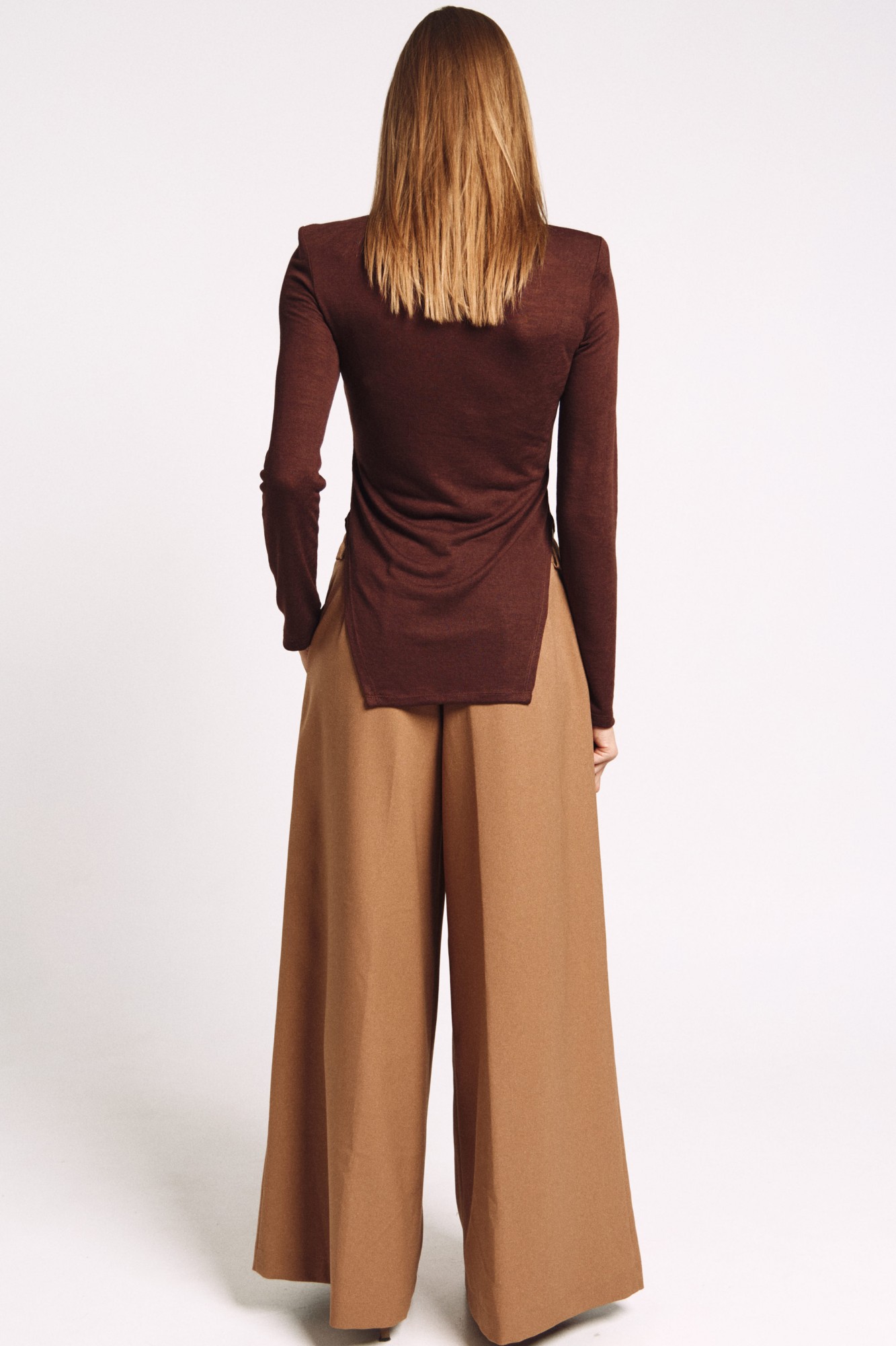 Брюки-палаццо в цвете "охра". Две складки по переду. Карманы в боковых швах. Средняя посадка по талии.