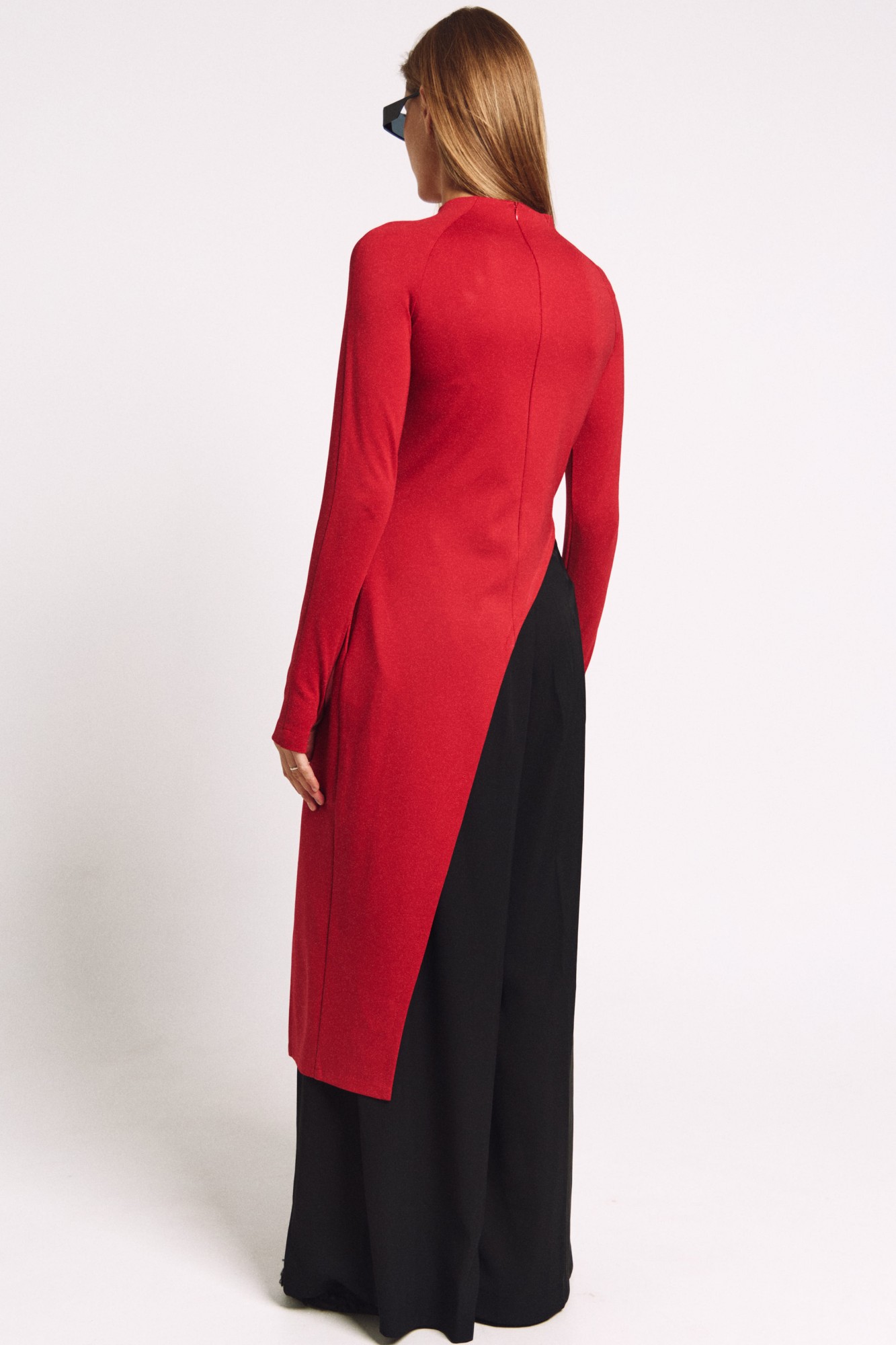 Брюки-"палаццо" из струящегося черного материала со складками по переду и декоративной лентой-поясом. Посадка - средняя. Карманы в боковых швах.