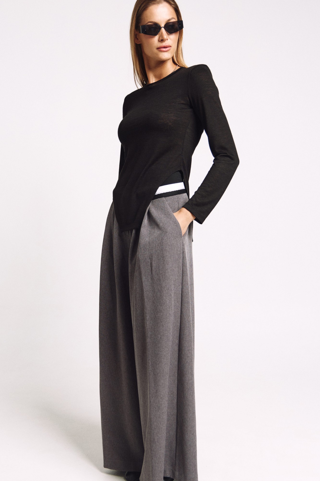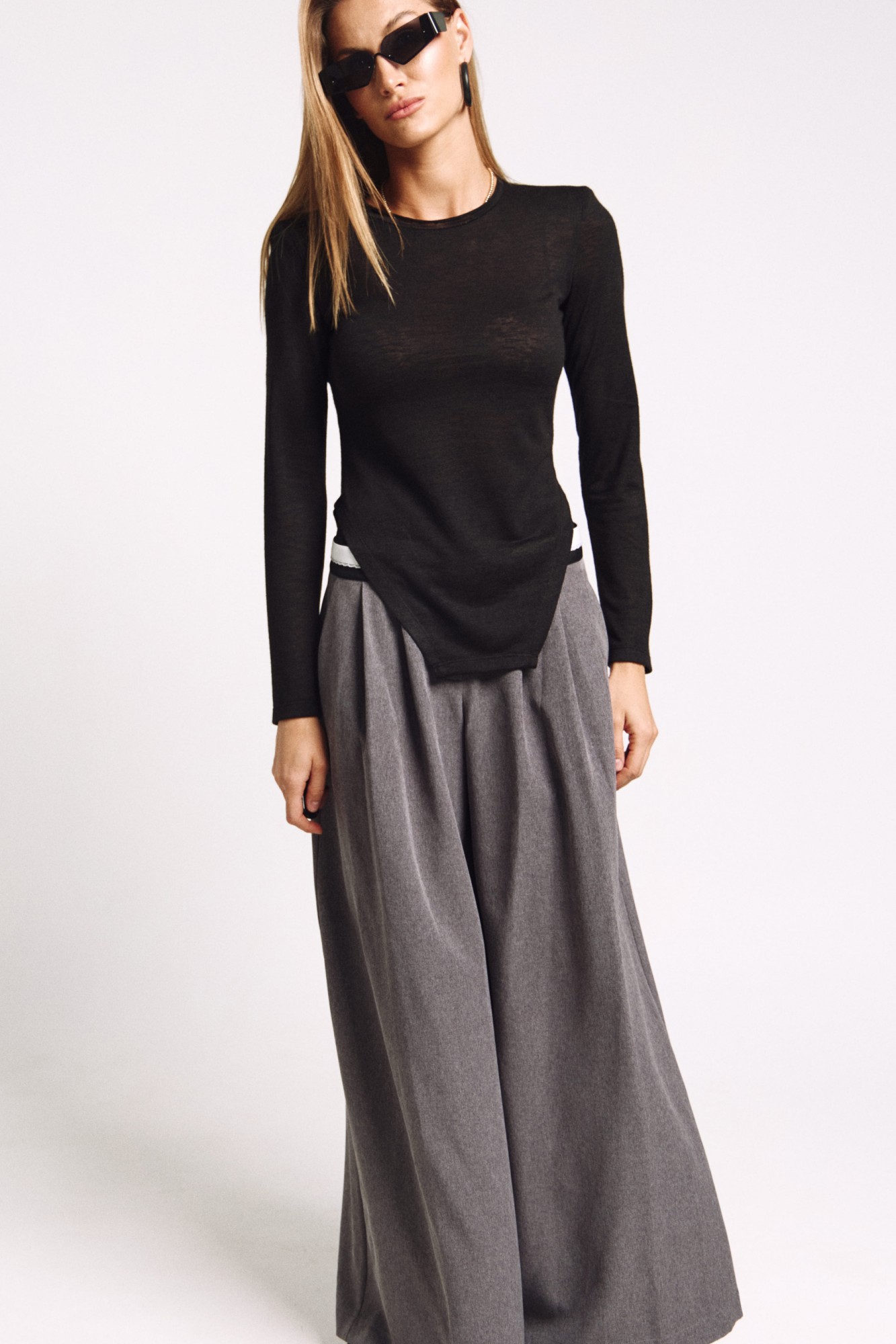 Брюки-"палаццо" из струящегося черного материала со складками по переду и декоративной лентой-поясом. Посадка - средняя. Карманы в боковых швах.