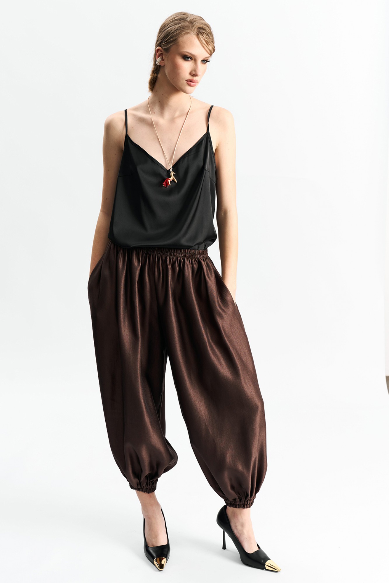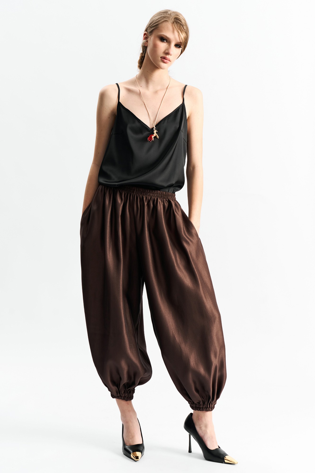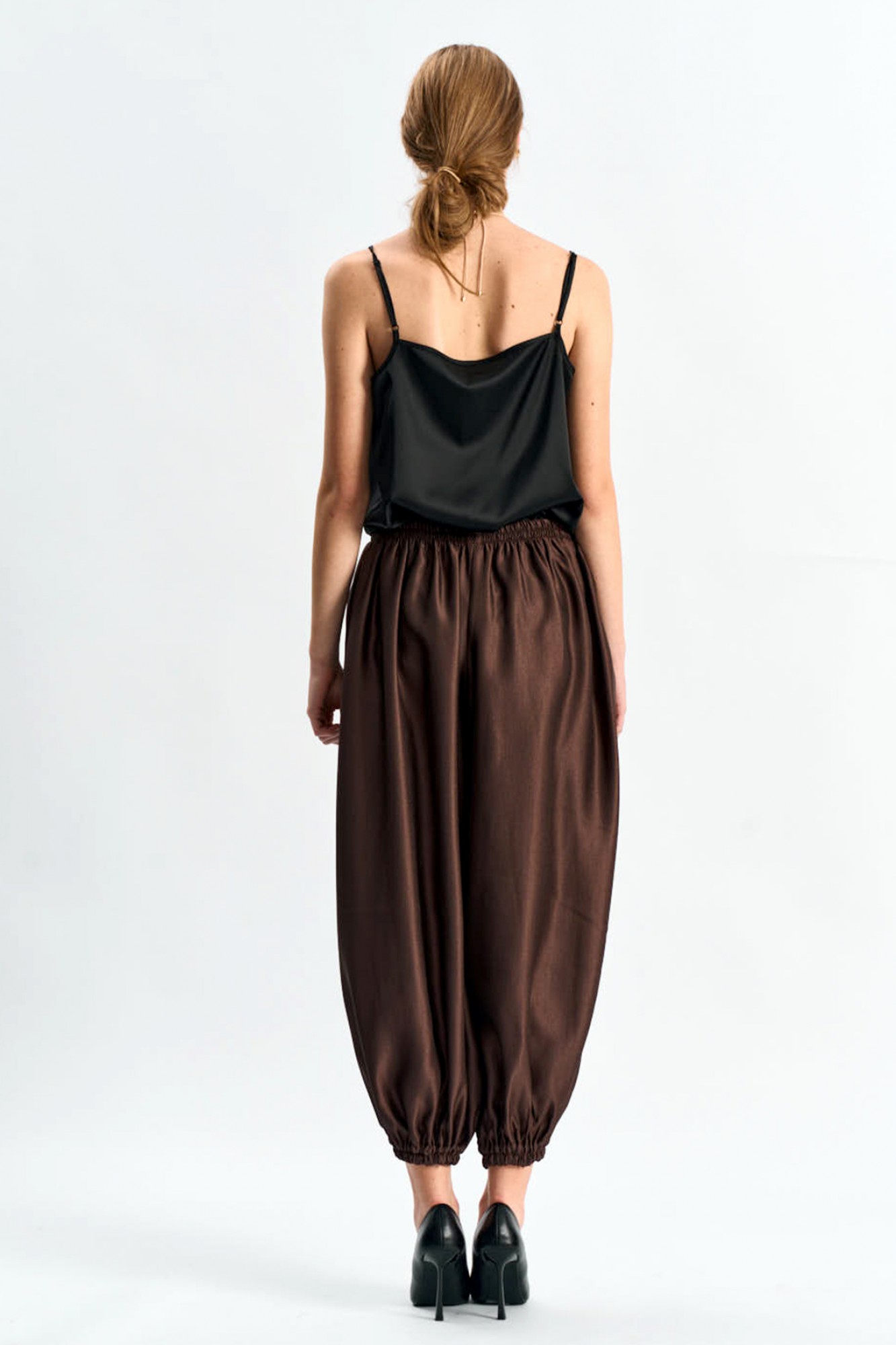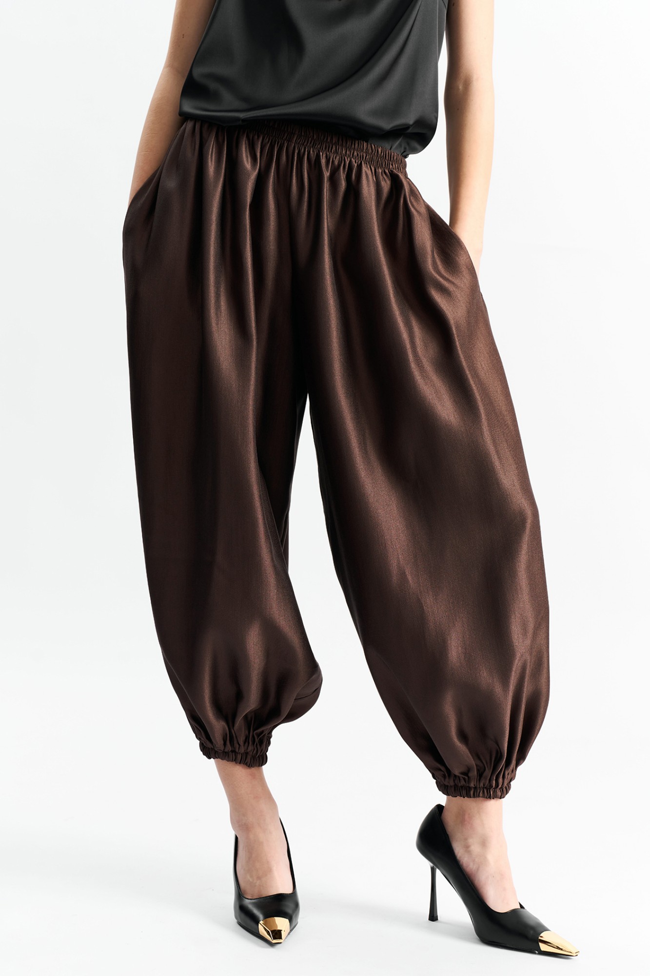 Брюки-"алладины", самый актуальный крой сезона. Пояс на резинке, низ брюк на резинке. Материал - смесовая вискоза с красивым изящным блеском.
