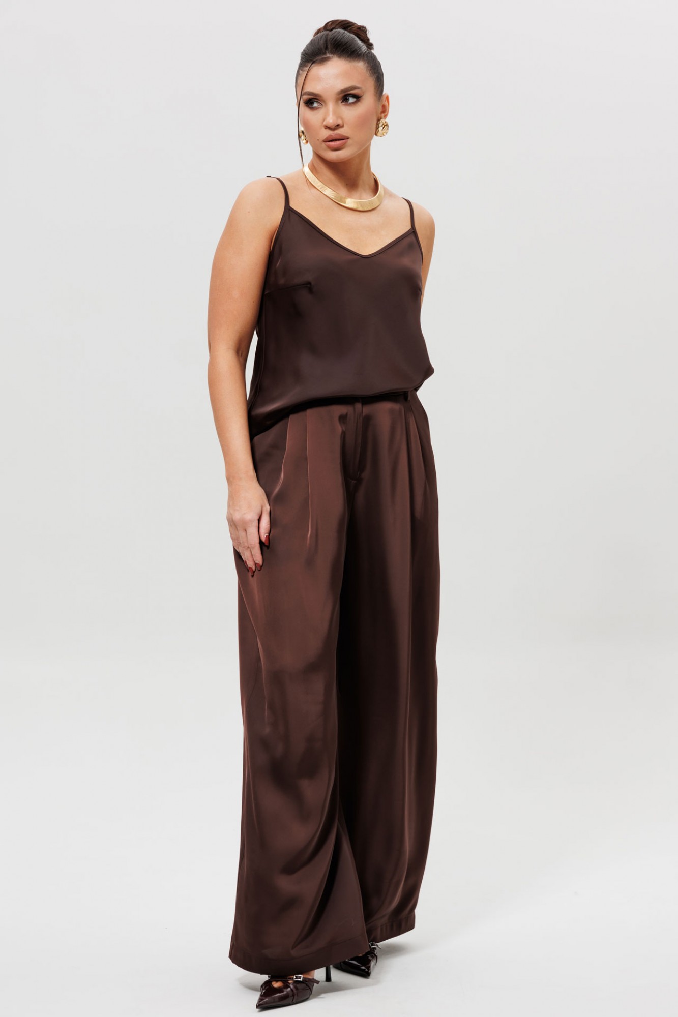 Брюки выполнены из атласной ткани, расширены к низу. На передних половинках брюк обработаны 2 складки и боковые карманы. На задних – талиевые вытачки. Застёжка на молнию и 2 потайных крючка. Эти атласные брюки (Арт. 1282) — Must Have для создания безупречного вечернего или праздничного образа. Модель представлена в двух богатых оттенках: насыщенном красном и глубоком шоколадном. Брюки выполнены из атласной ткани, которая мягко струится, подчеркивая изящество каждого движения. Универсальный крой позволяет сочетать их как с атласными топами (арт.1164) и блузами (например арт.1280) для выхода в свет, так и с кашемировыми джемперами для создания смарт-кэжуал образа. Атласные брюки с завышенной талией обеспечивают комфортную посадку и визуально вытягивают силуэт.