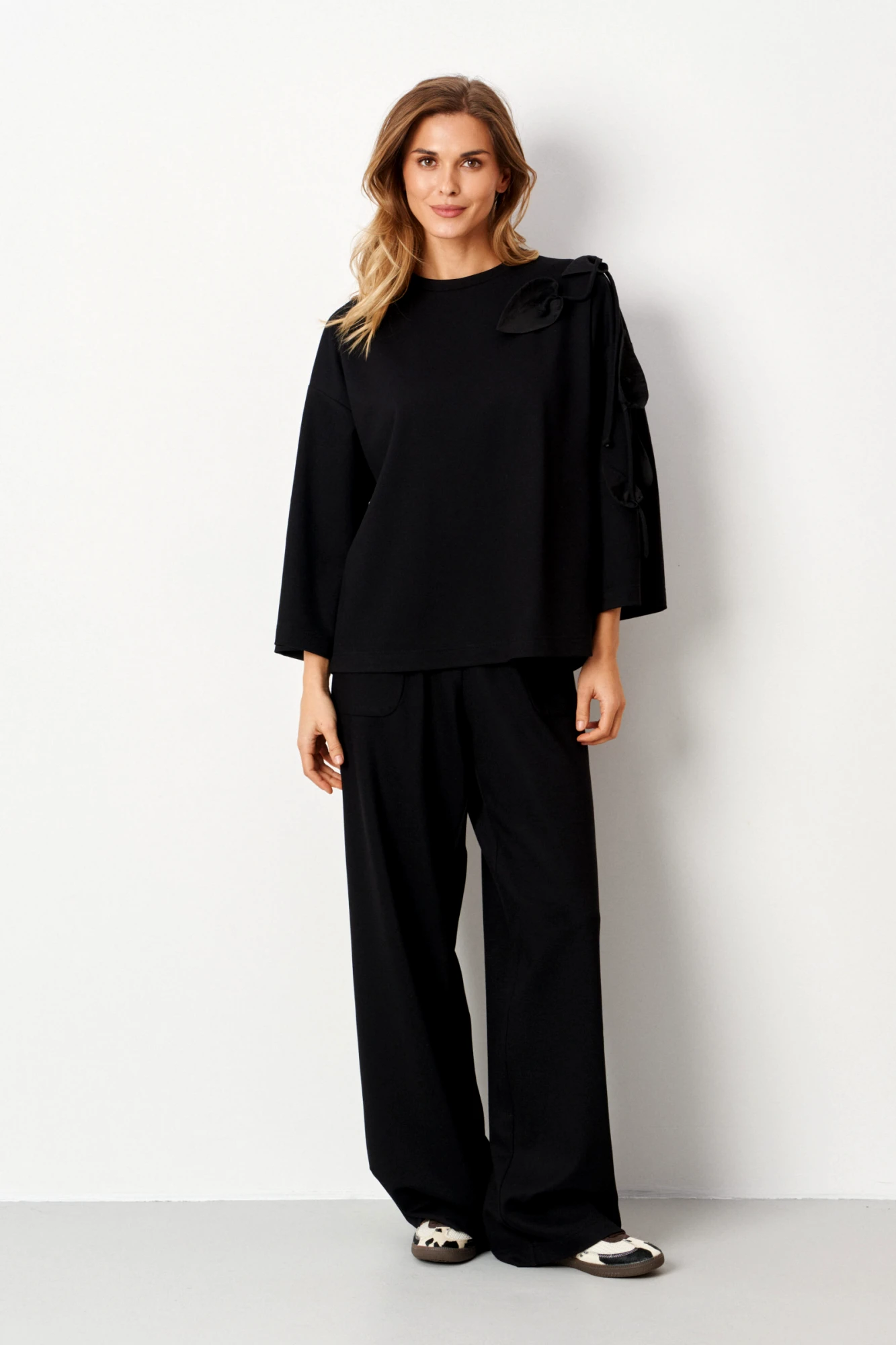 Эти женские брюки выполнены из мягкого трикотажного полотна с большим добавлением хлопка, что делает их приятными к телу, комфортными и способными хорошо сохранять свою форму даже при длительном ношении. Модель обладает классическим прямым покроем, который идеально подходит для повседневных и деловых образов, создавая элегантный и сдержанный стиль. Верхний срез брюк обработан притачным поясом с вставкой на резинке, что обеспечивает надежную и легкую посадку, а также дополнительный комфорт при движении. Передняя часть украшена накладными карманами с подкройным бочкам, придающими образу функциональность и стильный акцент. Брюки выполнены в универсальном черном оттенке, что позволяет легко сочетать их с различными топами, обувью и аксессуарами, создавая разнообразные образцы для работы, прогулок или повседневных встреч.