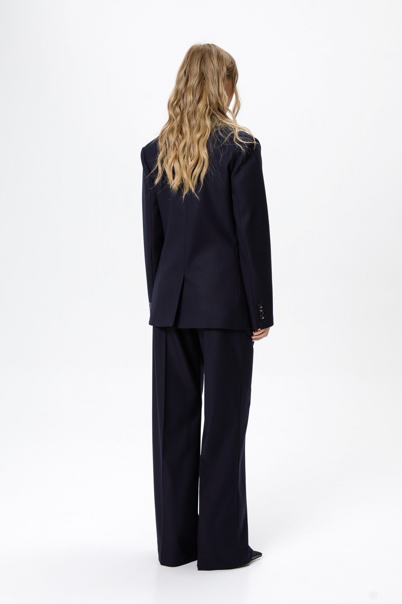 Широкие прямые брюки со стрелками. Детали: брюки с притачным поясом со шлевками, передние половины с небольшими застроченными мягкими складками и заутюженными стрелками, застежка на молнию и пуговицу, боковые карманы. Задние части брюк с вытачками и заутюженными стрелками. Пояс брюк прямой, без резинки.