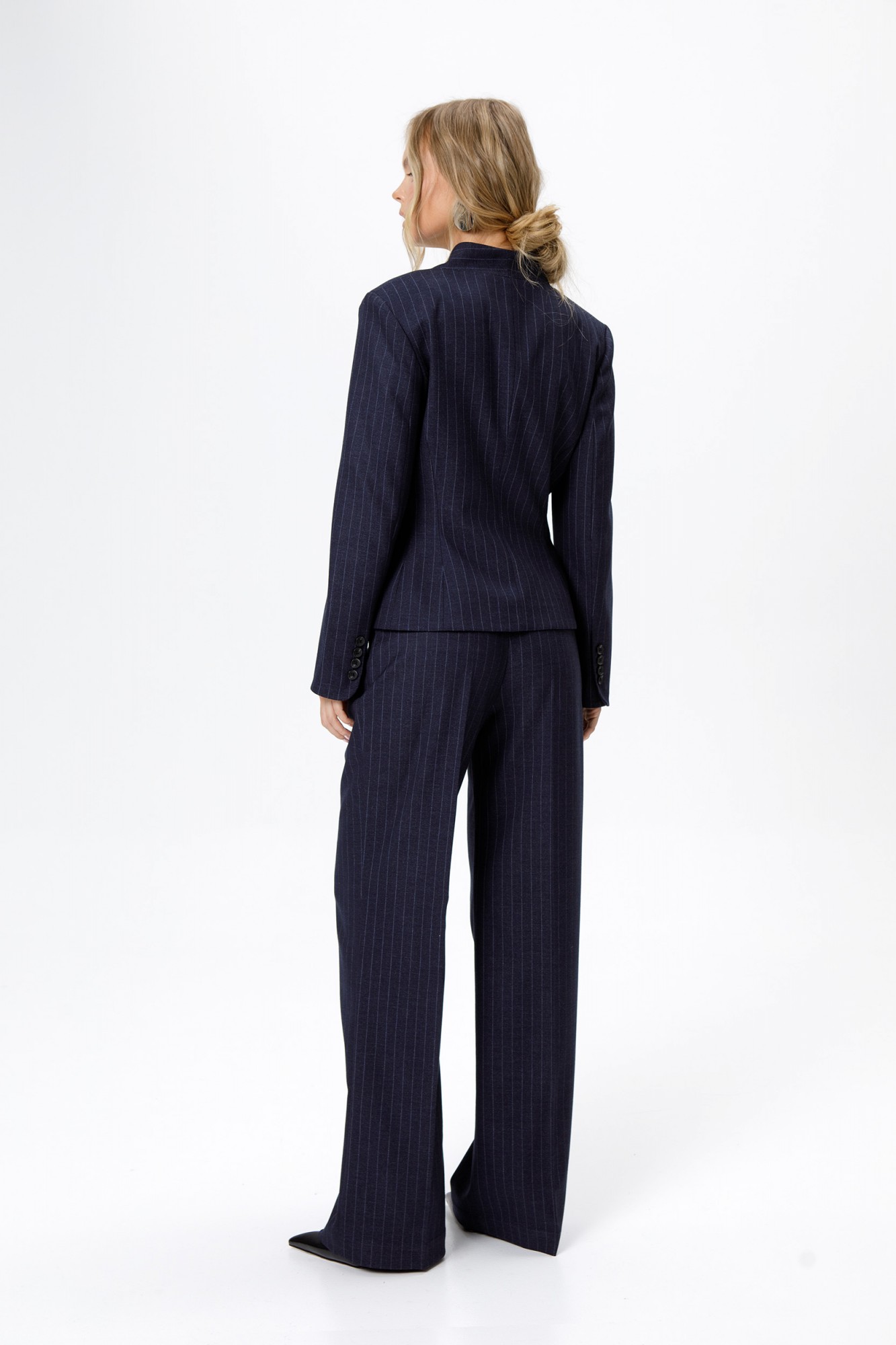 Широкие прямые брюки с полоску. Детали: брюки с притачным поясом со шлевками, передние половины с небольшими застроченными мягкими складками и заутюженными стрелками, застежка на молнию и пуговицу, боковые карманы. Задние части брюк с вытачками и заутюженными стрелками. Пояс брюк прямой, без резинки.