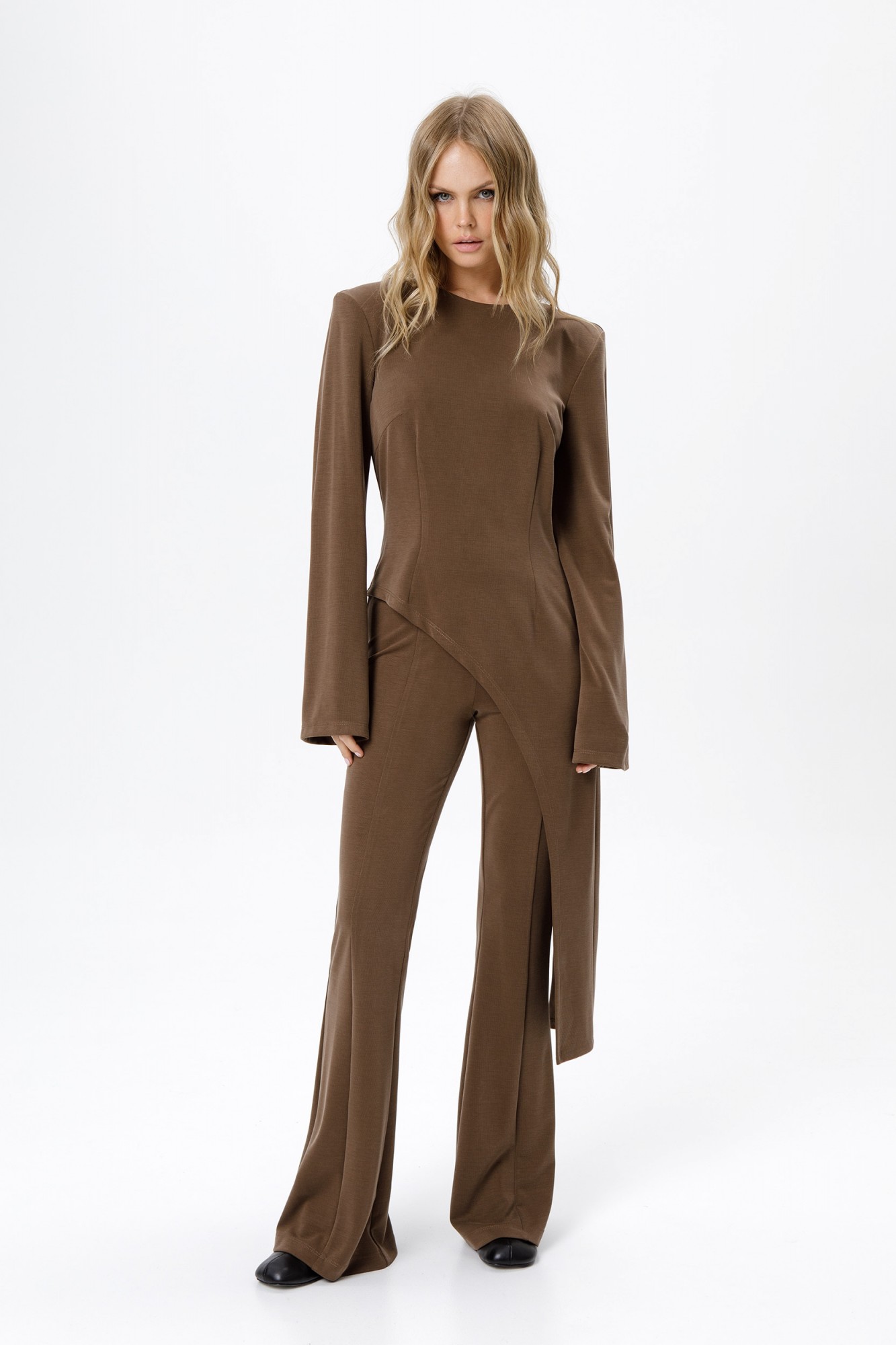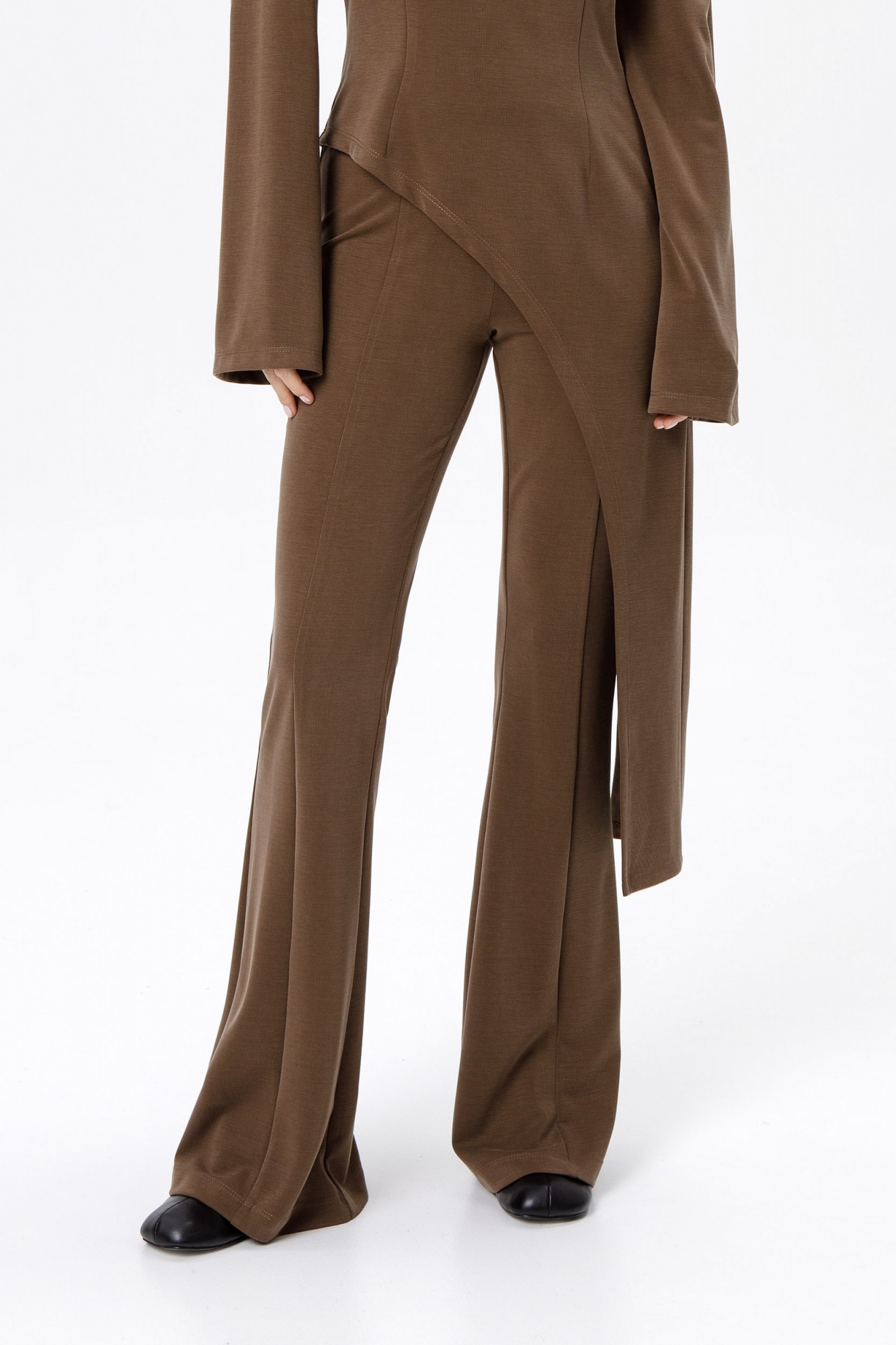 Трикотажные облегающие брюки-клеш.