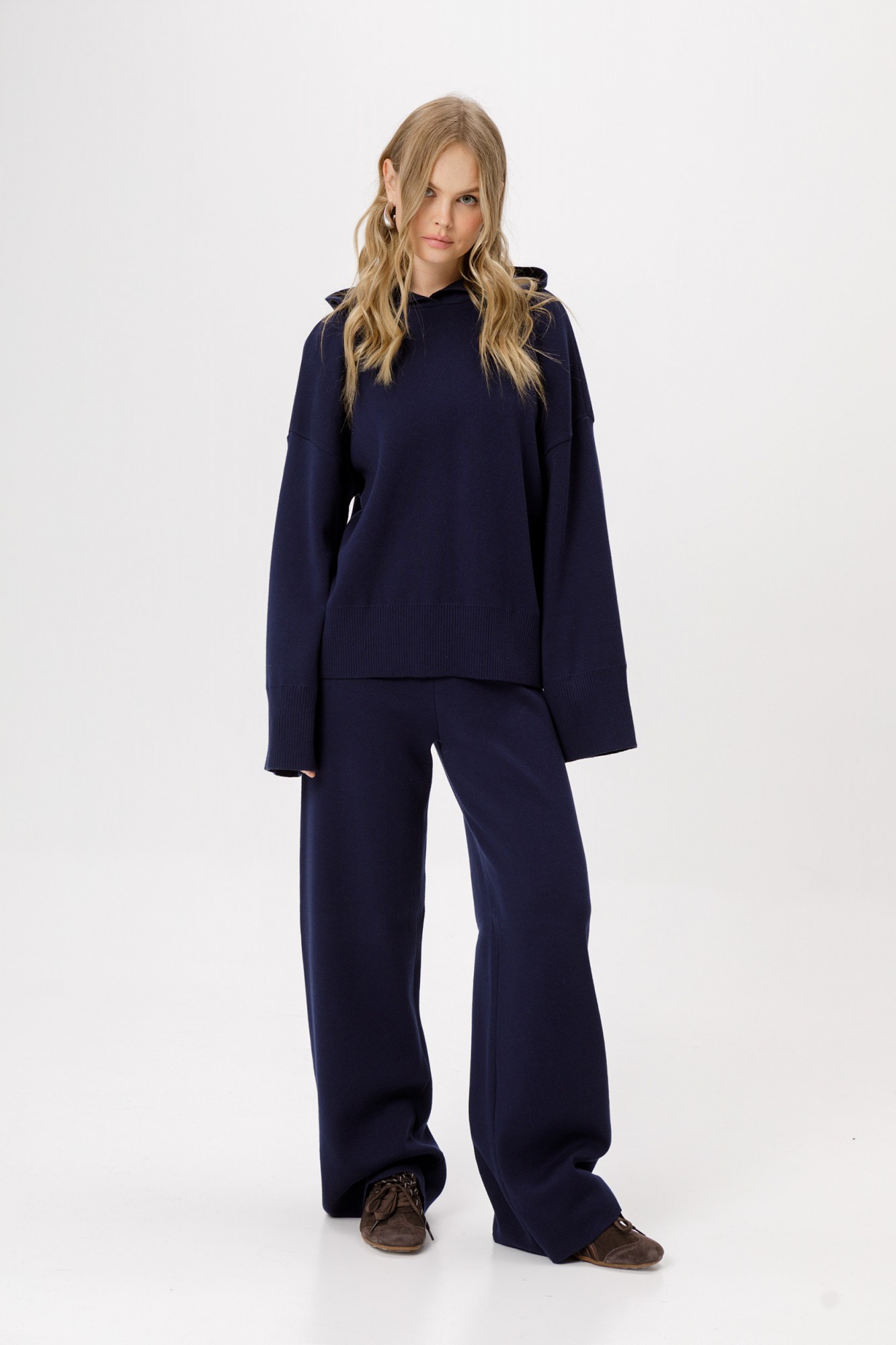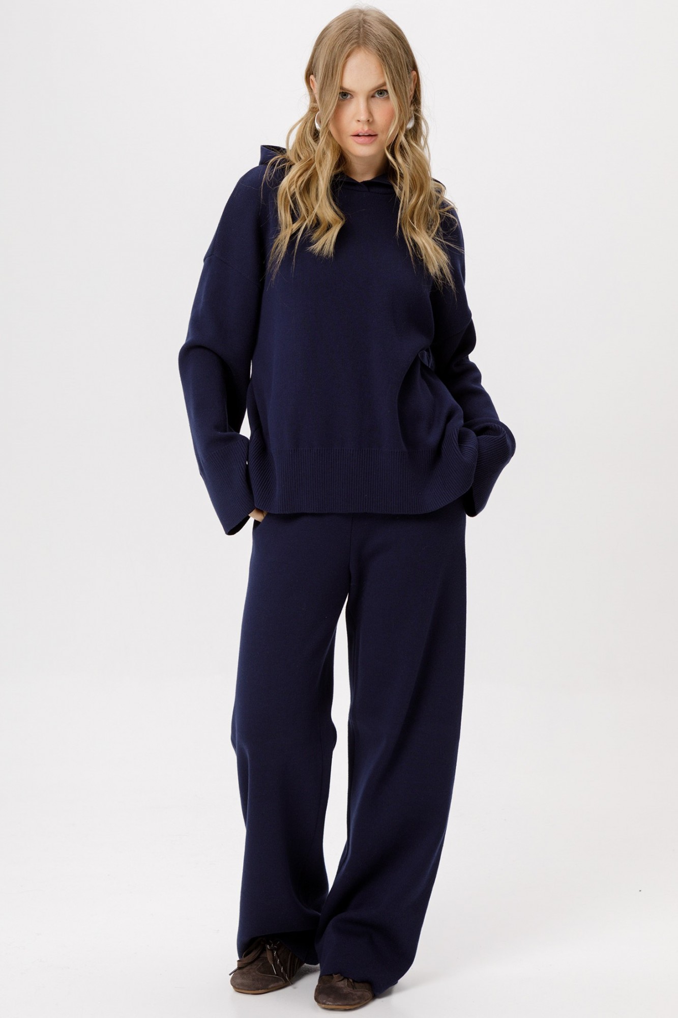 Вязаные прямые широкие брюки из хлопковой пряжи. Детали: высокая посадка, пояс с резинкой, без карманов.
