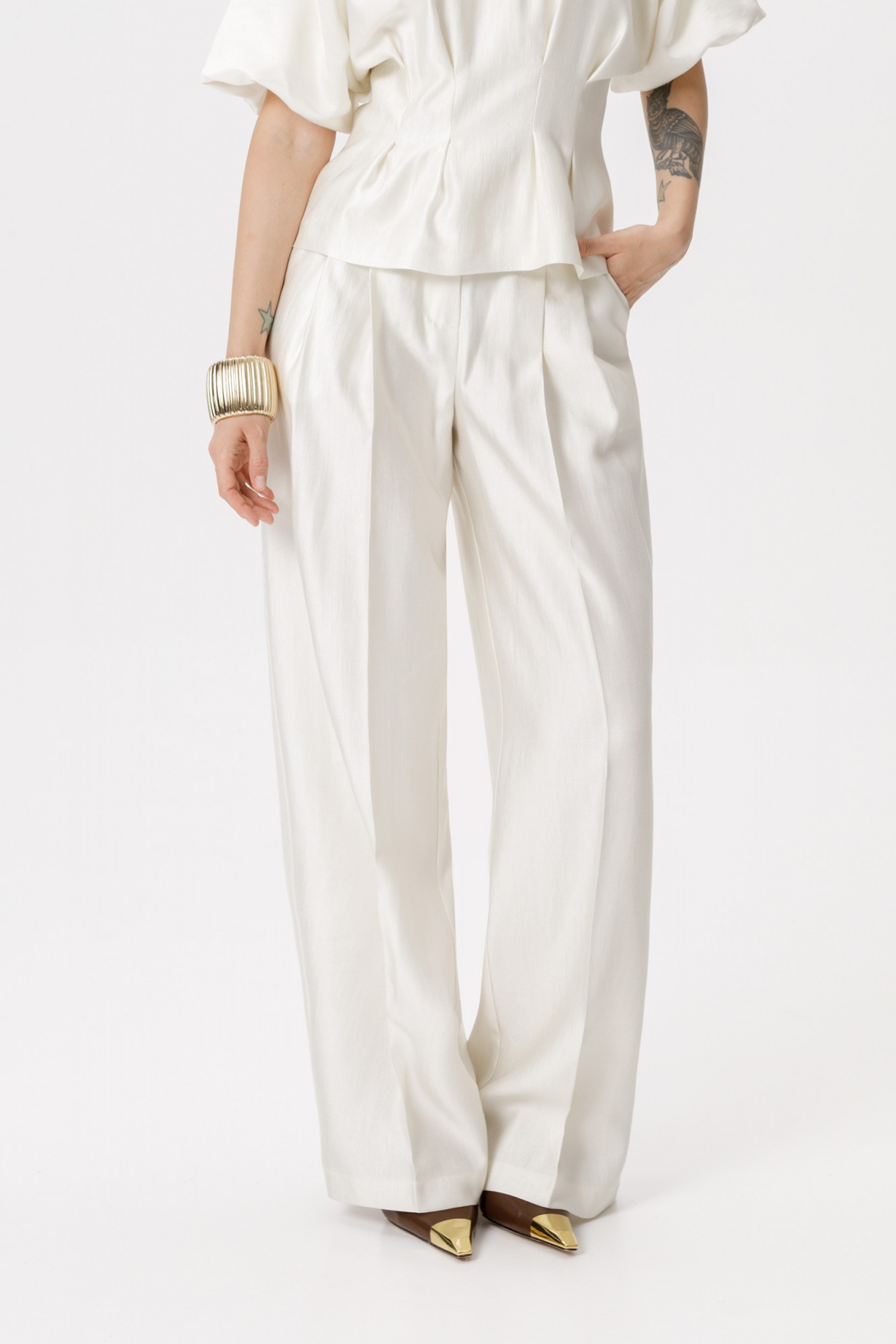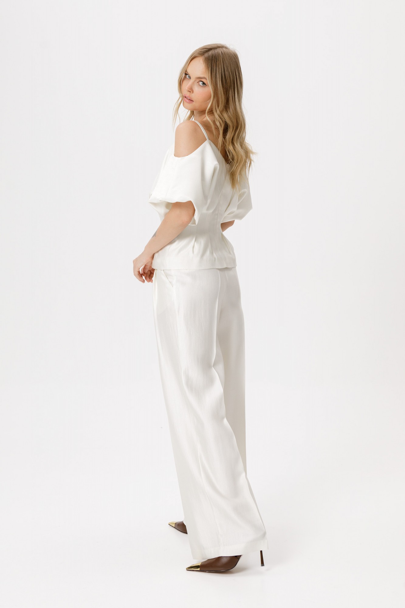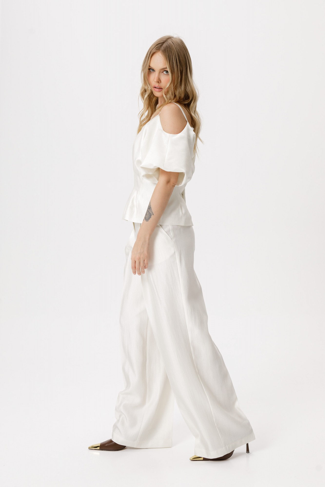 Широкие брюки-палаццо со стрелками. Детали: брюки с притачным поясом со шлевками, складки у пояса, застежка на молнию и пуговицу, боковые карманы, заутюженные стрелки. Задние части брюк с вытачками и имитацией карманов.