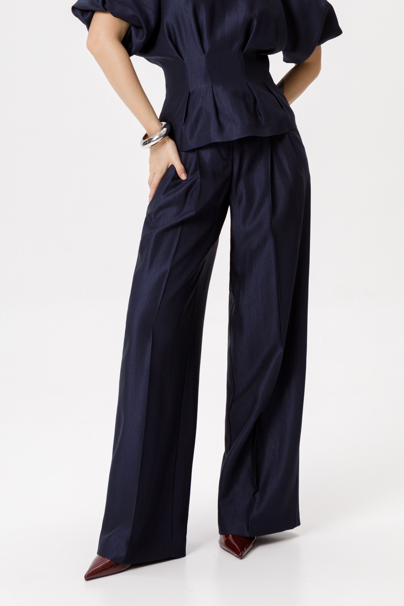 Широкие брюки-палаццо со стрелками. Детали: брюки с притачным поясом со шлевками, складки у пояса, застежка на молнию и пуговицу, боковые карманы, заутюженные стрелки. Задние части брюк с вытачками и имитацией карманов.
