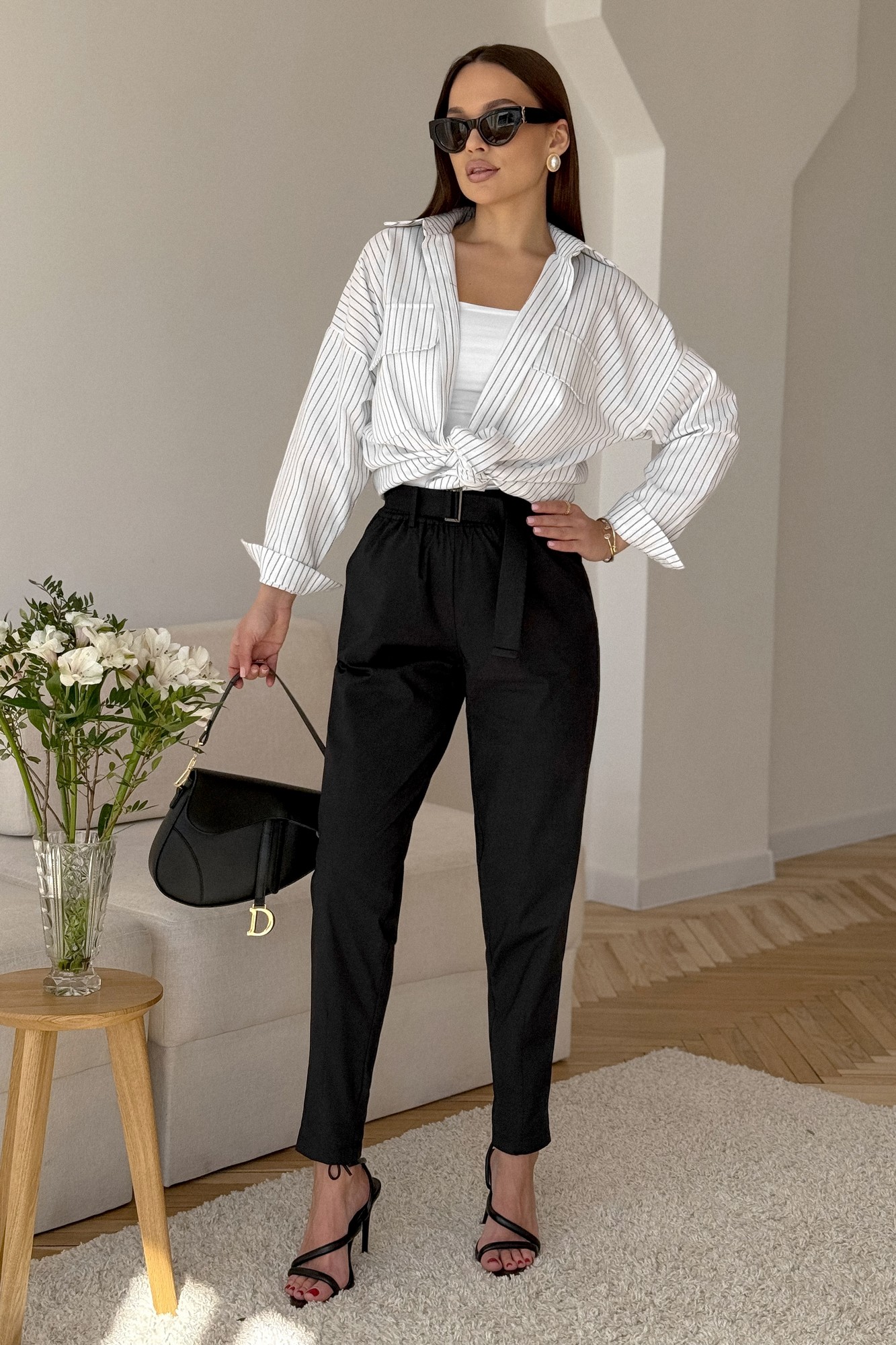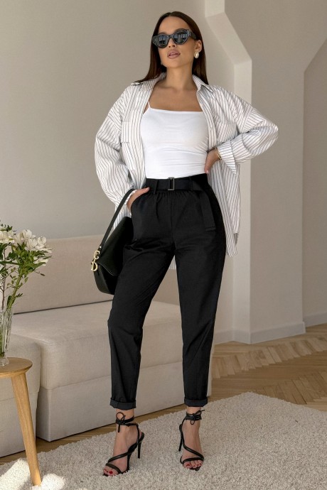 Брюки женские из текстильной ткани, слегка заужены к низу. В боковых швах расположены карманы. По низу передних половинок есть защип. Задняя половинка брюк с отрезной кокеткой и накладными карманами. Вверх брюк обработан поясом с резинкой (без молнии). ПОЯС ВХОДИТ В КОМПЛЕКТ.