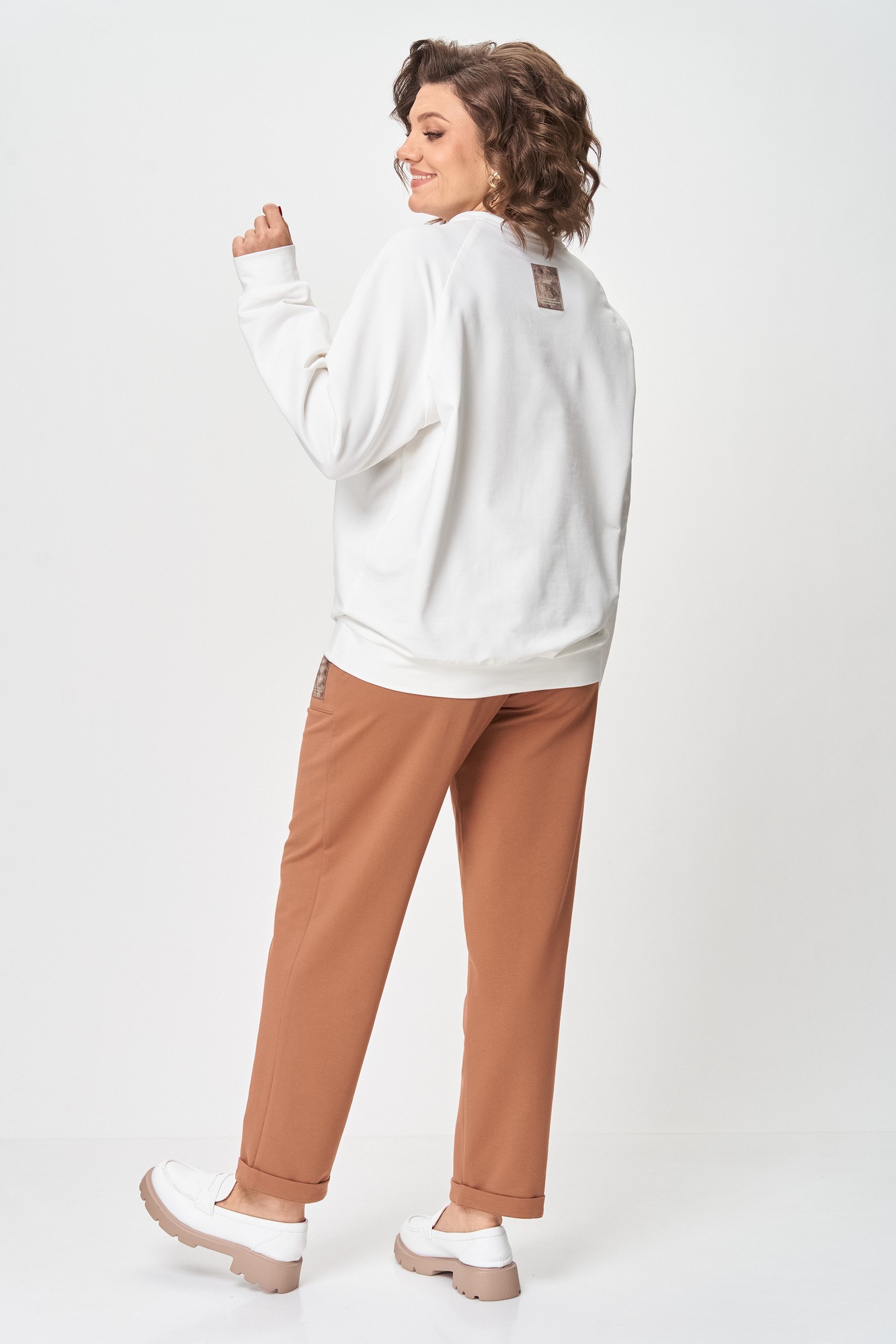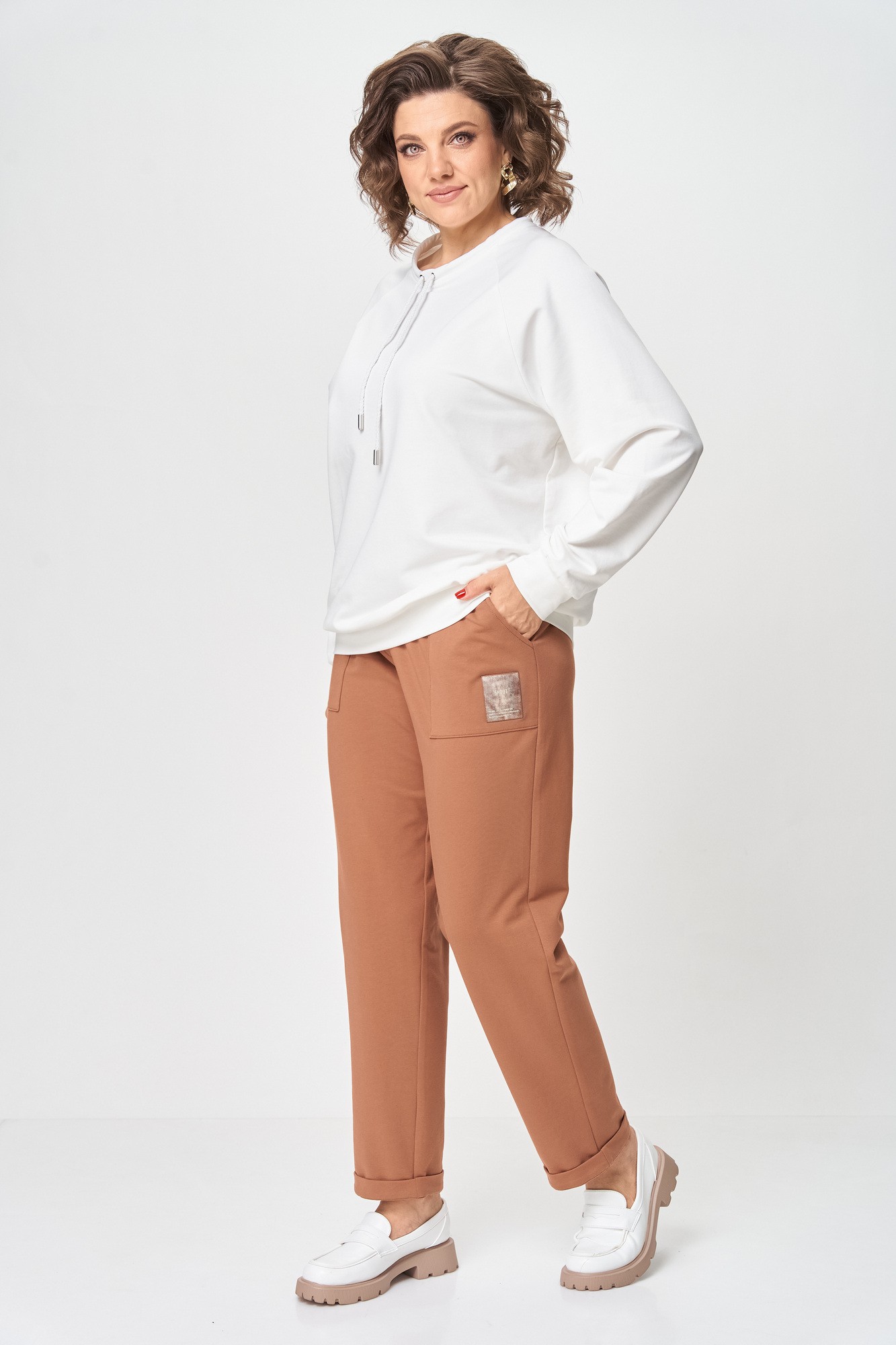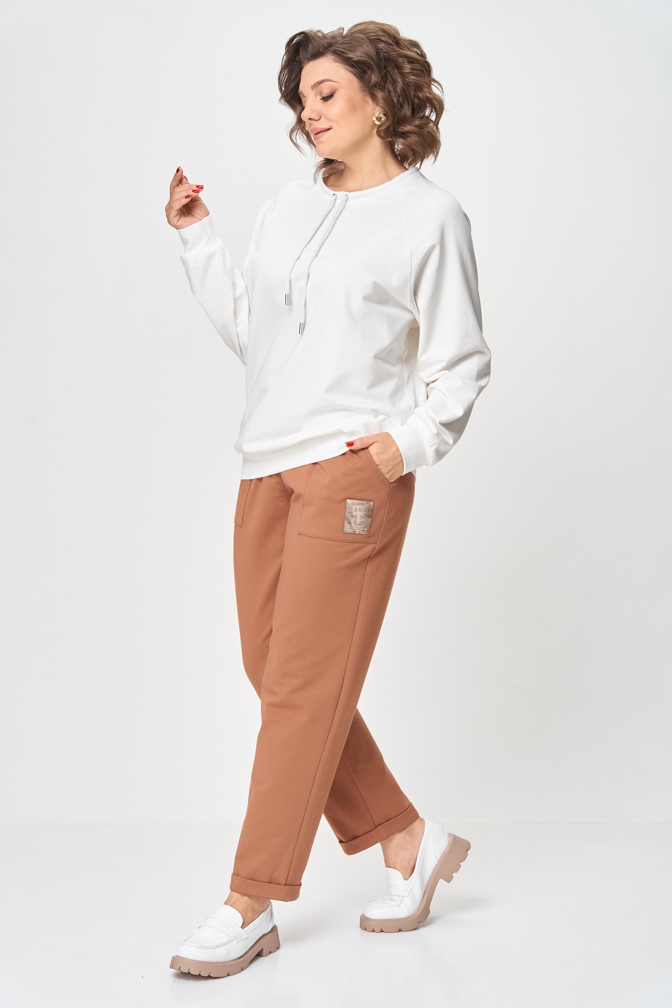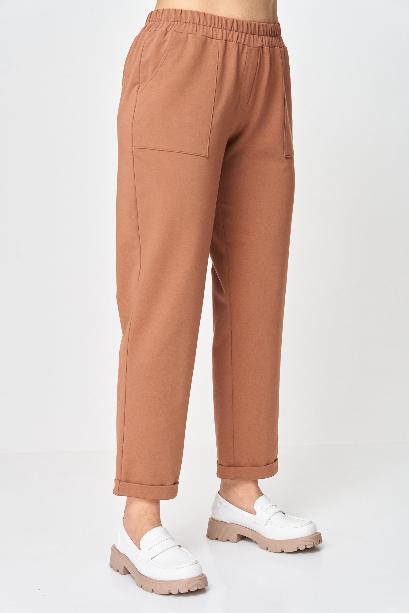 Брюки женские из трикотажной ткани (двунитка), слегка заужены к низу. По переду брюк расположены накладные карманы. На левом кармане настрочной декоративный элемент. В пояс вставлена резинка по кругу.