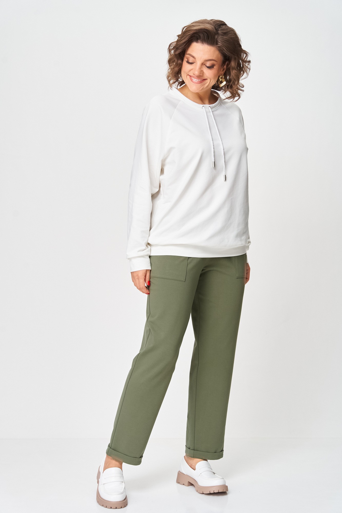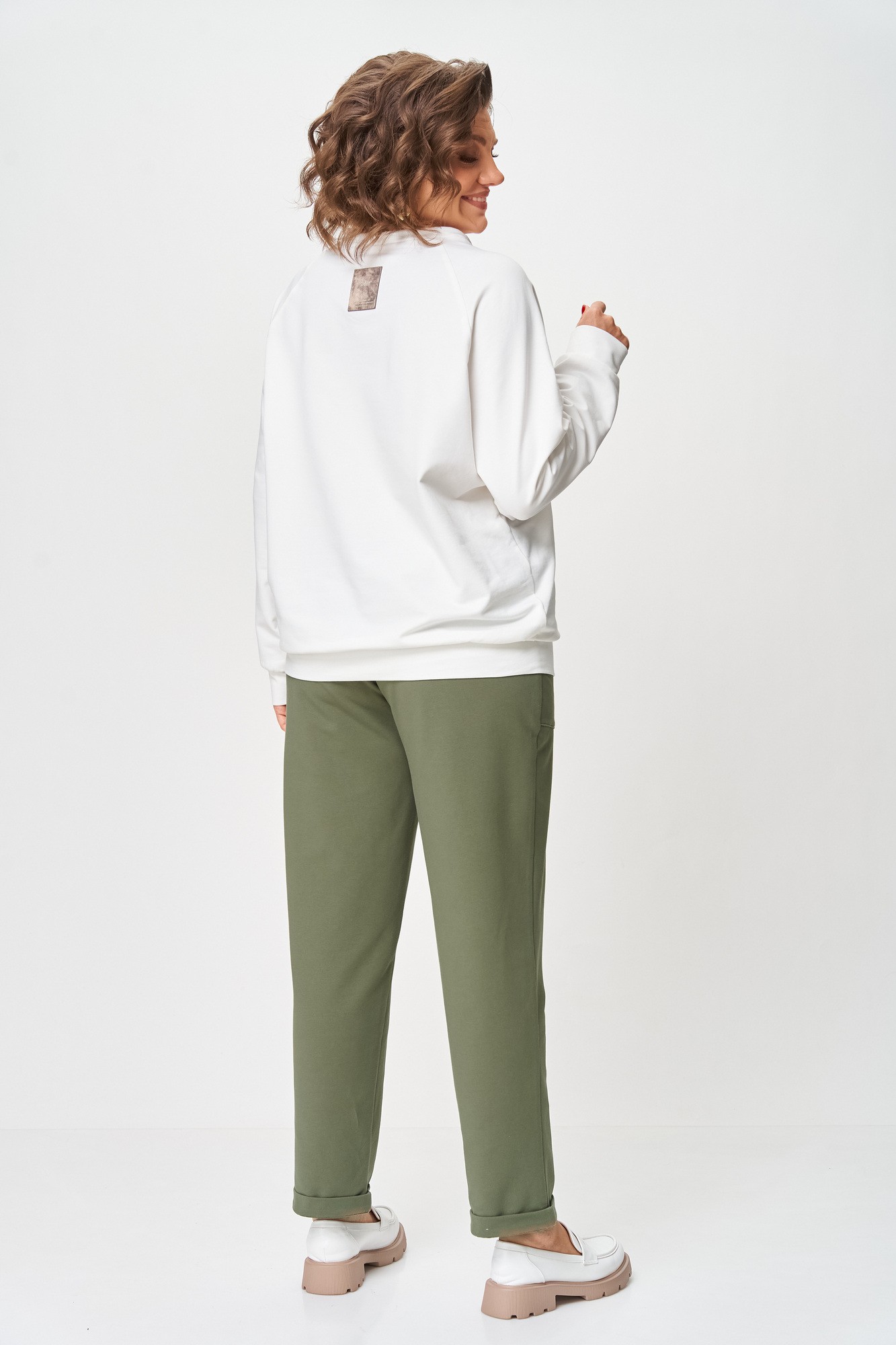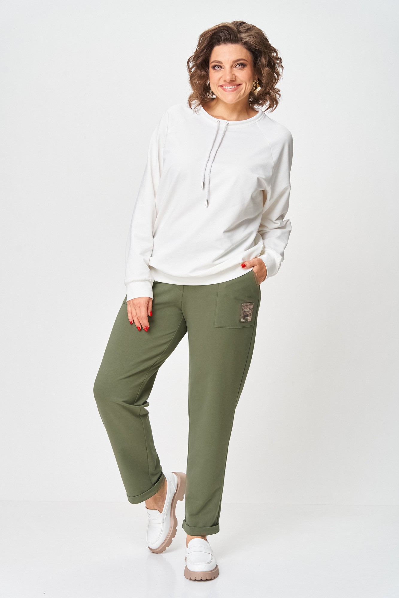Брюки женские из трикотажной ткани (двунитка), слегка заужены к низу. По переду брюк расположены накладные карманы. На левом кармане настрочной декоративный элемент. В пояс вставлена резинка по кругу.