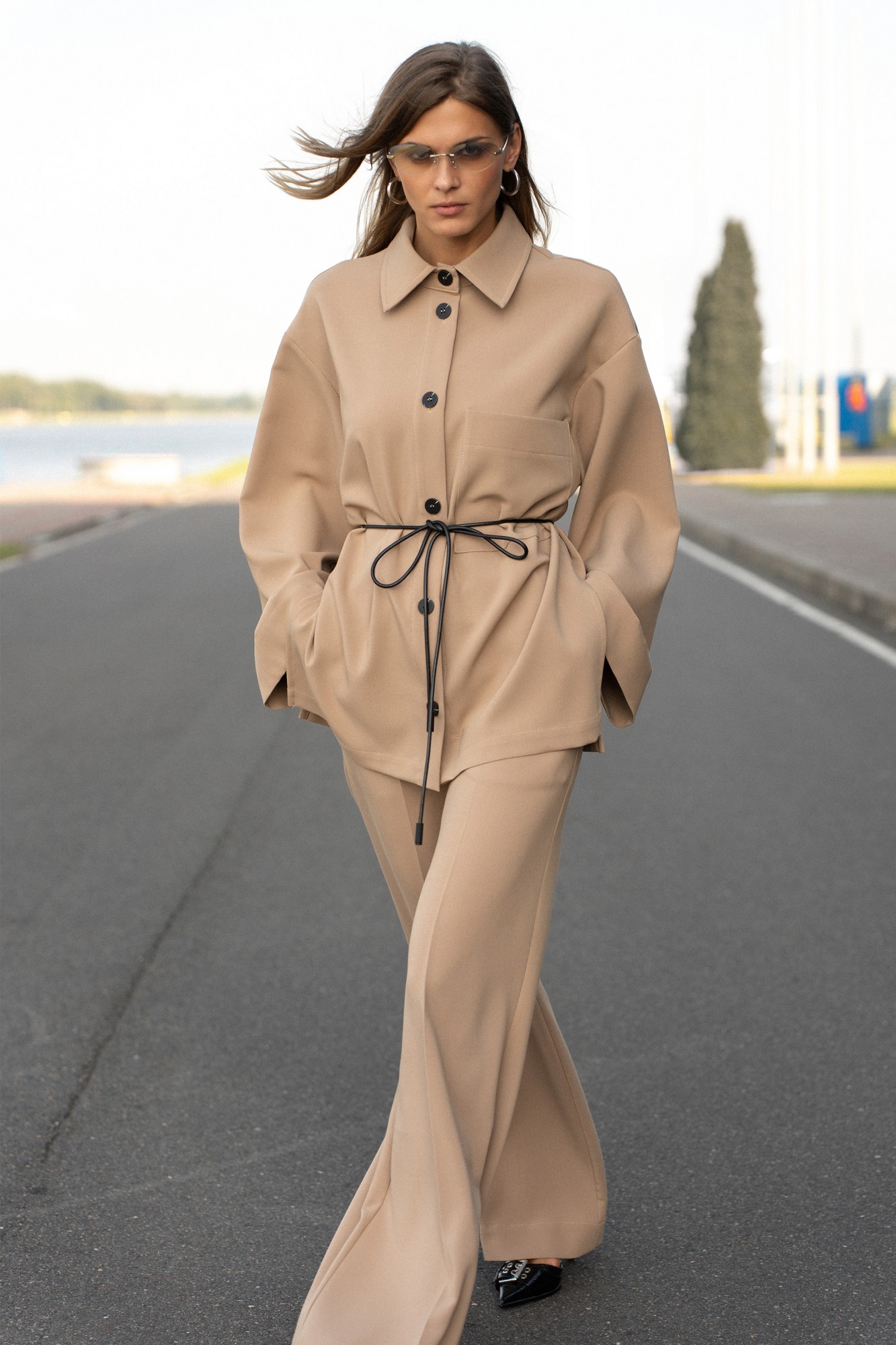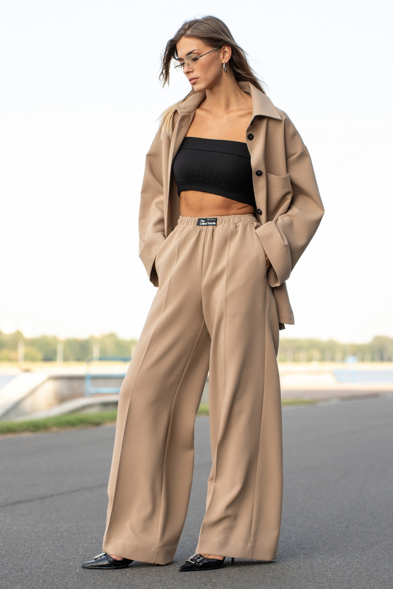 Брюки в цвете "Camel" прямого свободного силуэта. Пояс на резинке, по переду боковые наклонные карманы. На поясе декор в виде нашивки с лого.