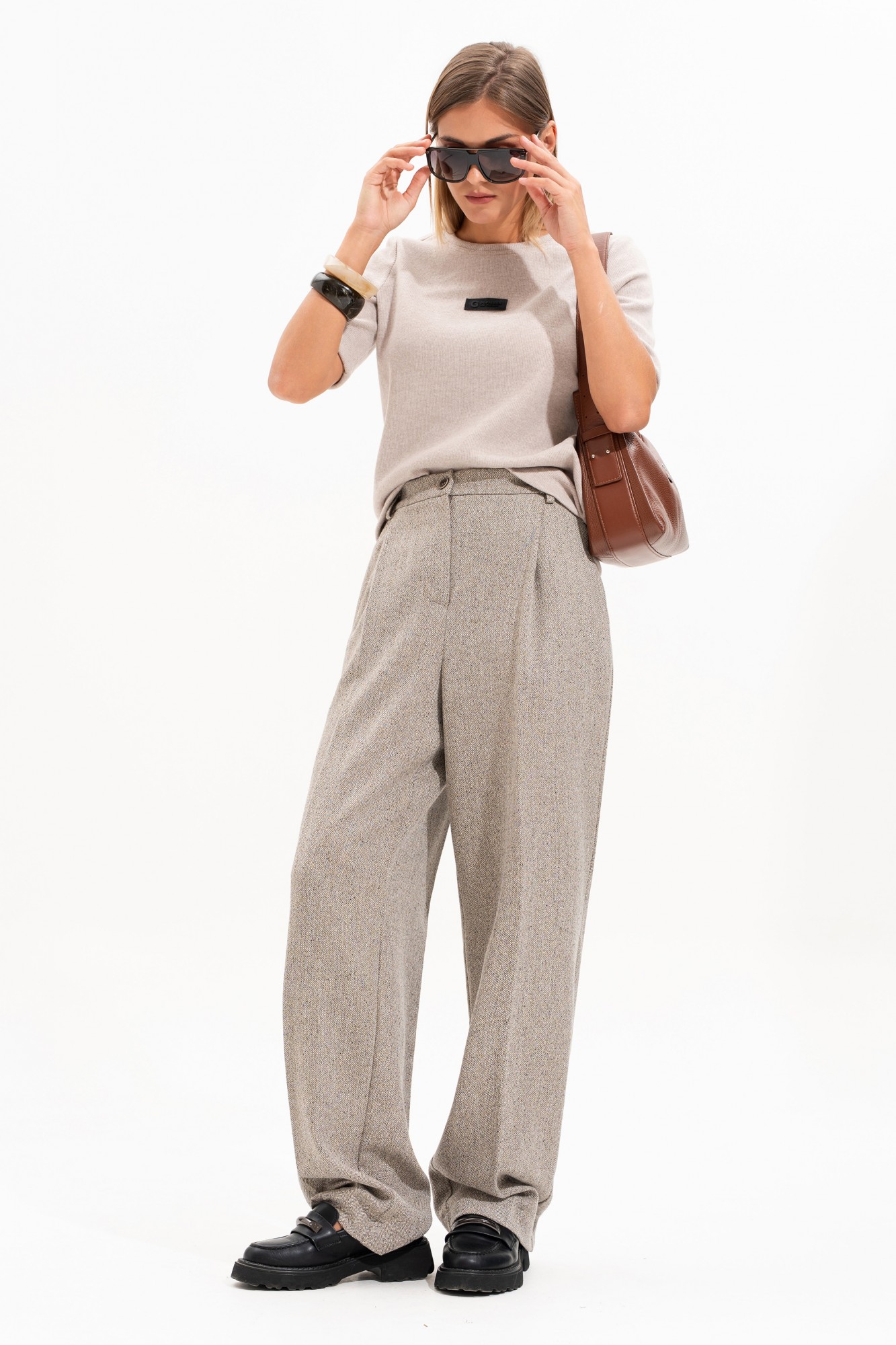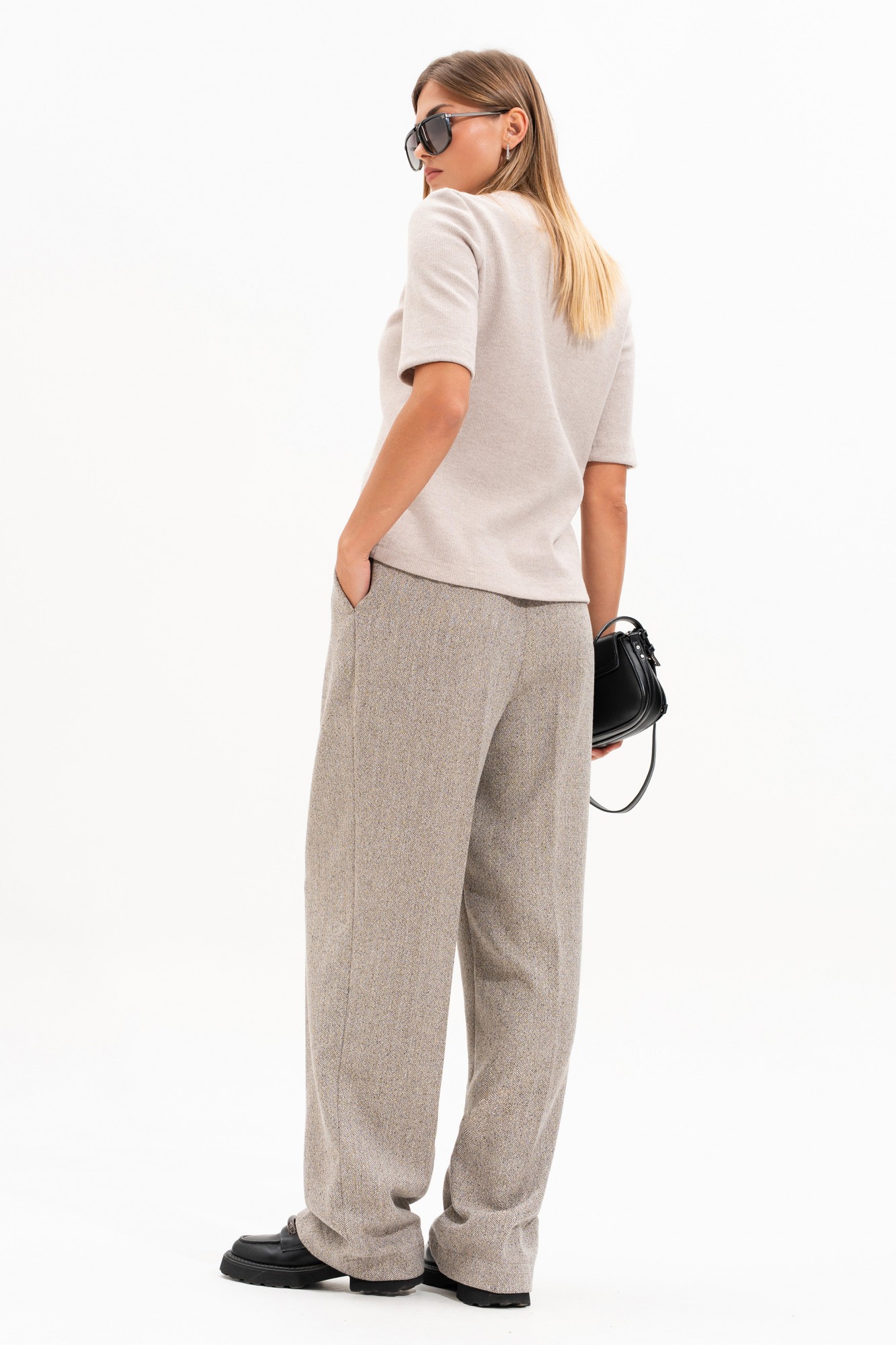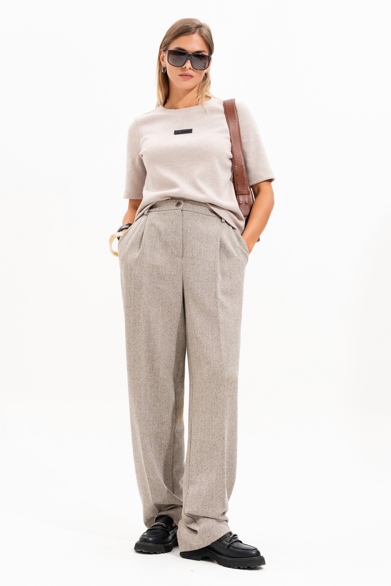 Брюки актуального силуэта, свободные, прямые к низу. На передних половинках заутюжены стрелки, переходящие в складку по линии талии. Застежка-гульфик, по переду боковые наклонные карманы. Пояс стабильный по переду, по задней части брюк на резинке, с настроченными шлевками и застежкой на пуговичку.