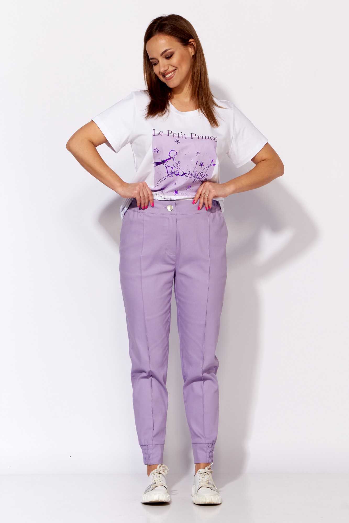 Брюки- джогеры женские. По центру передних деталей застрочены вертикальные защипы. По бокам наклонные карманы. Застежка спереди на " молнию" под гульфик. Сзади имитация карманов "листочка" . Пояс притачной , частично с широкой, простроченой резинкой. Застежка пояса, спереди на петлю и пуговицу. Низ брюк оформлен широкой манжетой. Боковая часть манжеты присобрана на несколько рядов резинки.