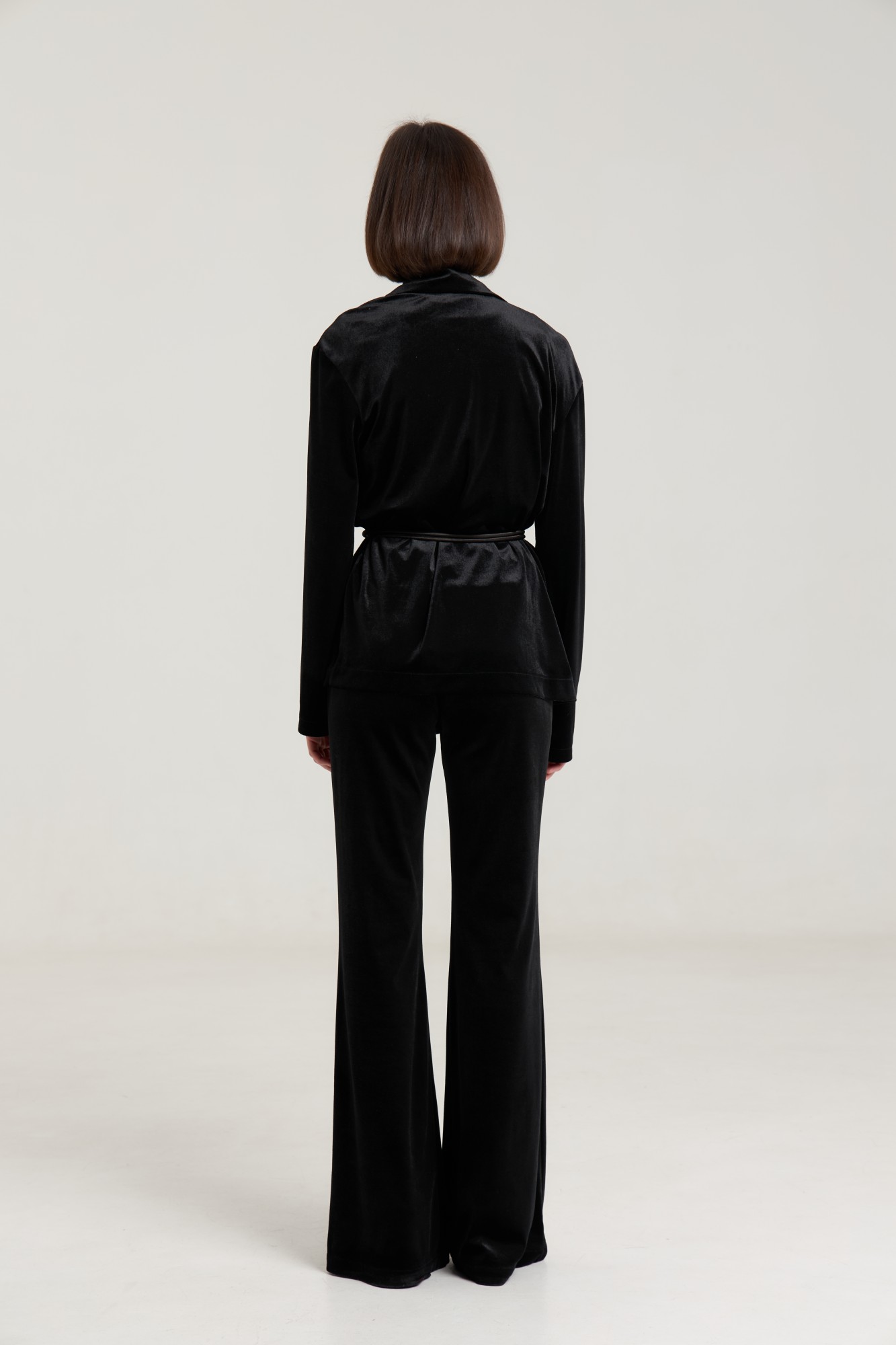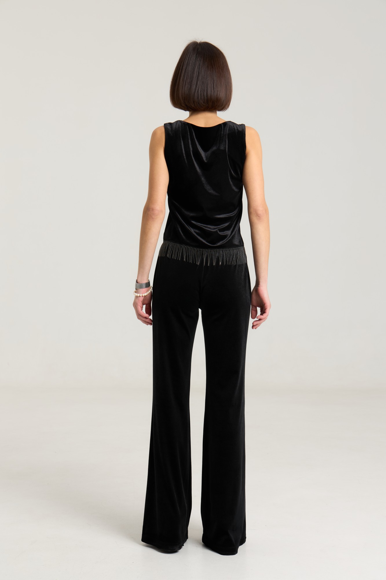 Брюки расклешенные свободного кроя из велюровой ткани - это не только модель для праздника. Данную модель можно сочетать с рубашкой, блузкой, жакетом из бархата арт. 2474 , топом арт. 2468 дополнить образ различными аксессуарами, обувью на плоской подошве, обувью на шпильке ,также подойдут кеды или кроссовки для более повседневных образов в сочетании с футболкой и кожаной курткой. Талия высокая, брюки на резинке.