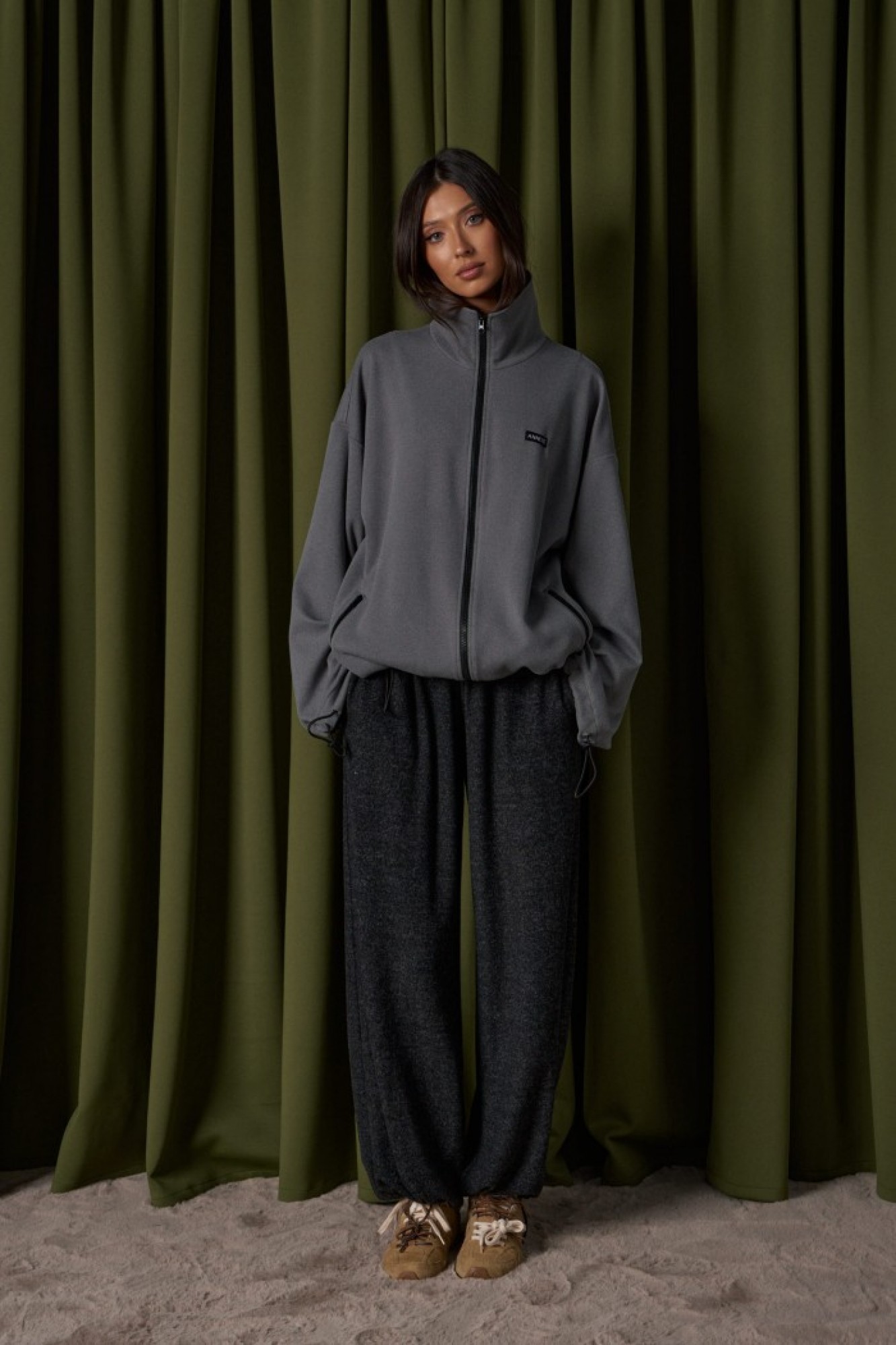 Джемпер прямого силуэта, выполнен из трикотажного полотна серого цвета. Характеристики: горловина круглая, воротник стойка черного цвета, рукав втачной, спущен, по низу рукава кулиса с втянутым шнуром-резинкой, регулируемой фиксаторами, прорезные карманы на молниях, спереди брендированная нашивка. Застежка центральная на молнию. По низу изделия кулиса с втянутым шнуром-резинкой, регулируемой фиксаторами.