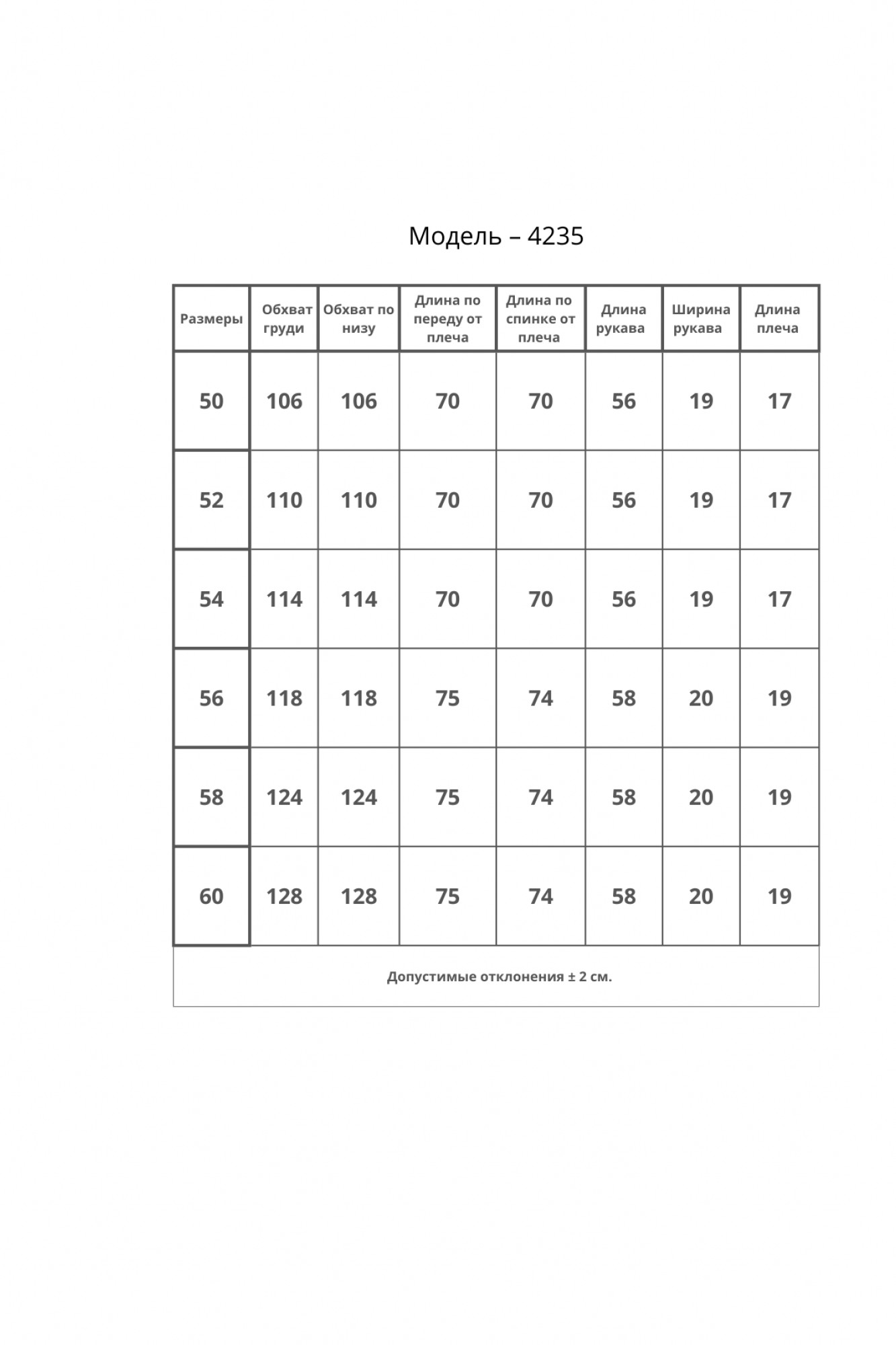 Таблица размеров