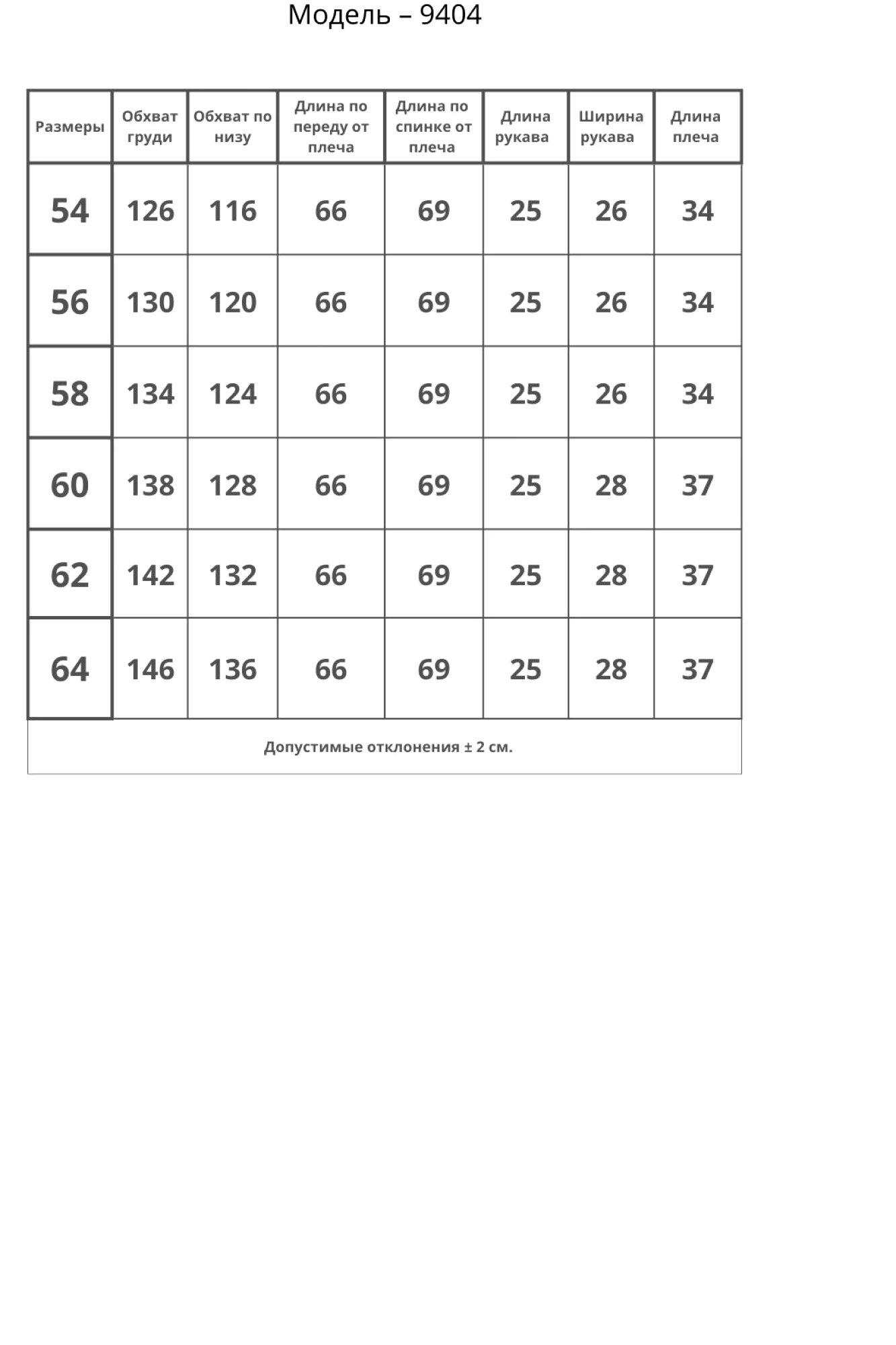 Таблица размеров