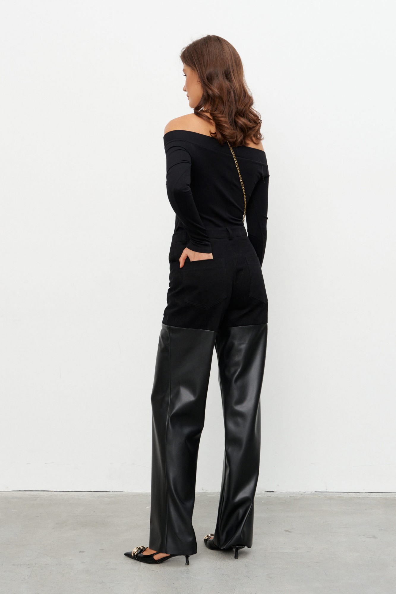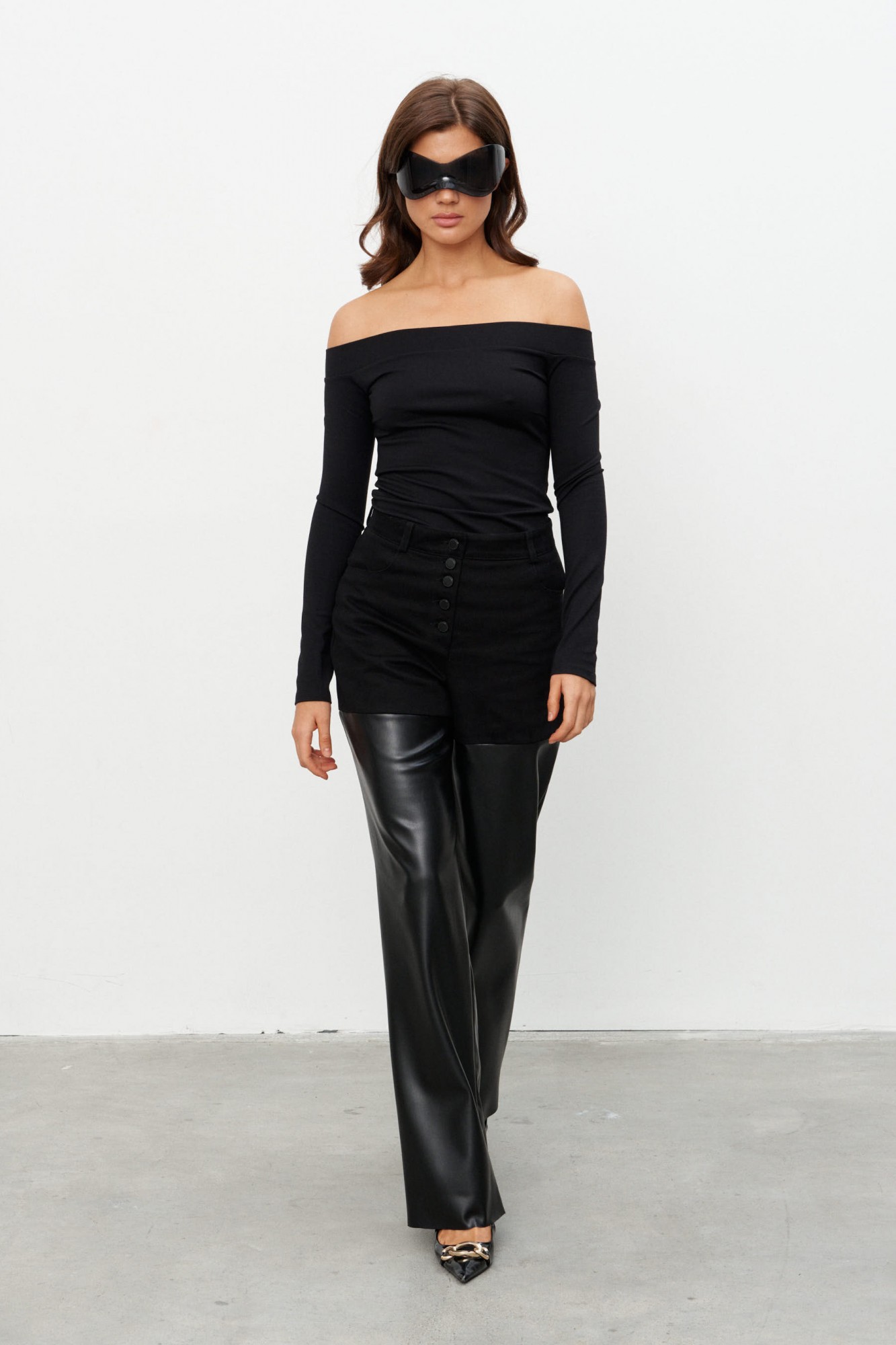 Джемпер из трикотажного полотна прилегающего силуэта с открытыми плечами. Отрезная деталь по верху изделия плотно фиксирует изделие на фигуре.