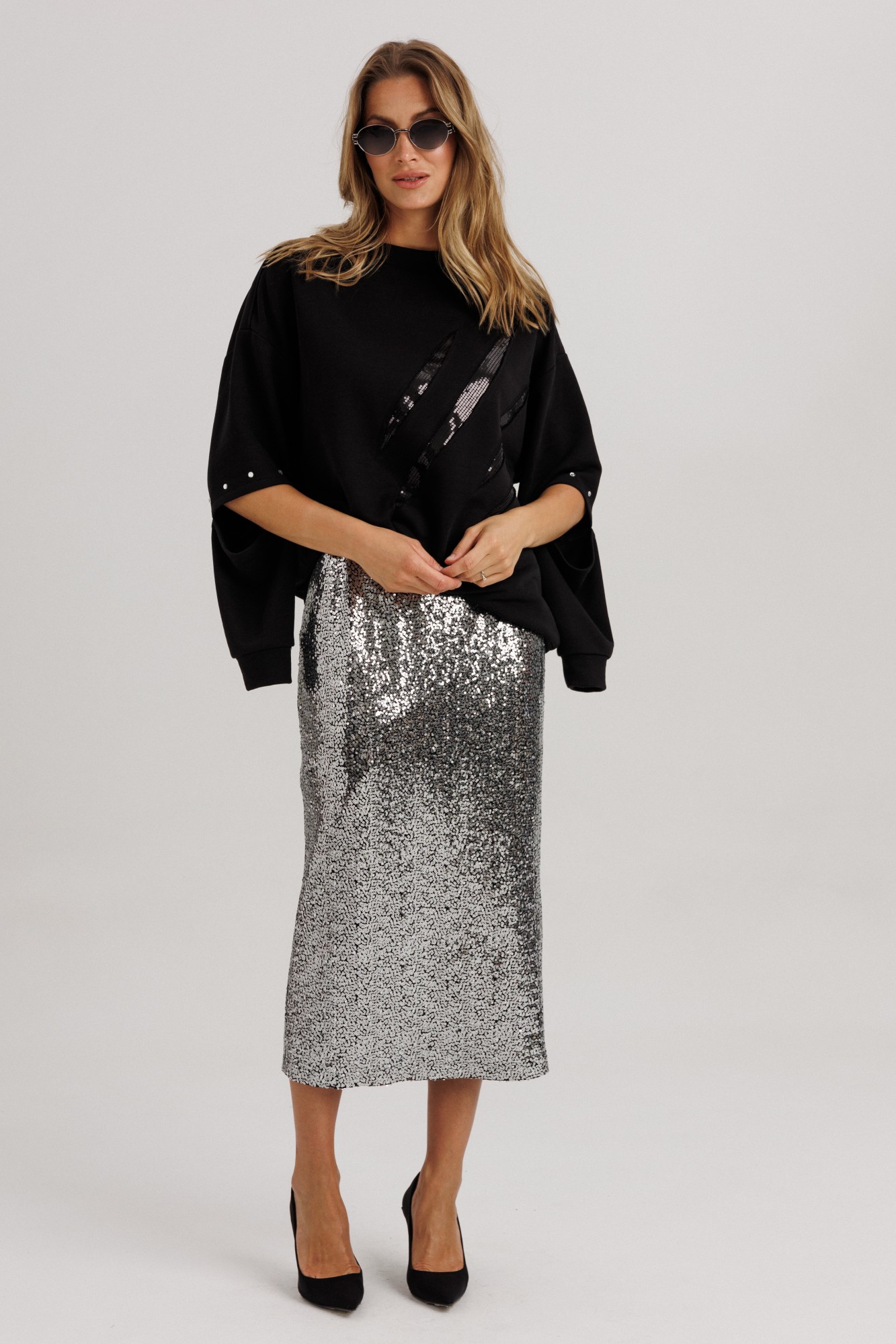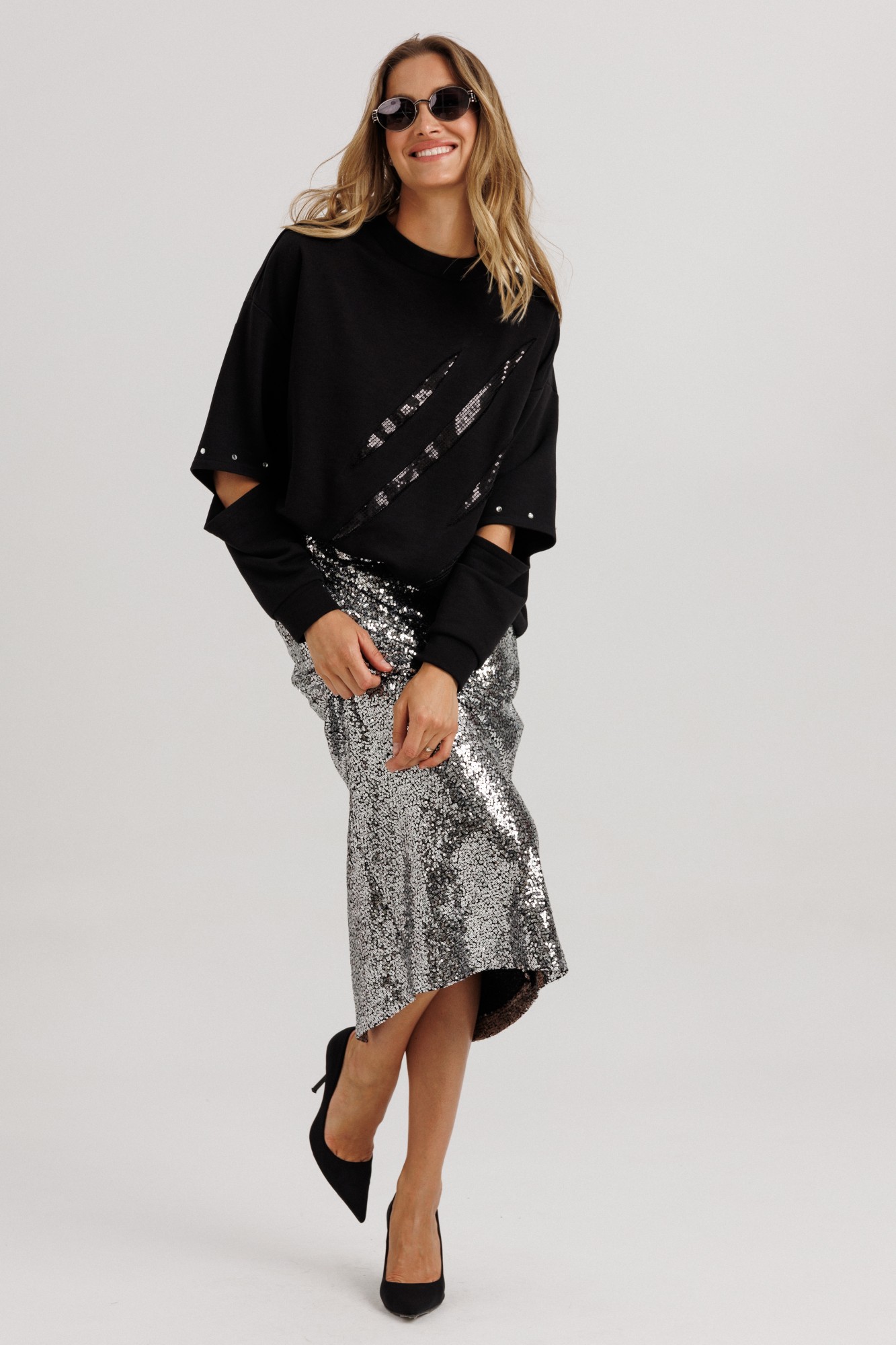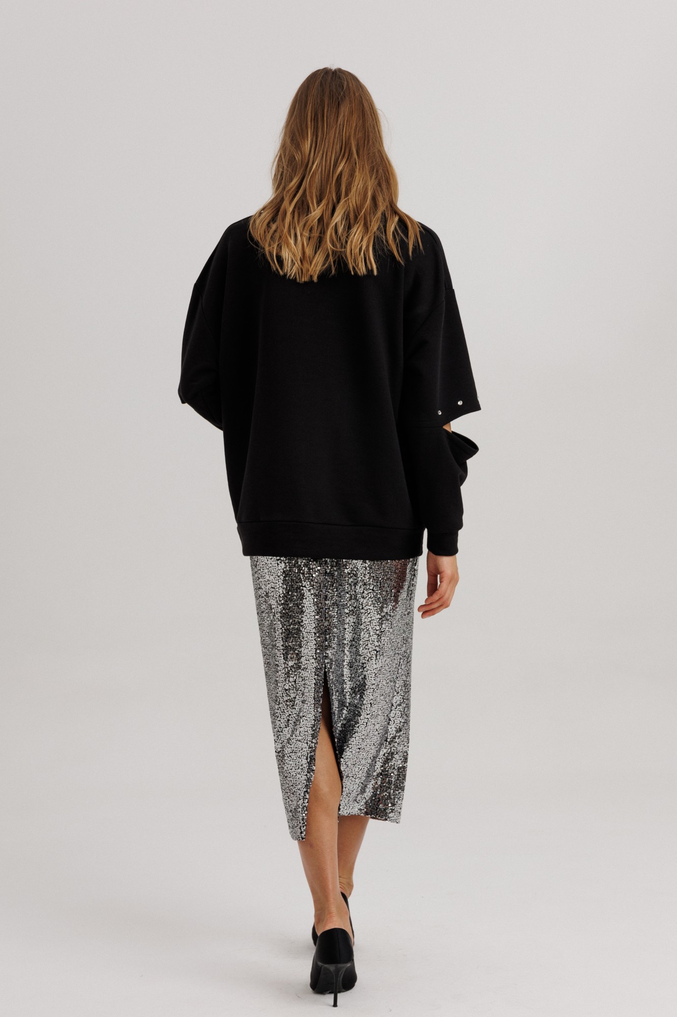Блузон из уютного трикотажного полотна, свободного прямого силуэта. Линия плеча спущена, рукав прямой, на зауженной манжете. Линия плеча состоит из притачного элемента: погона. Рукав основной состоит из двух деталей, в горизонтальном шве стачивания данных деталей расположен открытый разрез. По верхнему срезу расположены стразы. При желании длина рукава может трансформироваться и отверстием выступает открытый разрез. Длина рукава, вместе с плечевой линией 75 см. Из них 13 см: длина плеча и 62 см: длина рукава. Высота манжета 5 см. На центральной части переда блузона расположены декоративные аппликационные элементы, в виде ассиметричных полос из пайеток. Горловина округлая, оформлена притачной планкой, высотой 3 см. Низ блузона оканчивается притачной манжетой, высотой 6 см. Длина блузона по спинке изделия 70 см. (фурнитура может отличаться от представленной на рекламном фотоматериале). Особые рекомендации: рекомендуется холодная деликатная ручная стирка, без использования отбеливающих СМС, без интенсивного трения. Сушка в вертикальном положении. ВТО с минимальным паром.