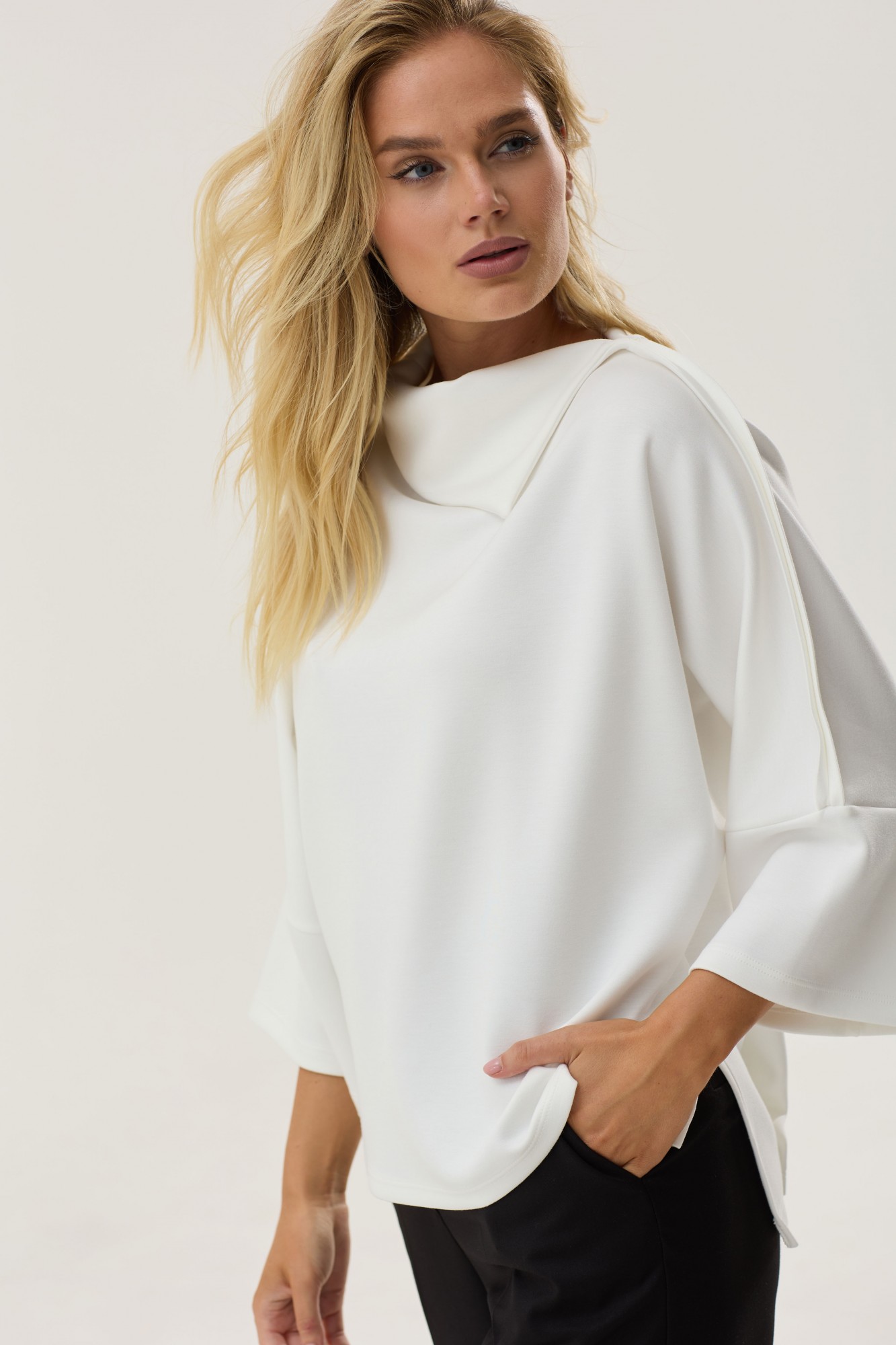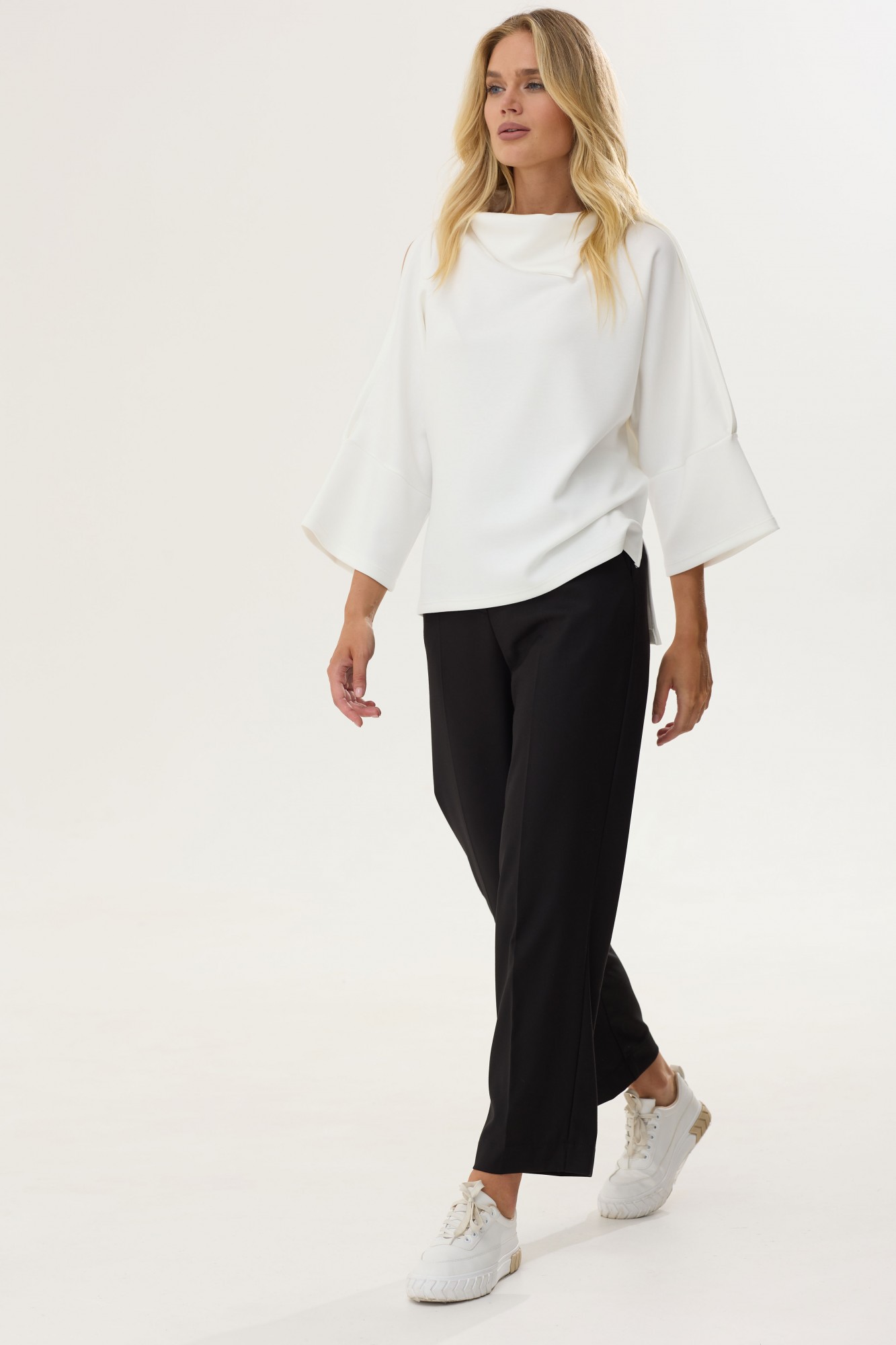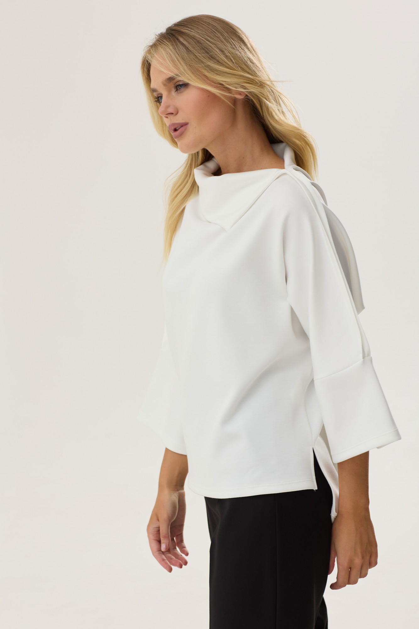 Стильный джемпер покроя ‘летучая мышь ‘из трикотажного полотна с фигурным низом. Воротник цельнокроенный ассиметричный. Правое плечо с разрезом. По низу рукава манжеты. В боковых швах по низу разрезы