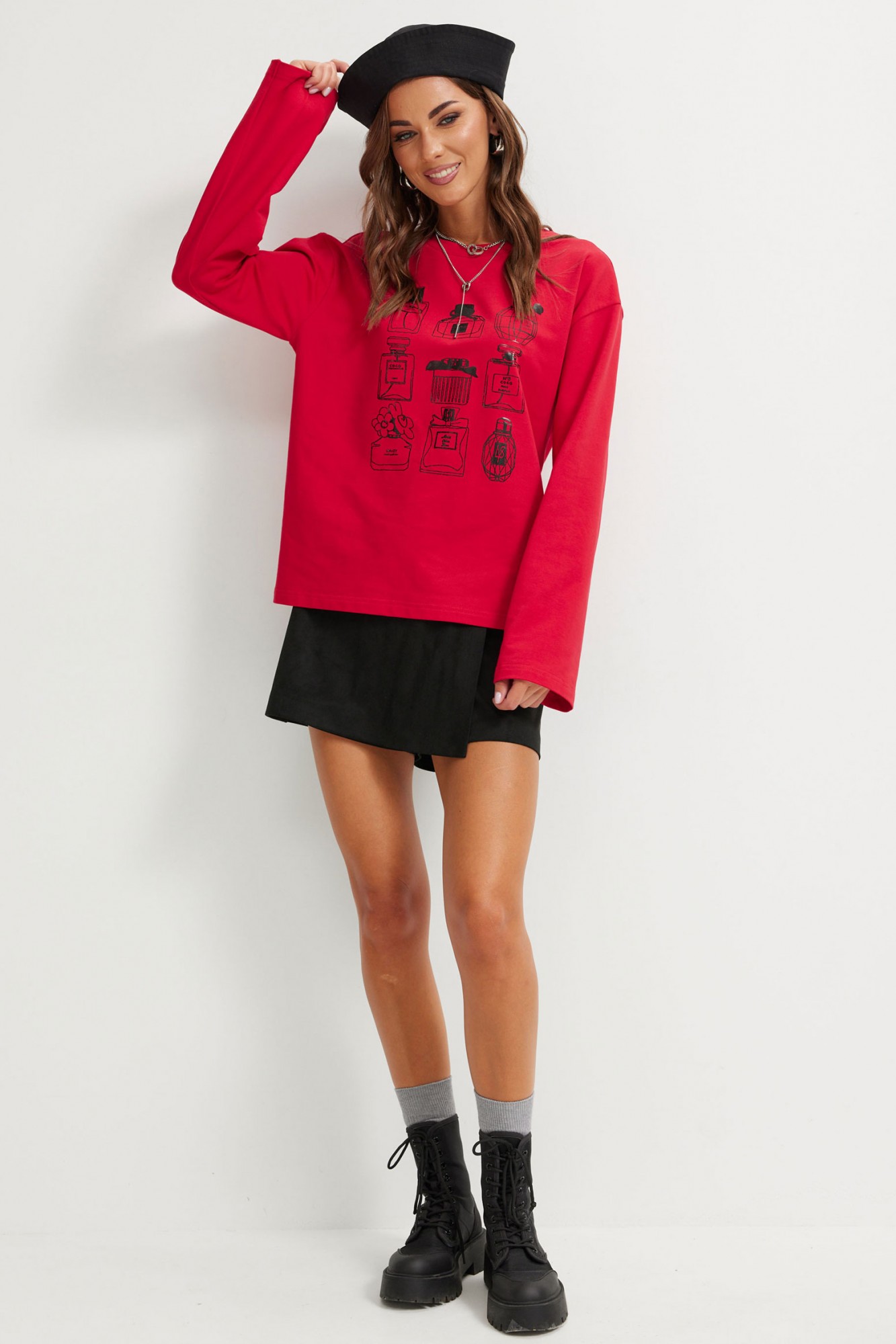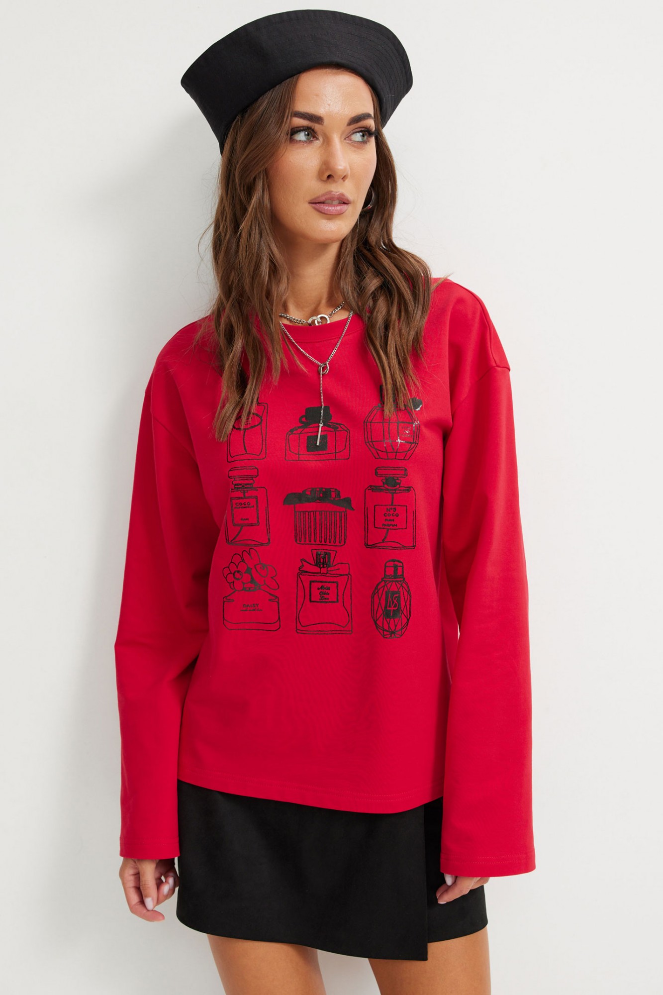 Стильный джемпер прямого силуэта из трикотажного полотна. Горловина округлая. Рукав втачной, удлиненный, расширенный к низу. По переду дизайнерская печать.