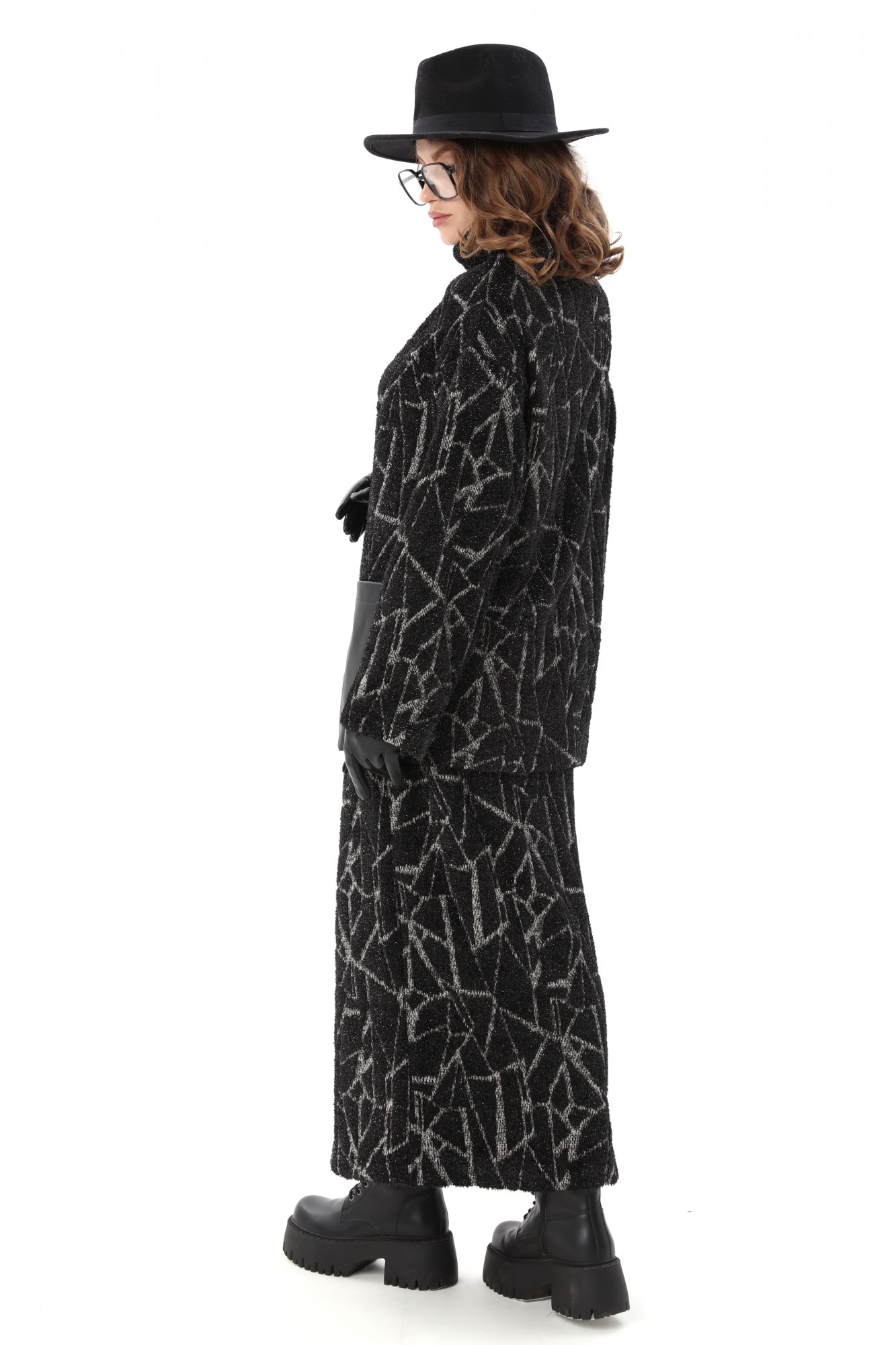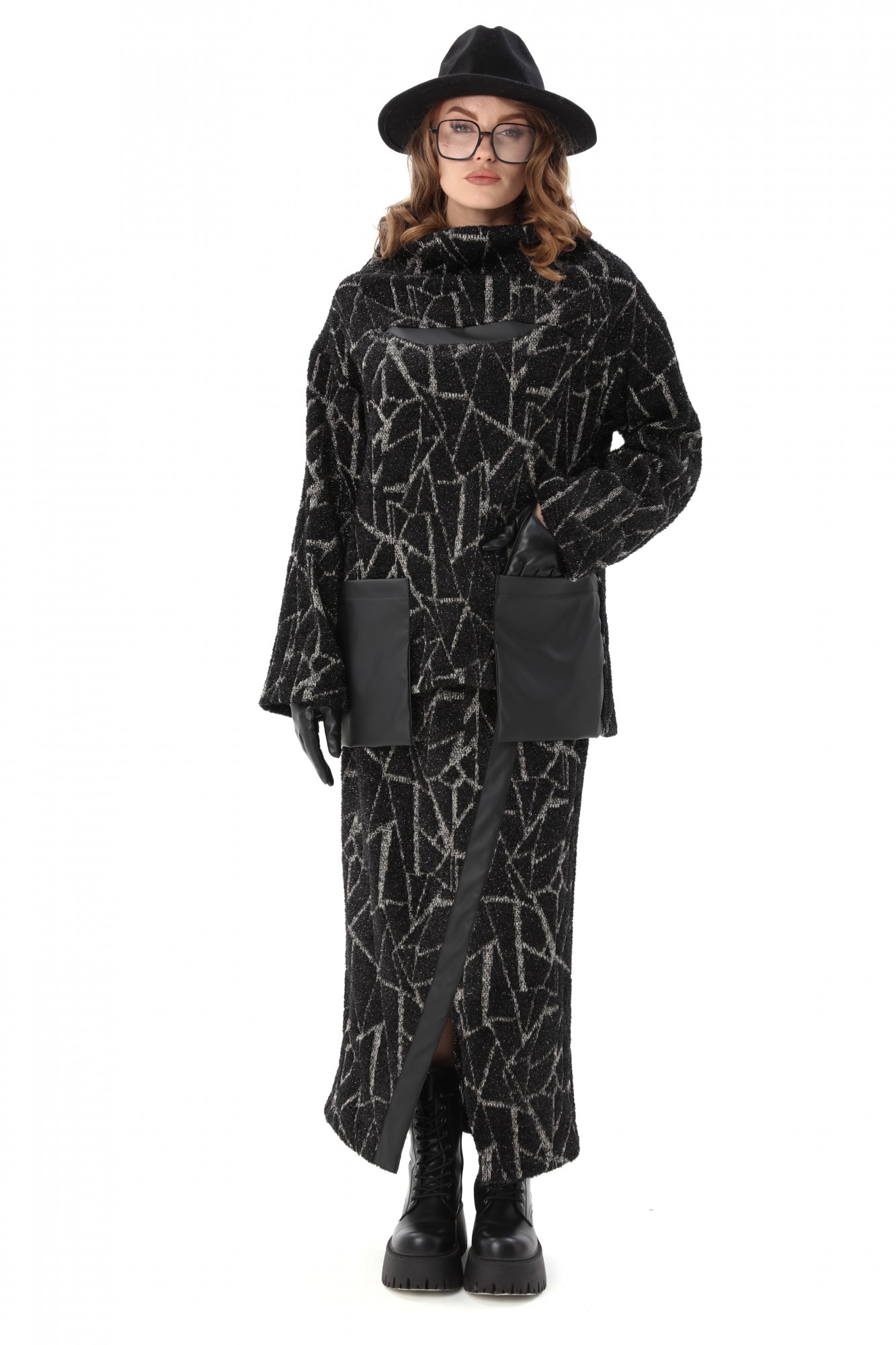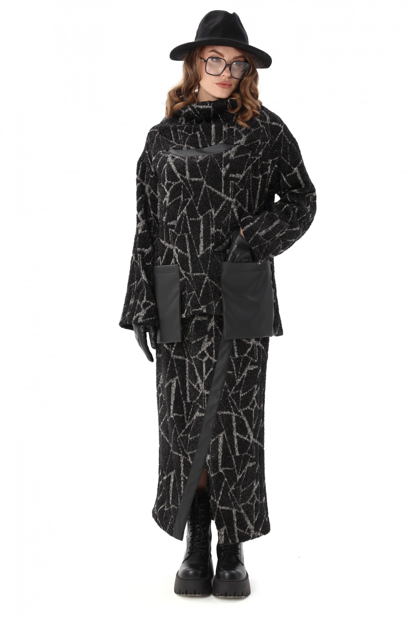 Джемпер прямого свободного силуэта длиной до линии бедер, воротник хомут, рукав одношовный, втачной длиной до запястья. Спинка цельнокроеная. Перед состоит из двух частей- верхней и нижней. По нижней части переда сверху по центру вставка из отделочной ткани. По нижней части переда боковые накладные карманы из отделочной ткани, уходящие в боковой шов, длиннее линии низа переда вровень с линией низа спинки.