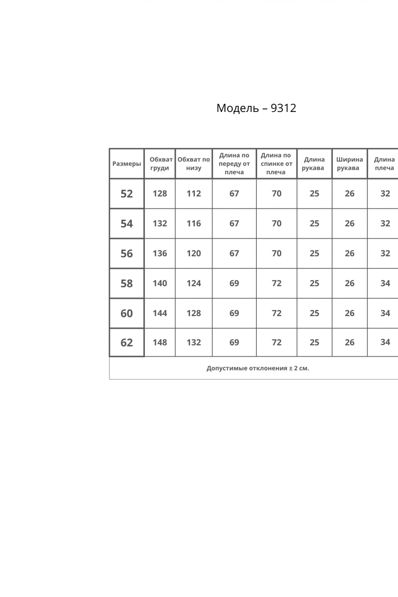 Таблица размеров