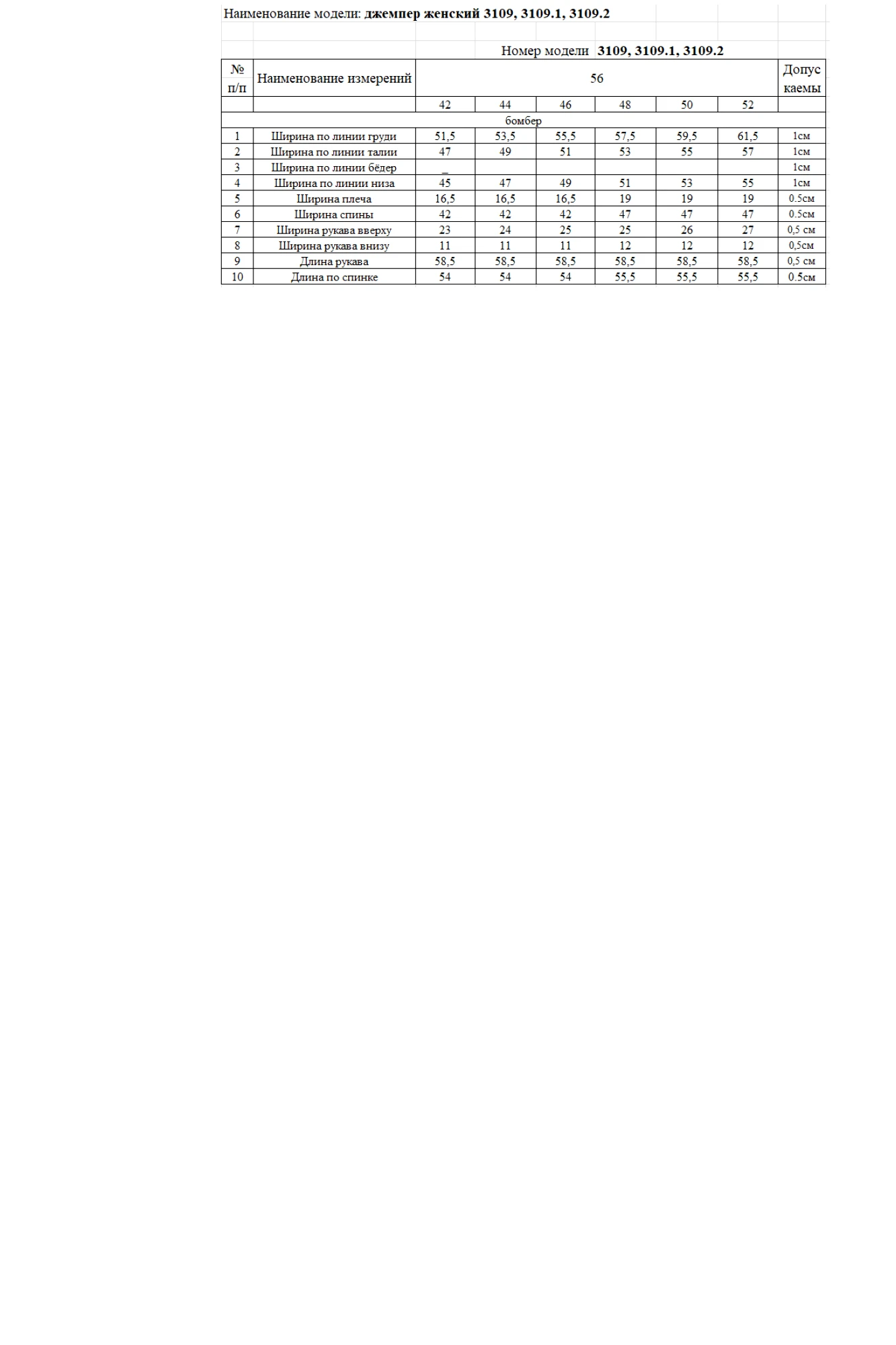 Таблица размеров