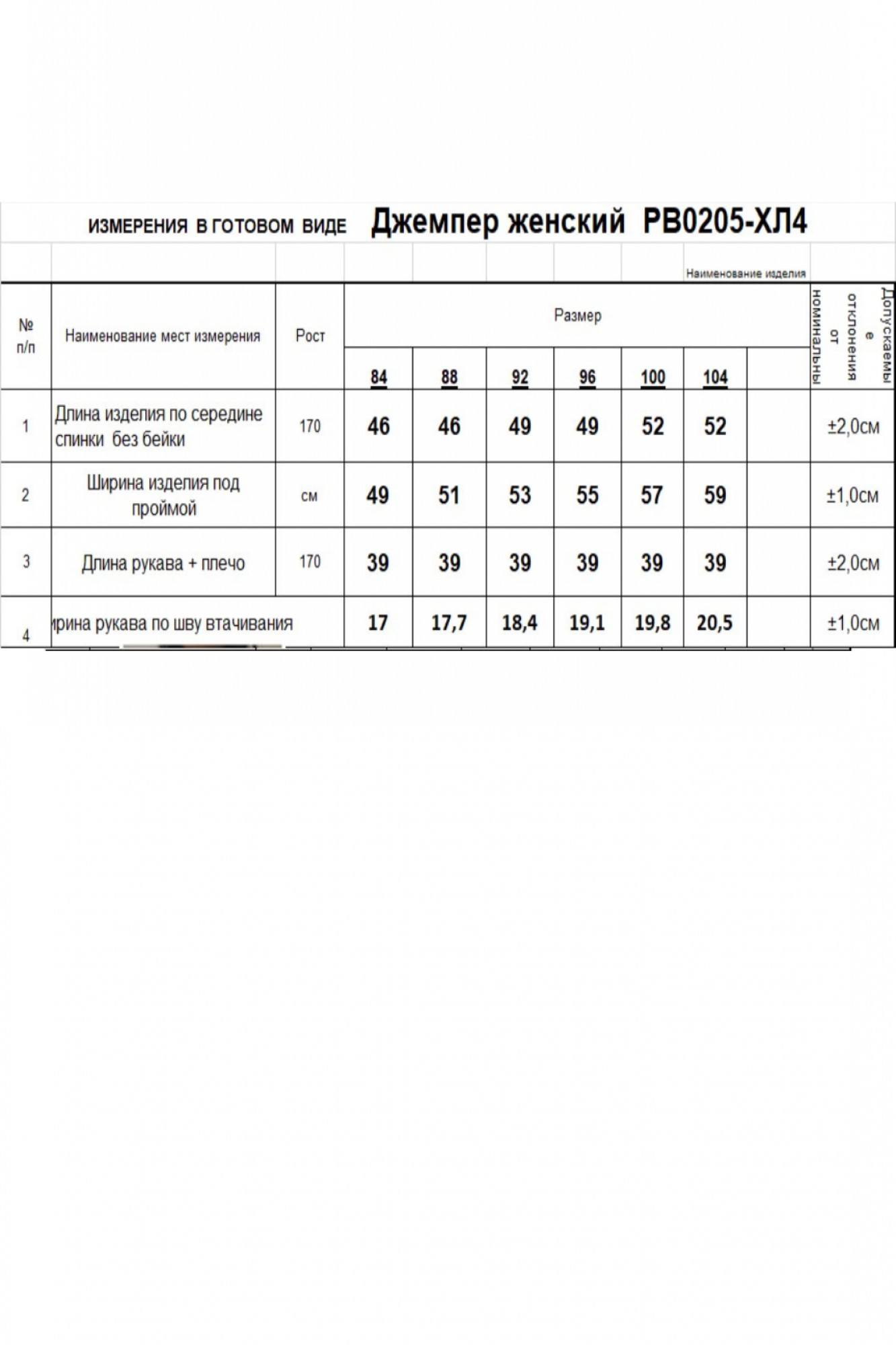 Таблица размеров