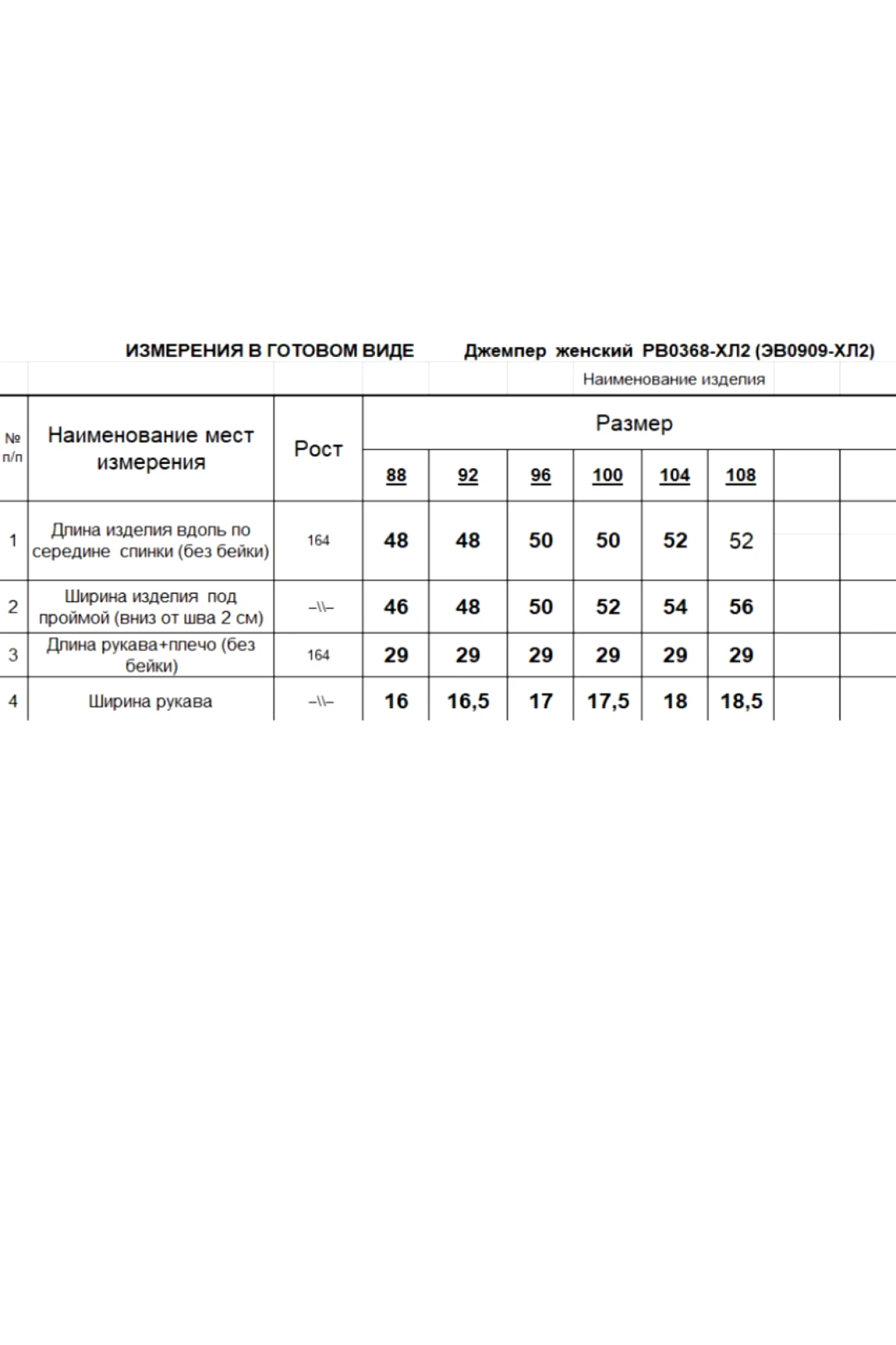 Таблица размеров