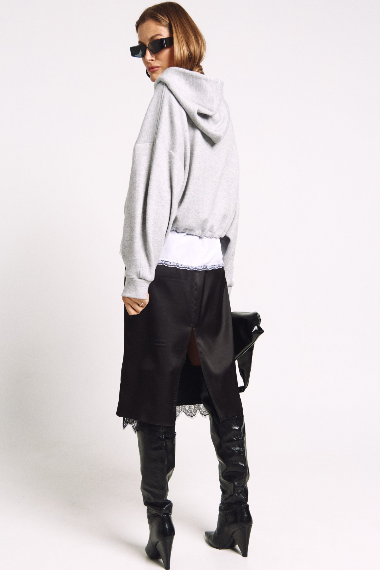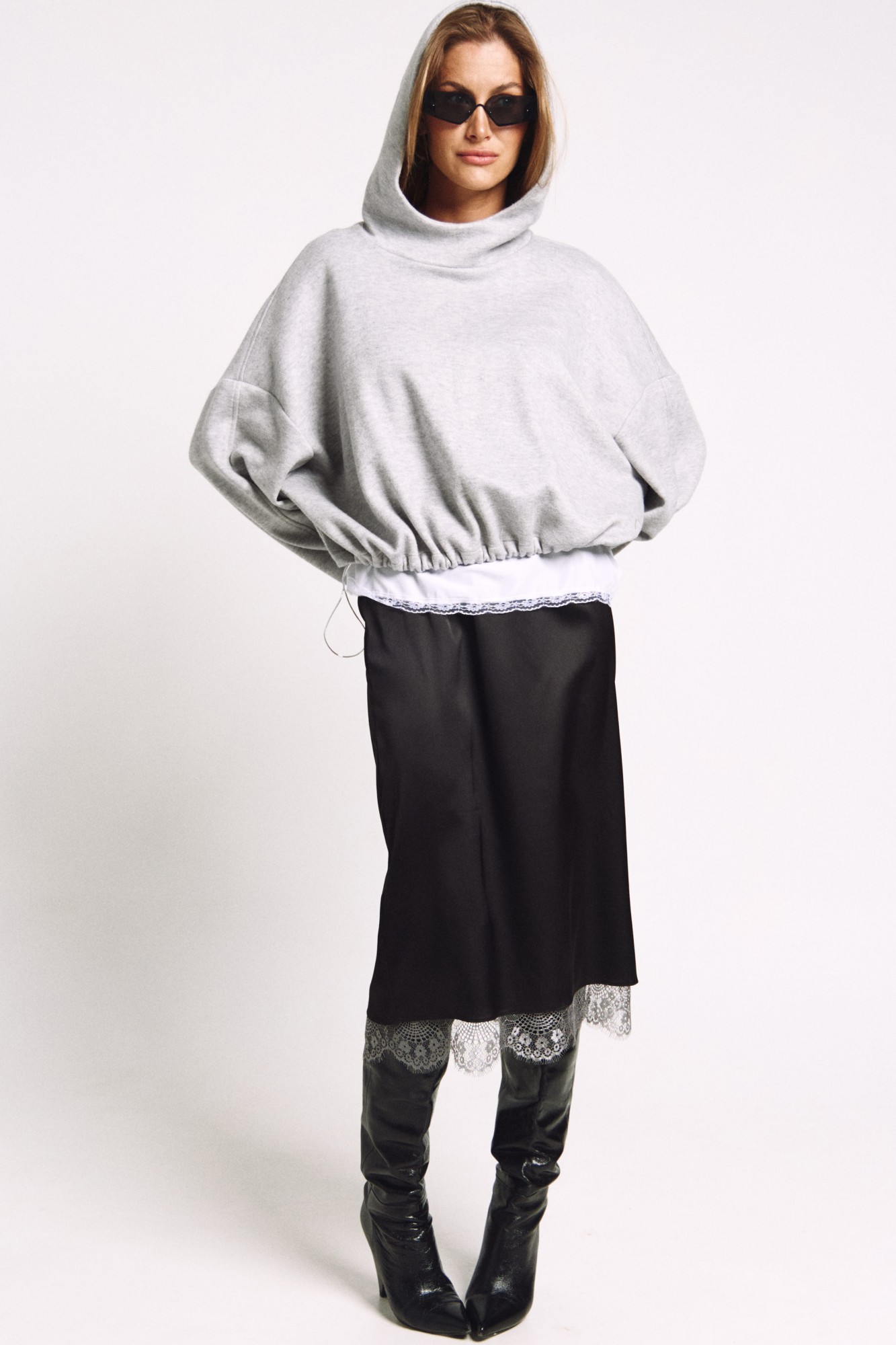 Худи большого объема с необычным капюшоном-стойкой. Ширина низа худи регулируется резинками. Два универсальных размера - S (соответствует 42-44-46), L (соответствует 48-50-52).