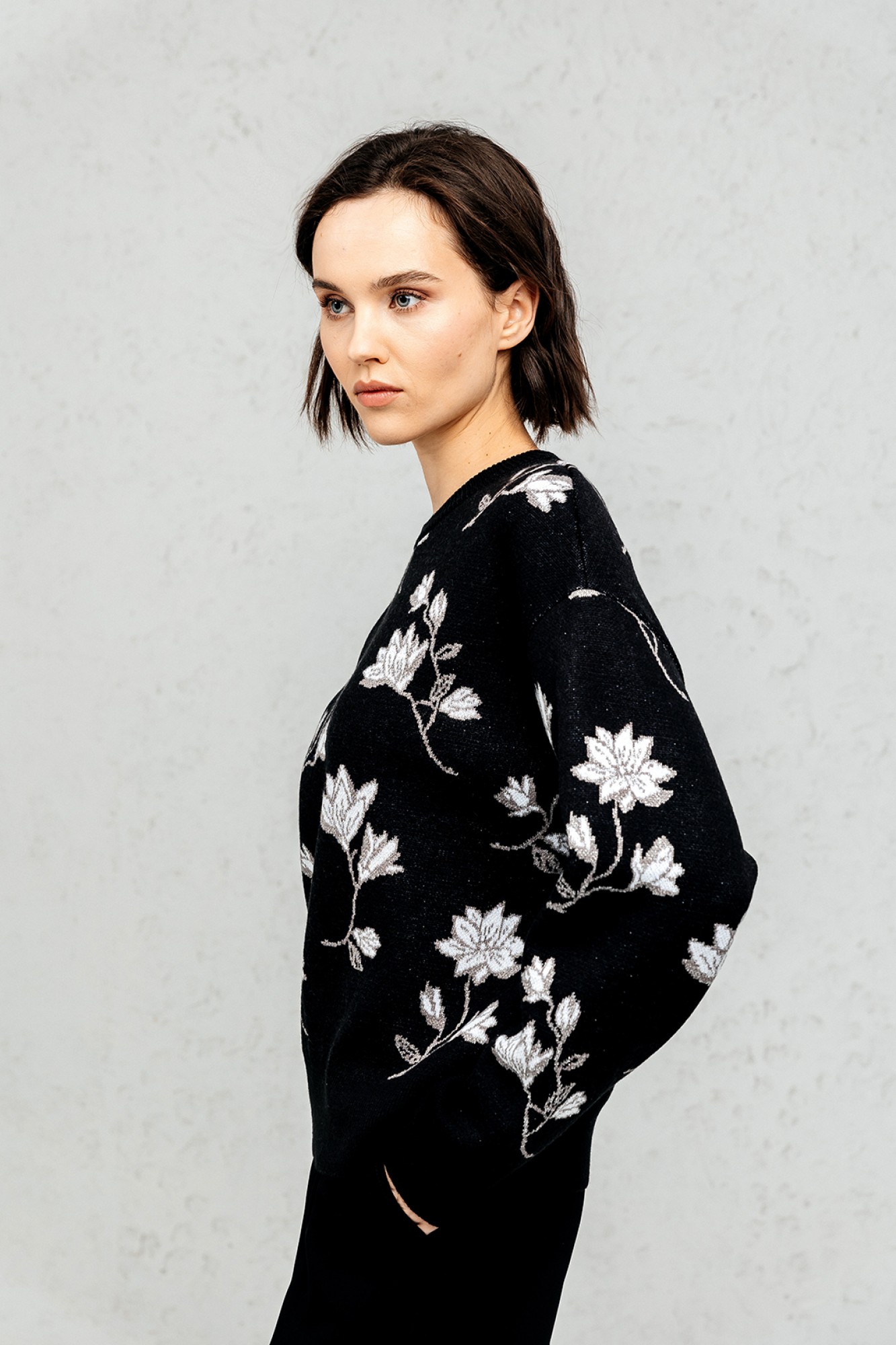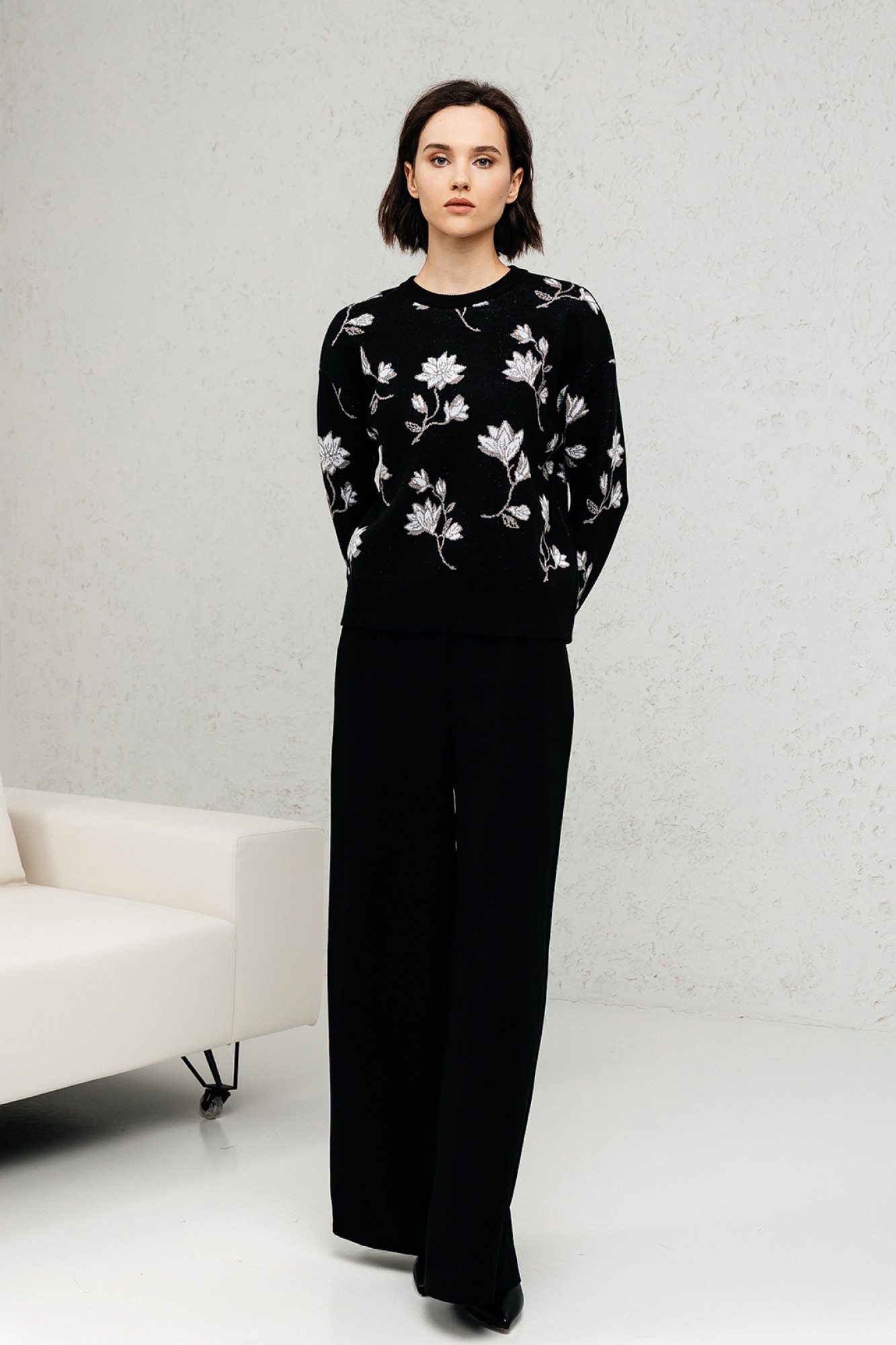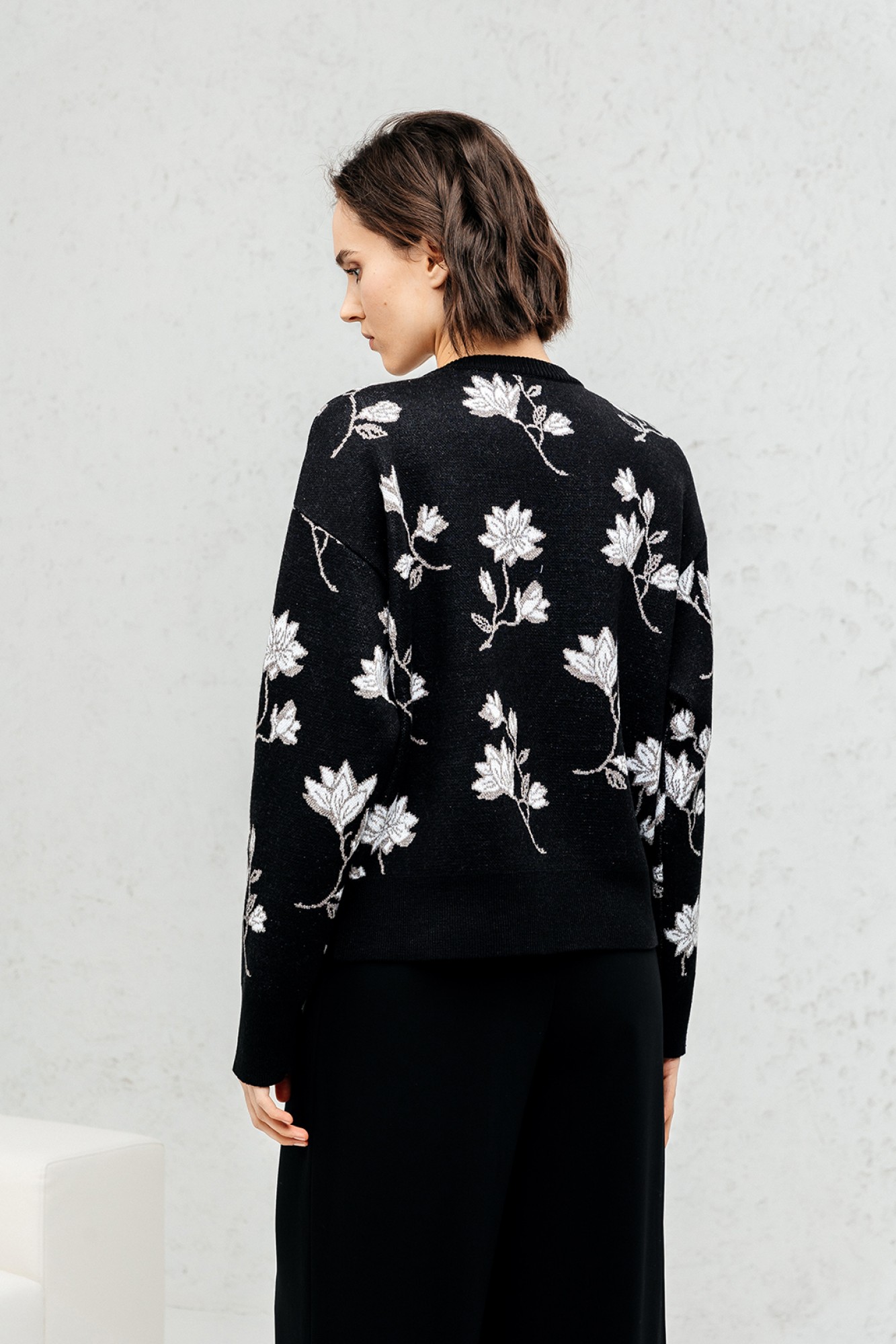 Джемпер прямого силуэта. Джемпер очень приятный к телу, вывязан жаккардовым переплетением. По переду, спинке и рукавам вывязаны цветы. Рукав втачной, длинный. Вырез горловины круглый обработан прикеттлёванной бейкой. Он нарядный сам по себе, так что после работы смело иди на встречу с подругой в кафе. Это базовый джемпер, который просто необходим в наше время!