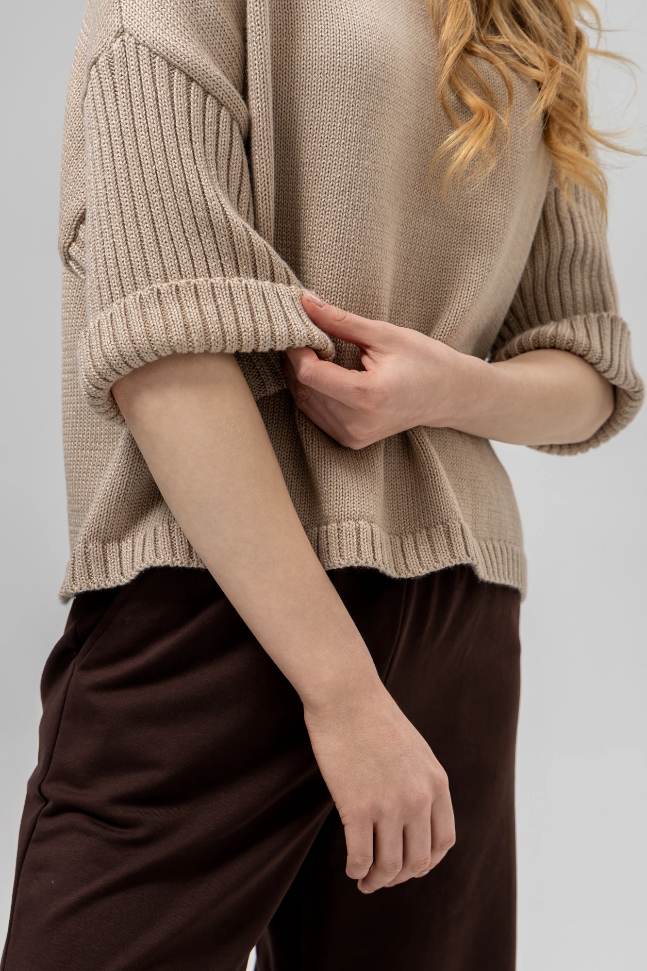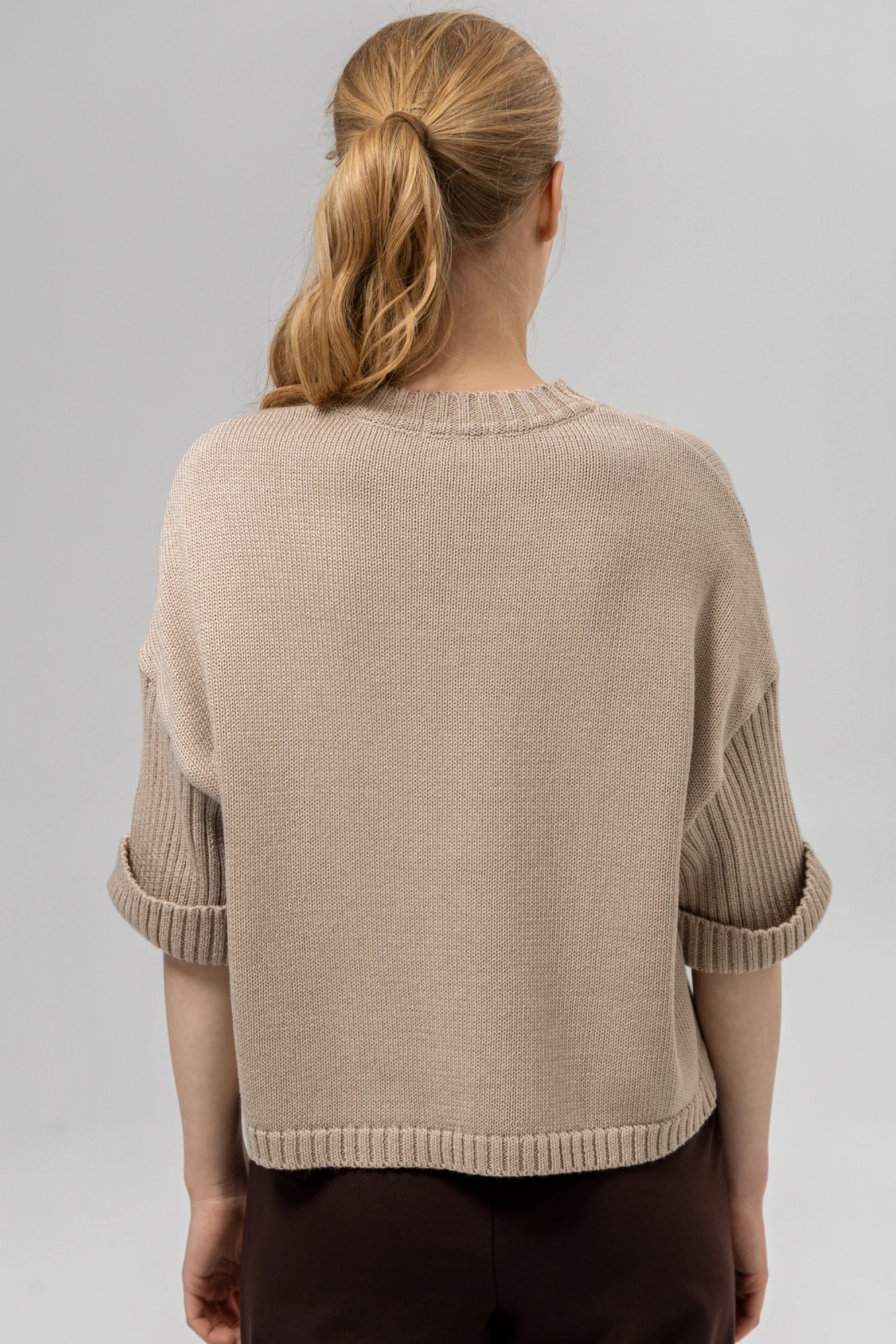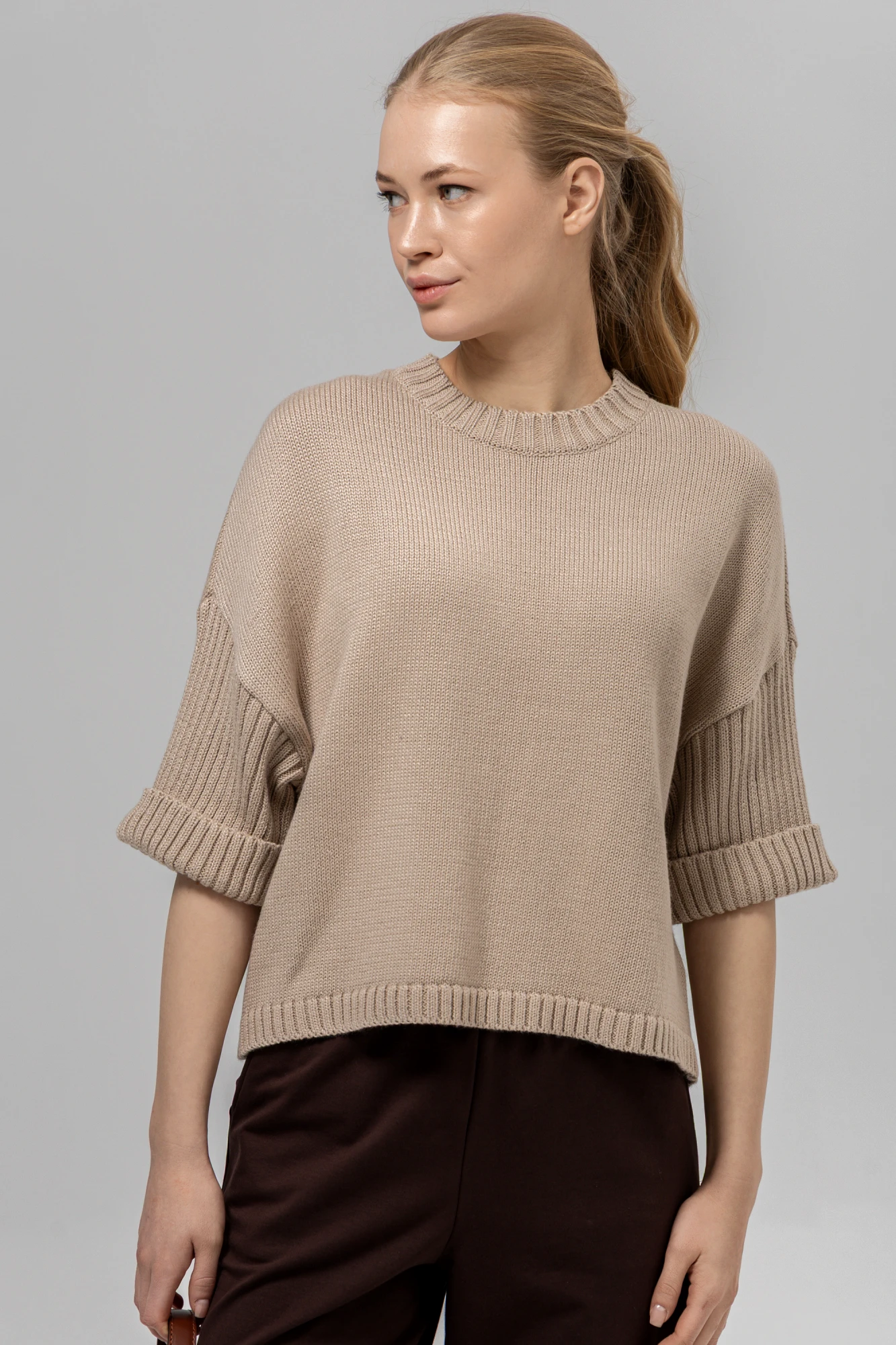 Дизайн: укороченный джемпер с короткими рукавами и отстроченными манжетами, что придаёт изделию оригинальность и стиль. Круглый вырез горловины и ребристая текстура подчёркивают женственность и уют;