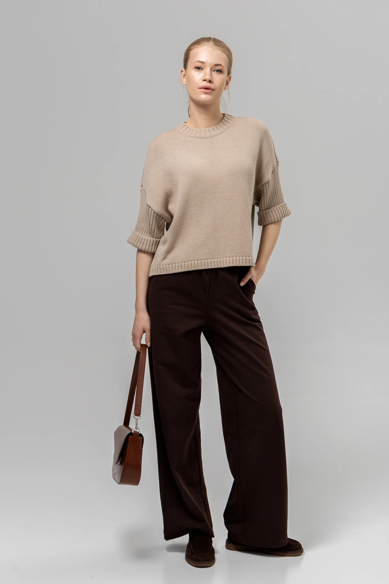 Джемпер отлично сочетается с брюками свободного кроя, как на фото, джинсами или юбками. Для завершения образа подойдут кроссовки, балетки или туфли на низком каблуке. Дополните образ минималистичными аксессуарами, такими как тонкий браслет или серьги.