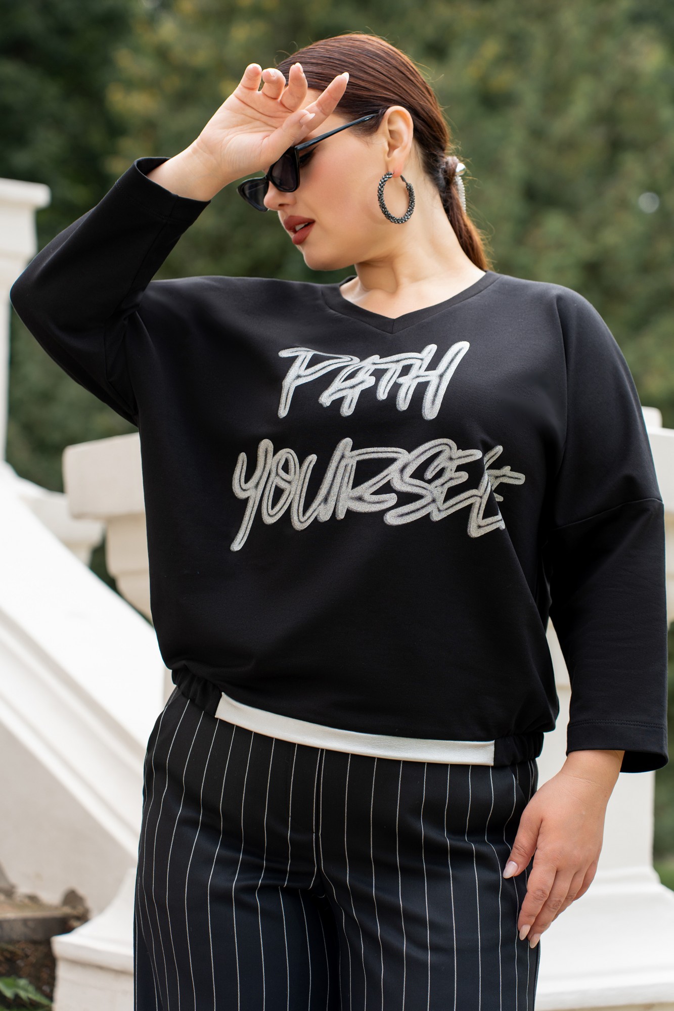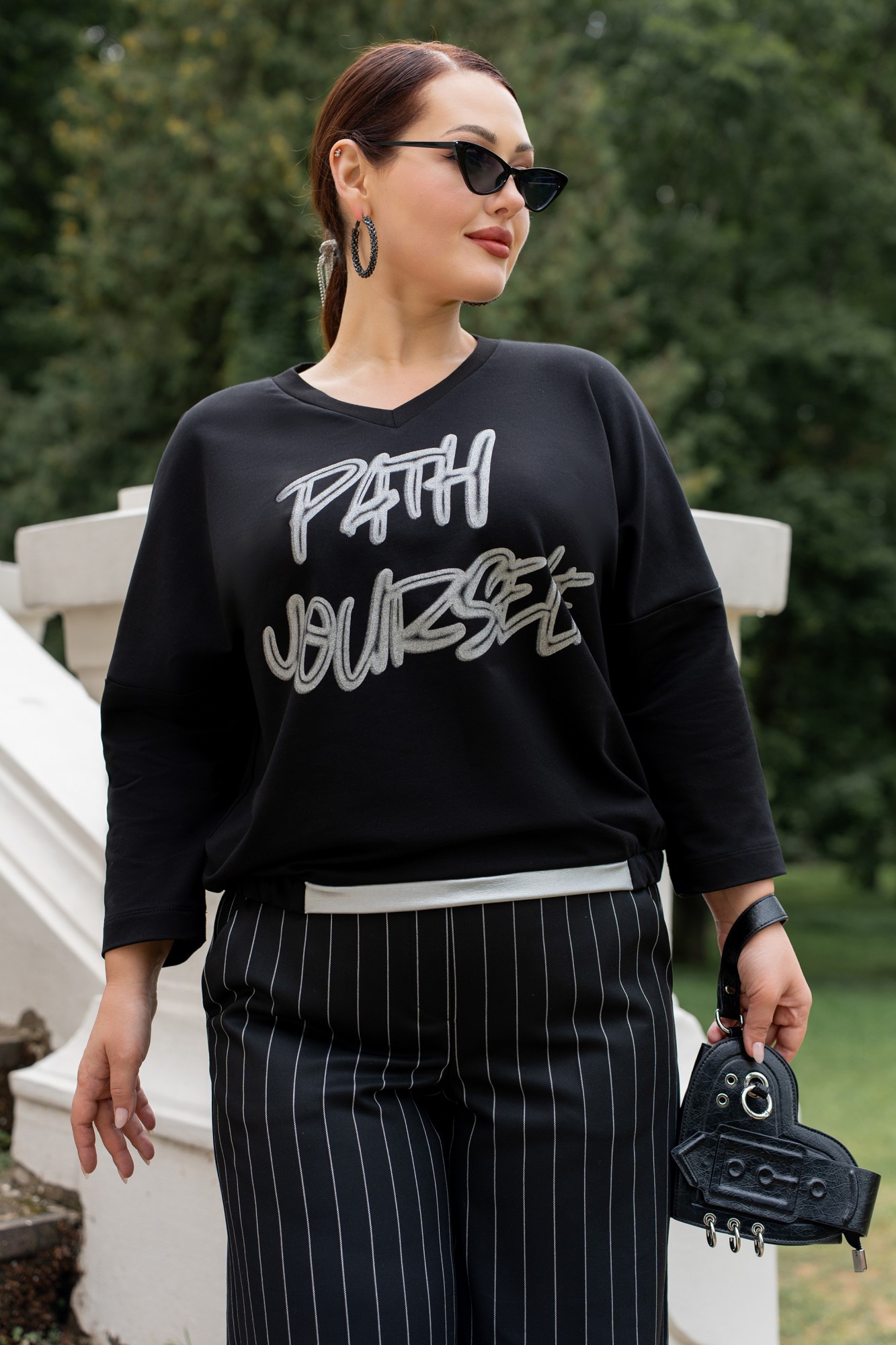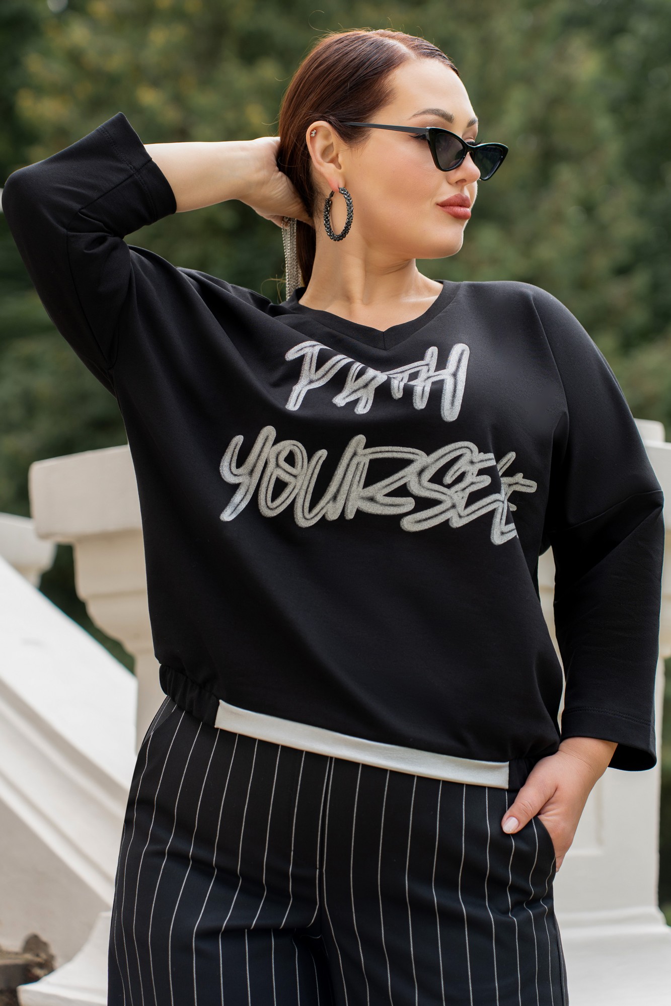 Джемпер выполнен из премиум трикотажа, свободного силуэта, с V-образным вырезом горловины, со спущенным плечом, рукава 7/8. По полочке серебряная дизайнерская печать, по низу серебряная вставка. Спинка со средним швом. Горловина обработана бейкой по низу спинки и бокам с эластичной резинкой.