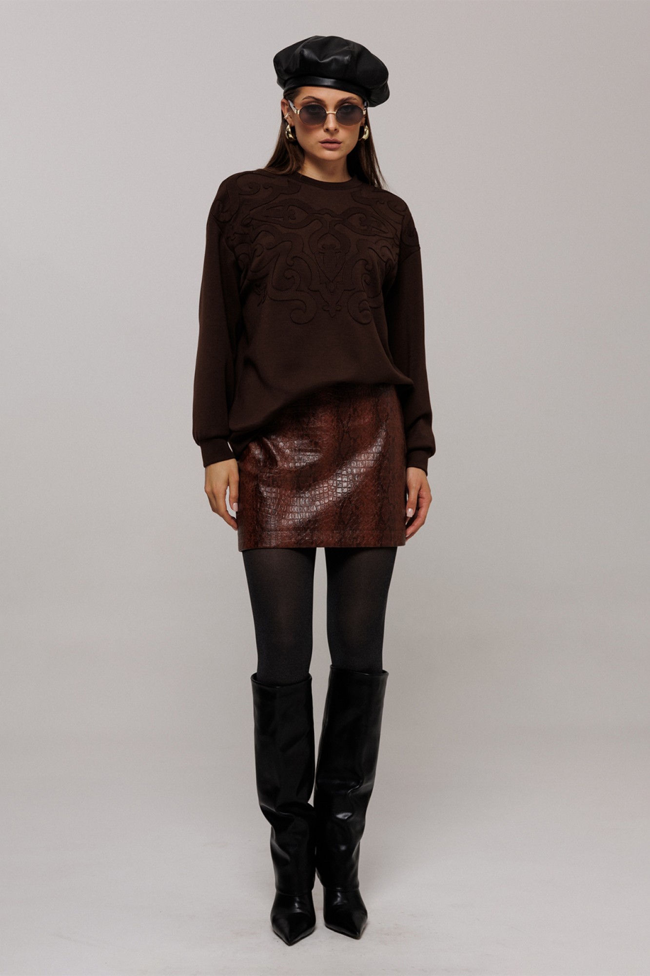 Джемпер из технологичного трикотажного полотна с эффектом peach. Прямого силуэта с втачным рукавом и спущенной линией плеча, с манжетой из основной ткани по низу рукава. По переду вышивка "Орнамент". По горловине и низу изделия притачная планка из основной ткани.