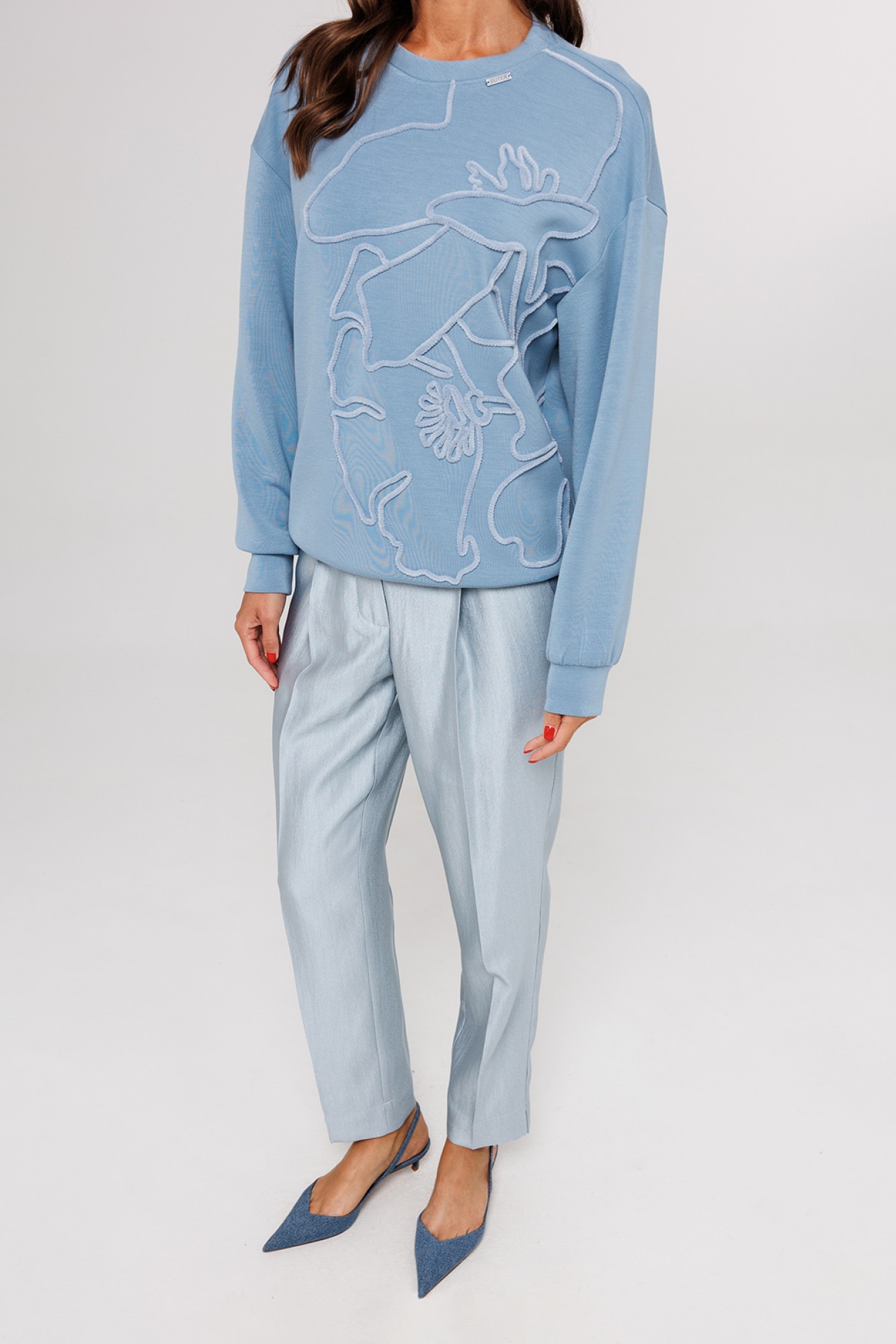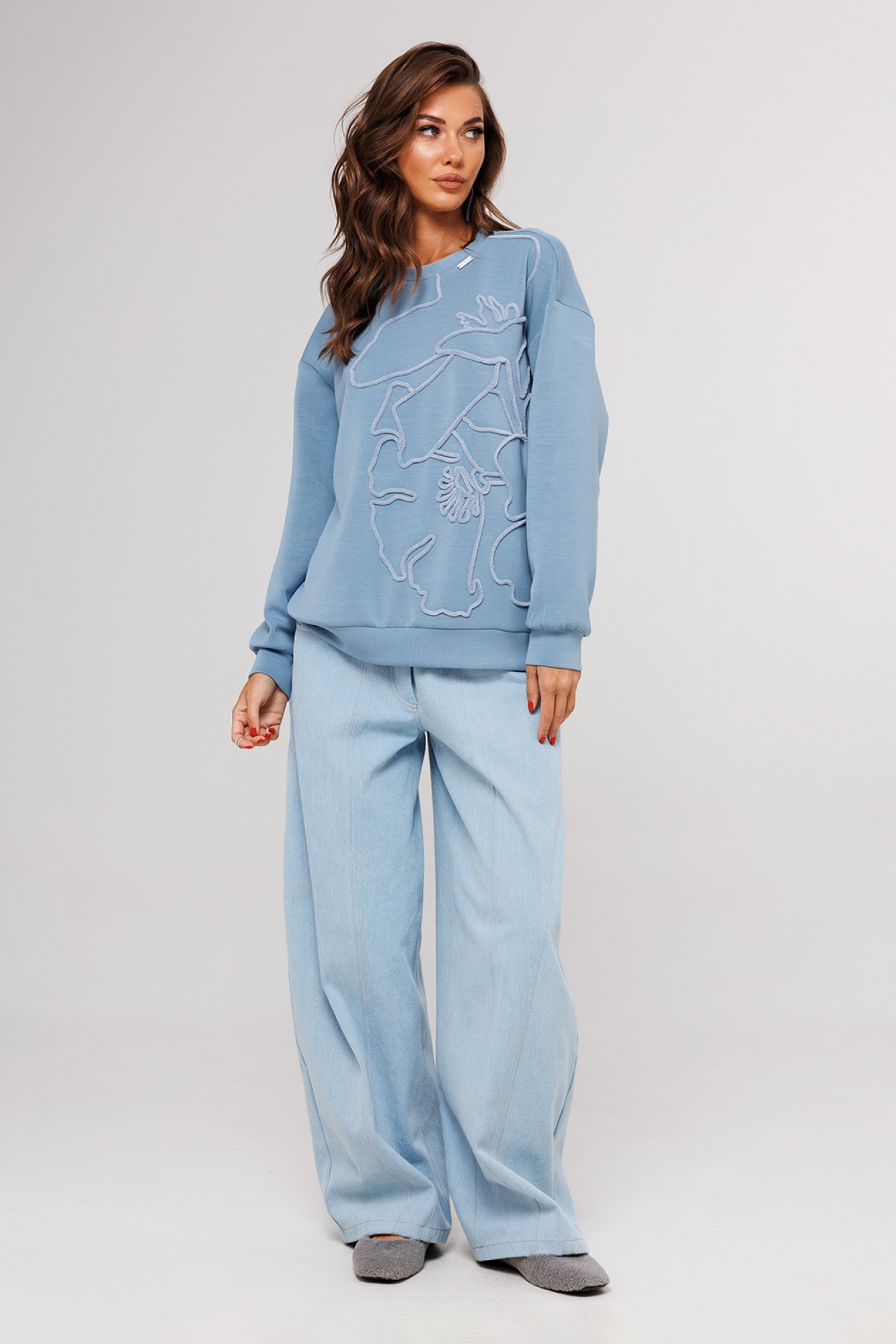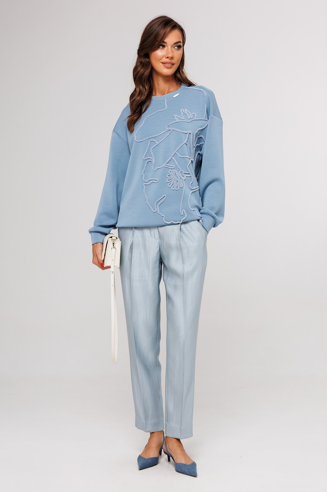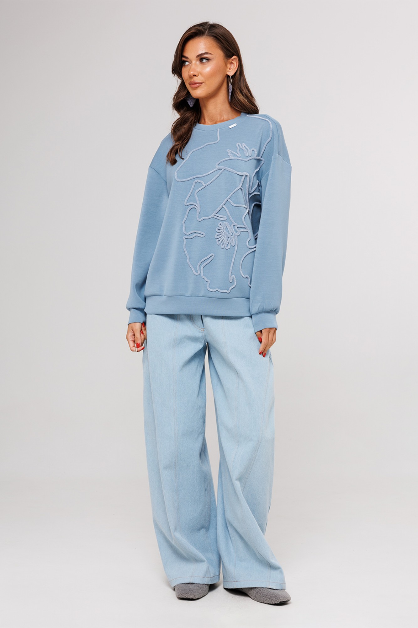 Джемпер из технологичного трикотажного полотна с эффектом peach. Прямого силуэта с втачным рукавом и спущенной линией плеча, с манжетой из основной ткани по низу рукава. По переду вышивка декоративным шнуром FLOWERS и нашивка BUTER. По горловине и низу изделия притачная планка из основной ткани.