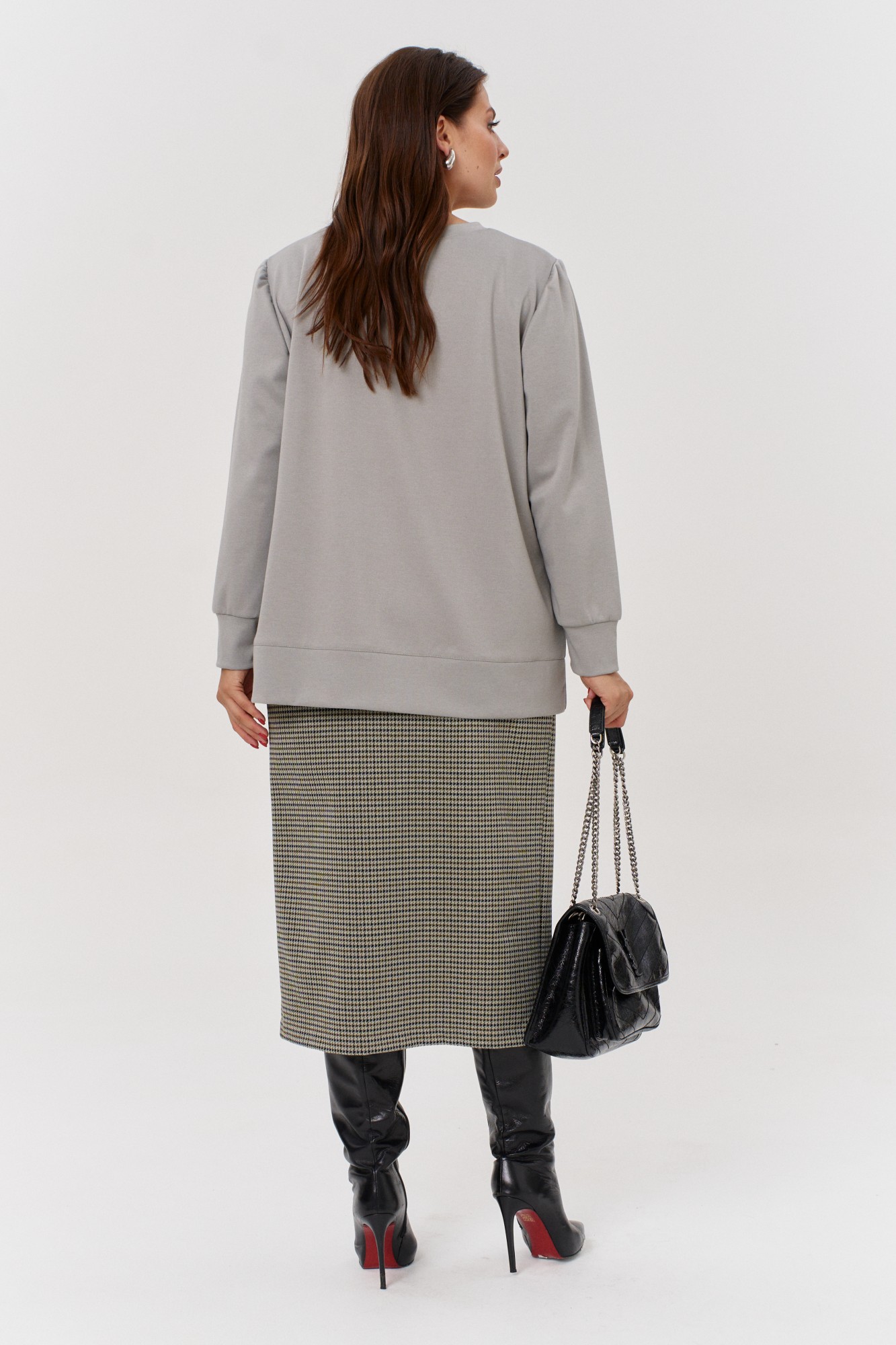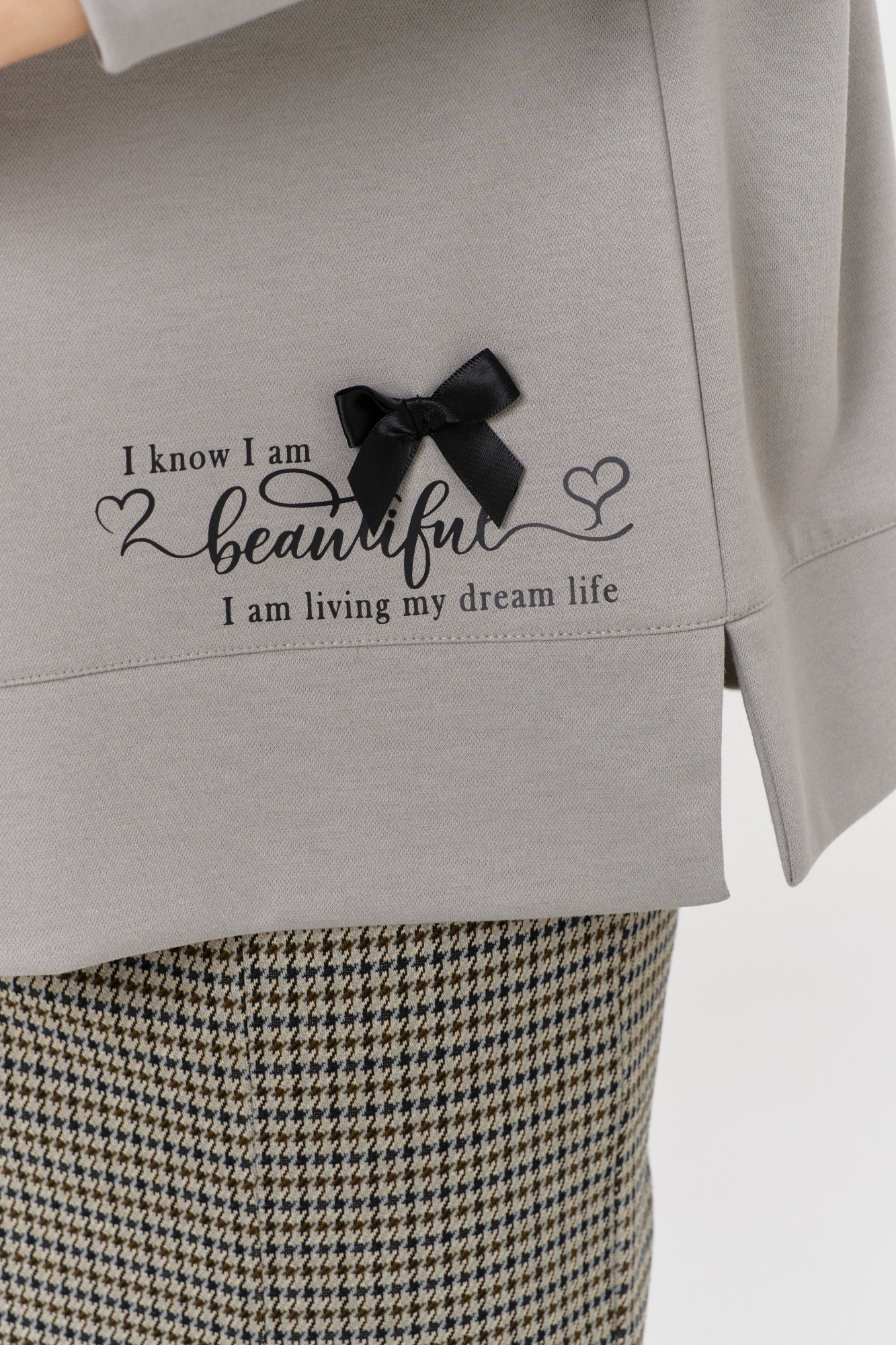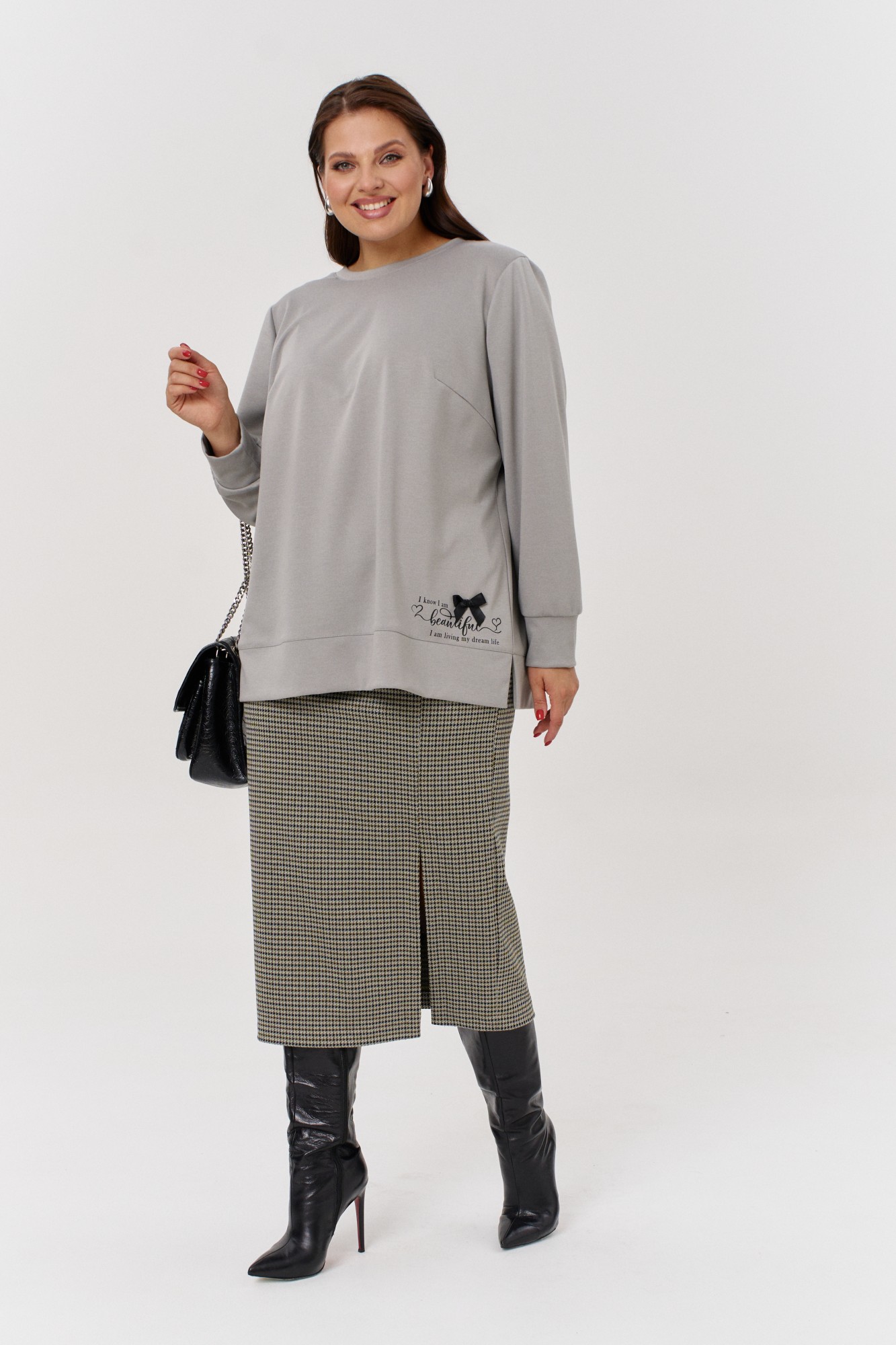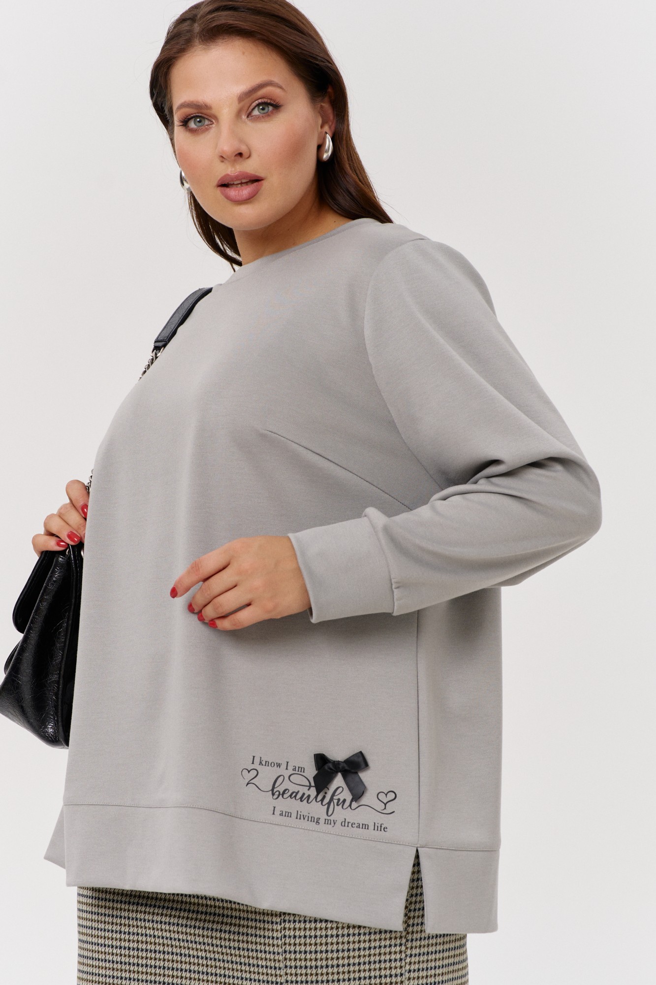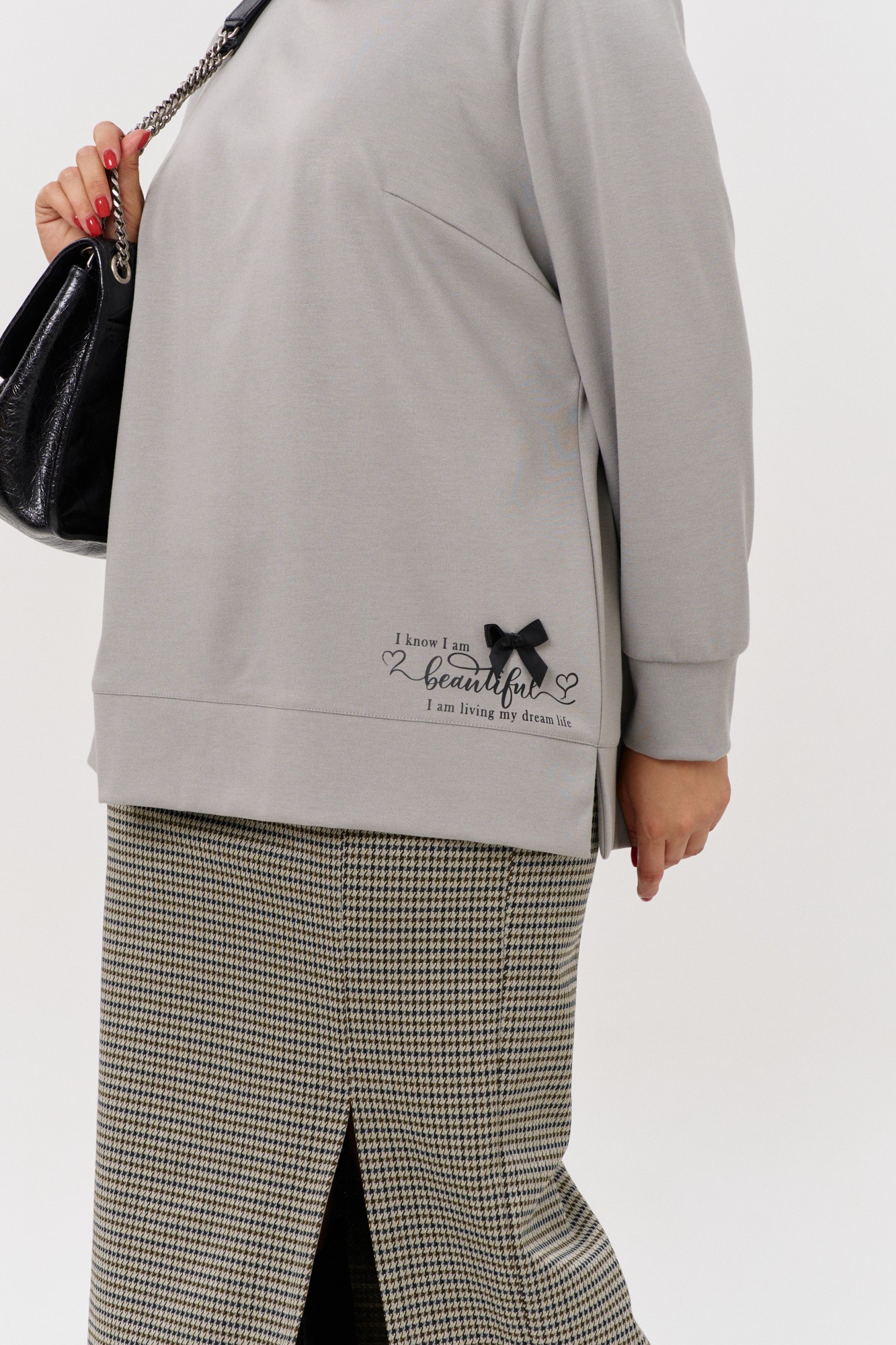 Джемпер свободного покроя с круглой горловиной. Рукав втачной, полномерный по обхвату, на манжете. Низ джемпера тоже на манжете. Для удобства в боковых швах разрезы. Внизу на полочке оригинальная печать и пришивной декор в виде атласного бантика. Благодаря качественным лекалам джемпер хорошо садится по фигуре, не мнётся, удобен для повседневной носки и прекрасно выглядит! Ткань хорошо тянется и это позволяет вам комфортно себя чувствовать.