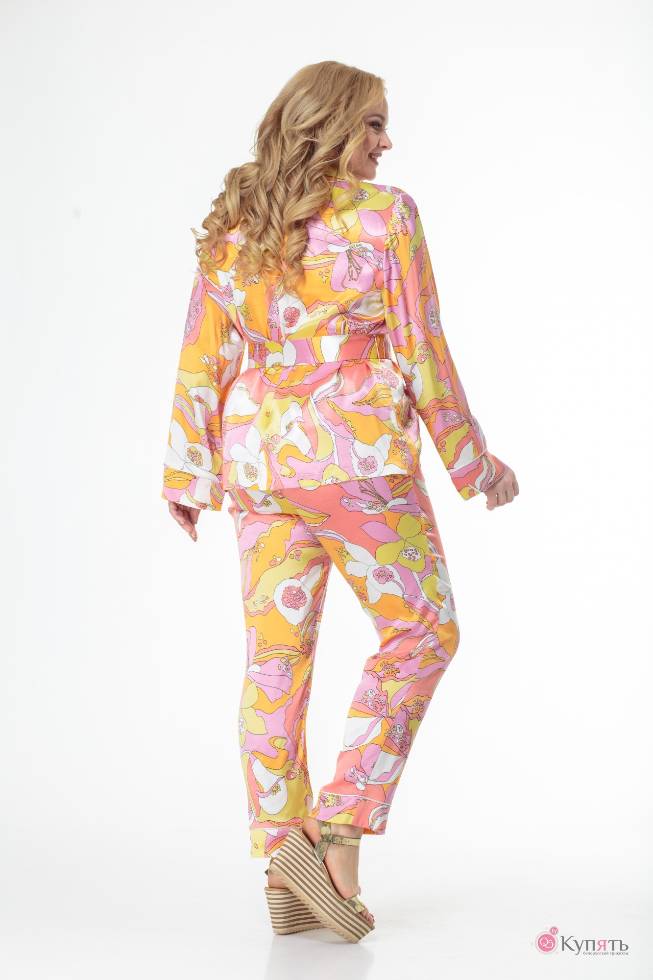 Брючный костюм выполнен из нескольких видов ткани: вискозы, сатина и шелка в разных цветовых решениях и призван создать ощущение комфорта и роскоши одновременно.