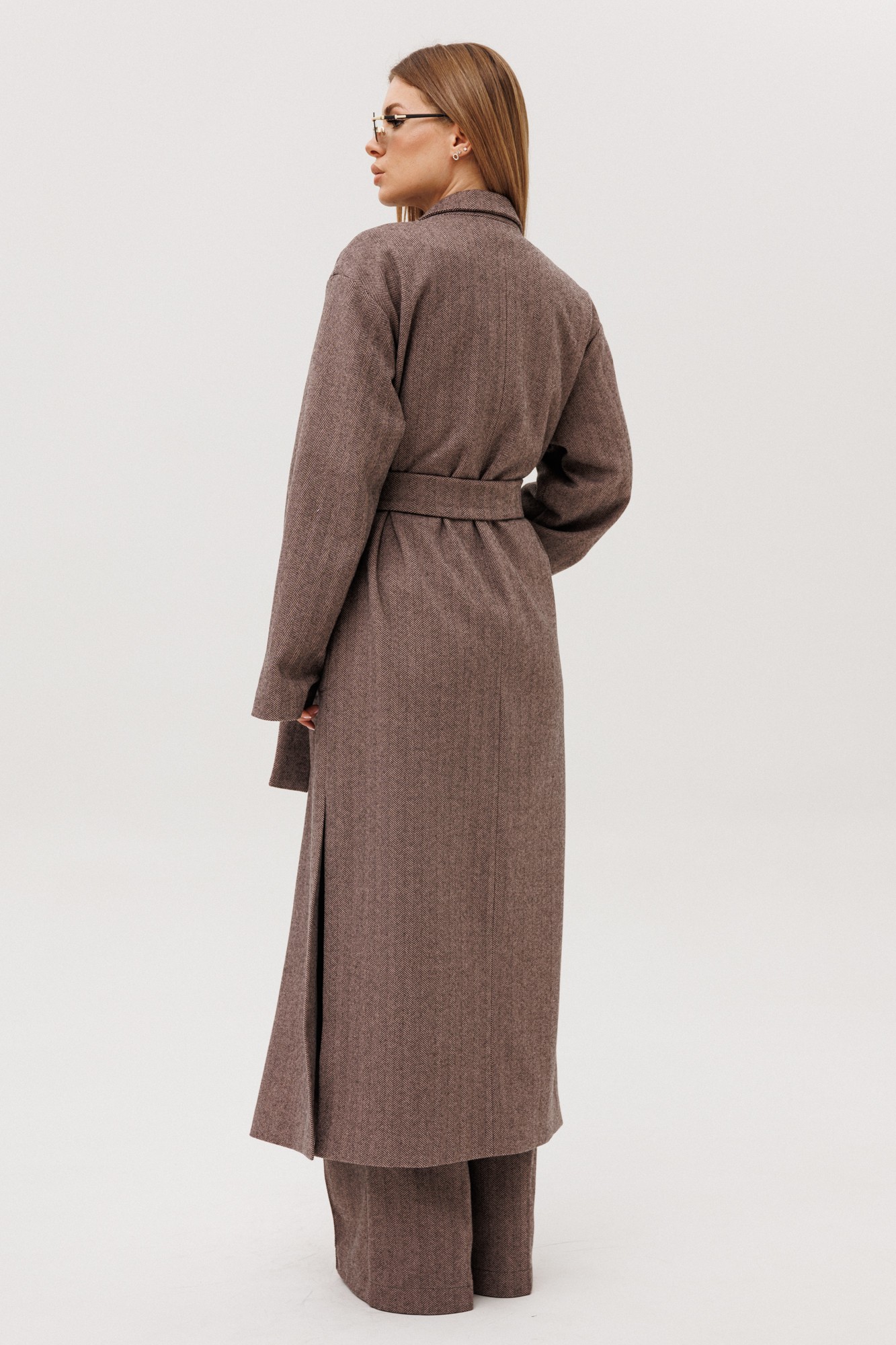 Кардиган женский, выполнен из теплой ткани, свободного силуэта со спущенным плечом, в боковых швах разрезы. Рукав длинный. По переду накладные карманы. Кардиган на подкладке. Пояс из основной ткани в комплекте.