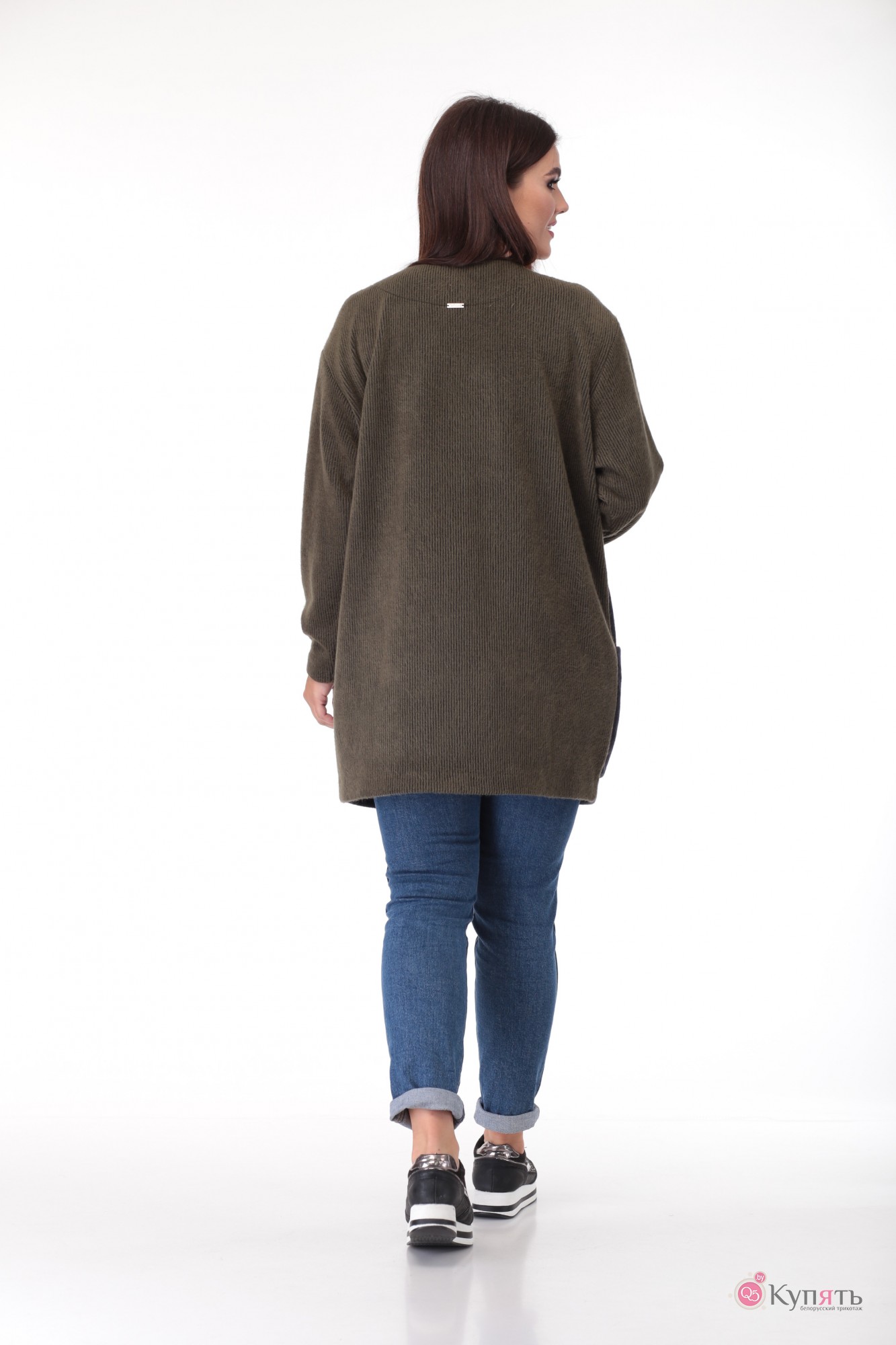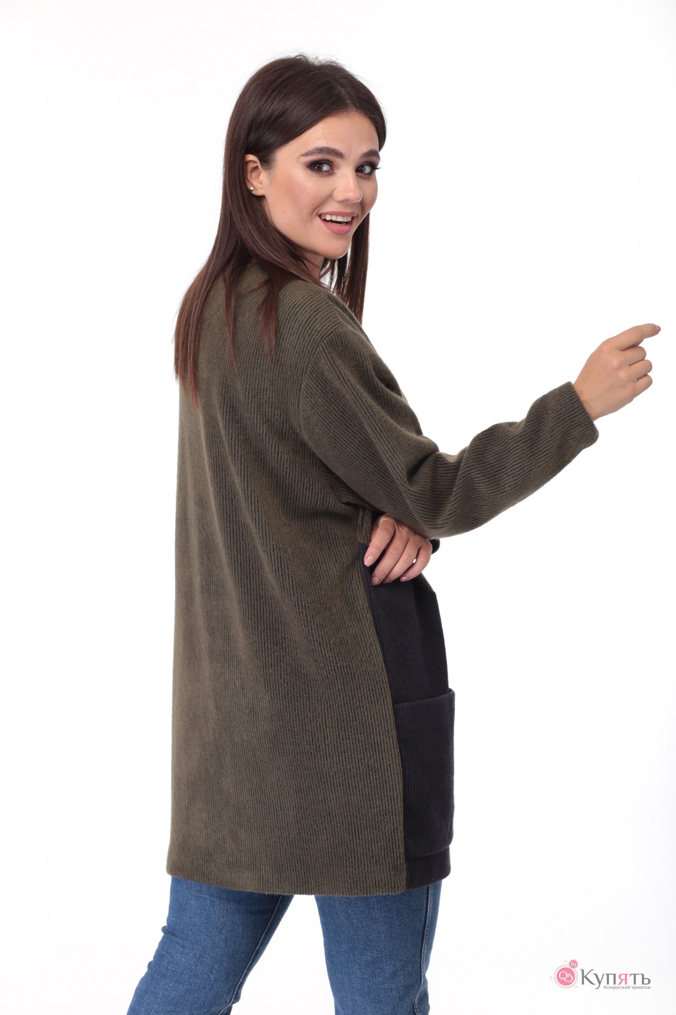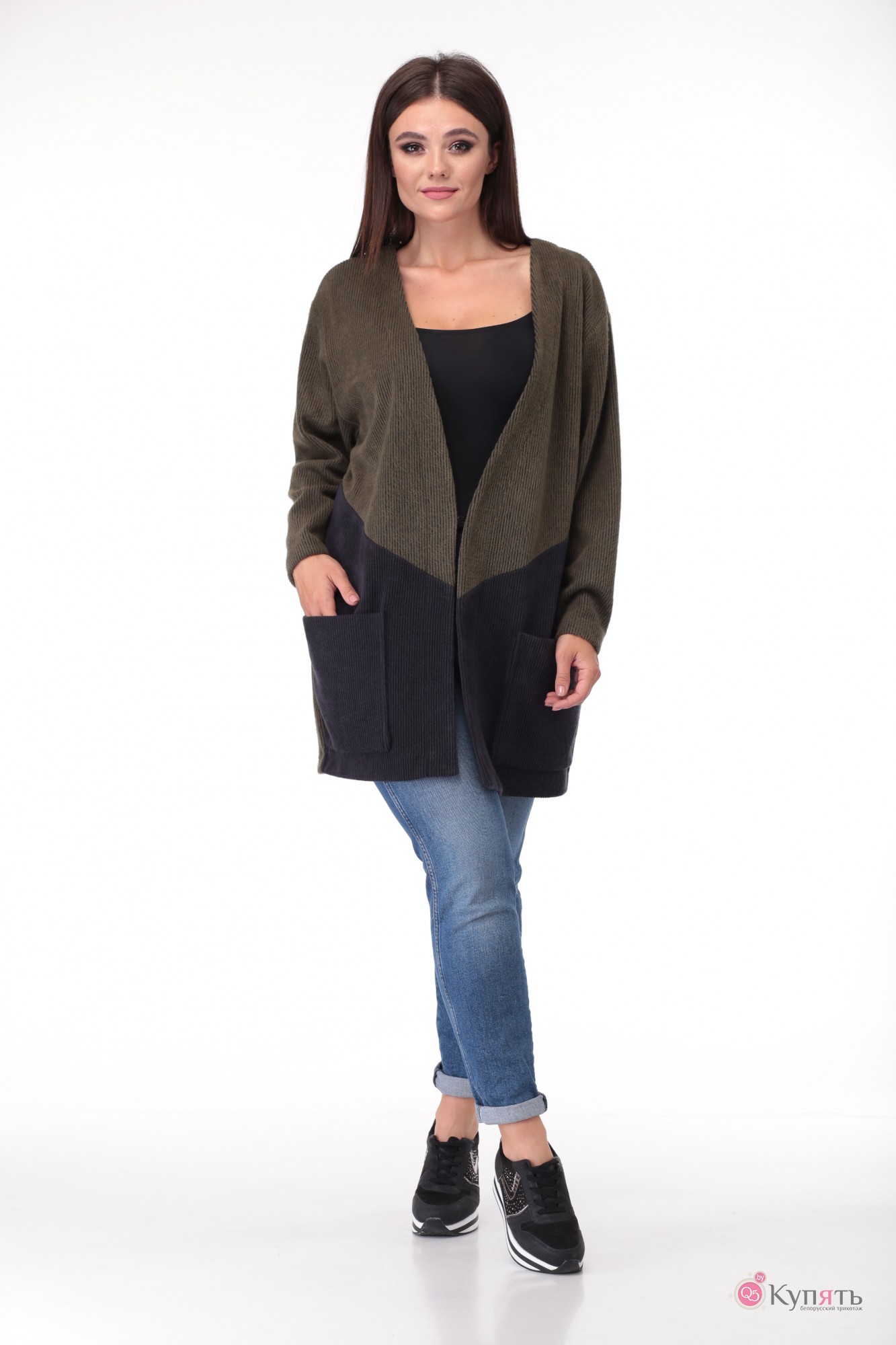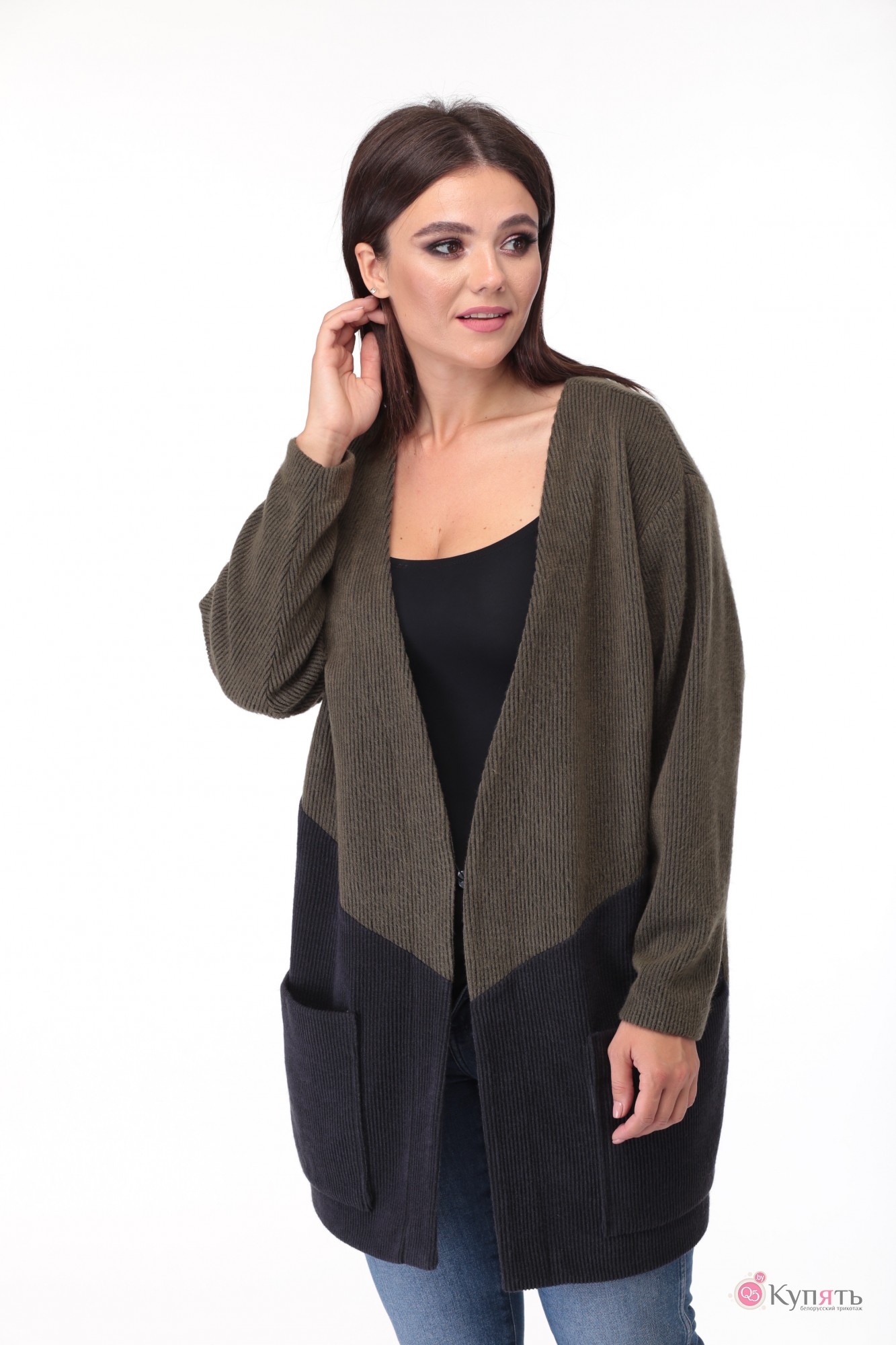 Кардиган женский выполнен из трикотажного полотна в рубчик двух цветов. Прямого, свободного силуэта, длиной закрывающей бедра. Полочка с центральной застежкой на потайную навесную петлю и пуговицу. В нижней части полочки диагональный подрез, накладной карман входит в боковой шов. Пройма спущенной формы, рукав длинный, одношовный, объемный в области плеча и заужен к низу. Спинка цельная.