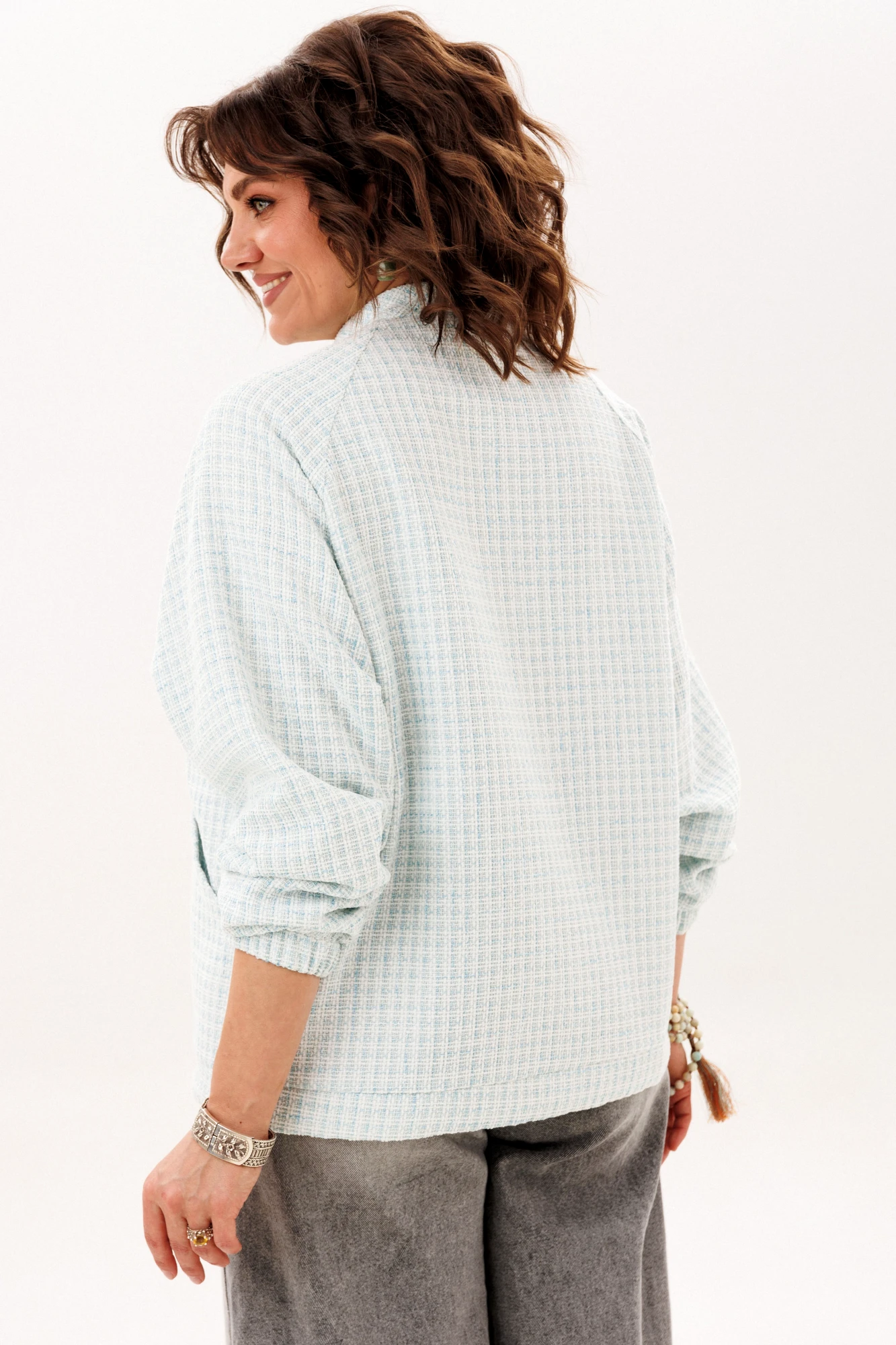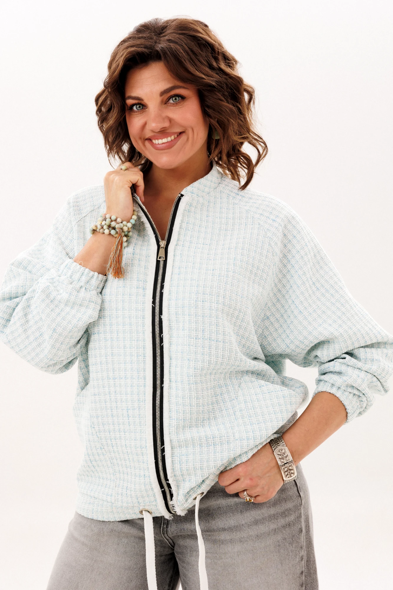 Этот блузон, словно воплощение непринужденной элегантности, предлагает ощущение комфорта, которое становится продолжением тебя. Его прямой силуэт, лишенный строгих границ, мягко следует за очертаниями фигуры, даря свободу каждому движению. Уют обрамляет горловину благодаря воротнику-стойке, создавая ощущение защищенности в прохладный день. Центральным элементом, приковывающим взгляд, служит застёжка-молния, чья фактурная текстура напоминает легкую, пушистую изморозь, придавая практичной детали неожиданно художественный эффект.