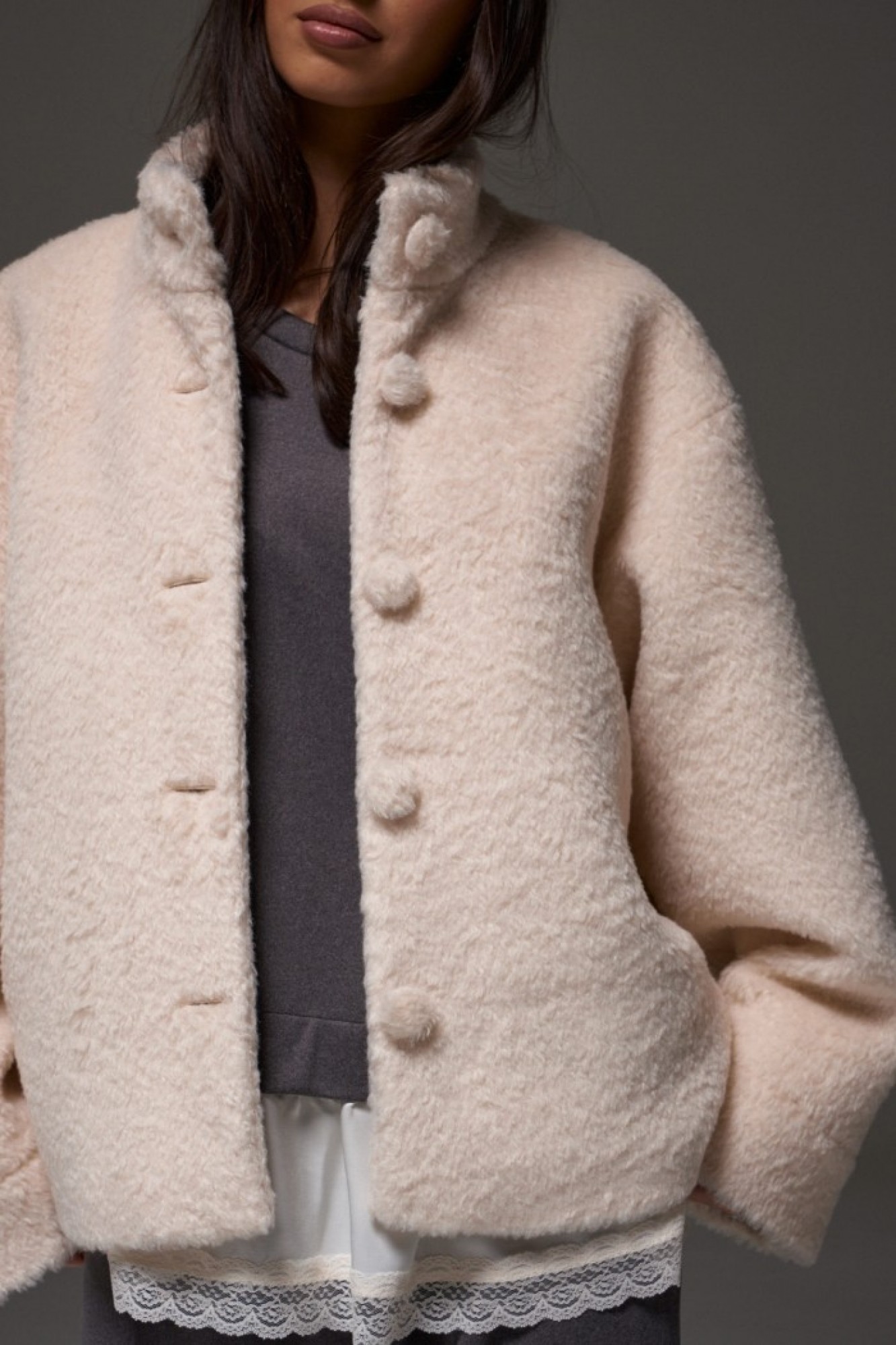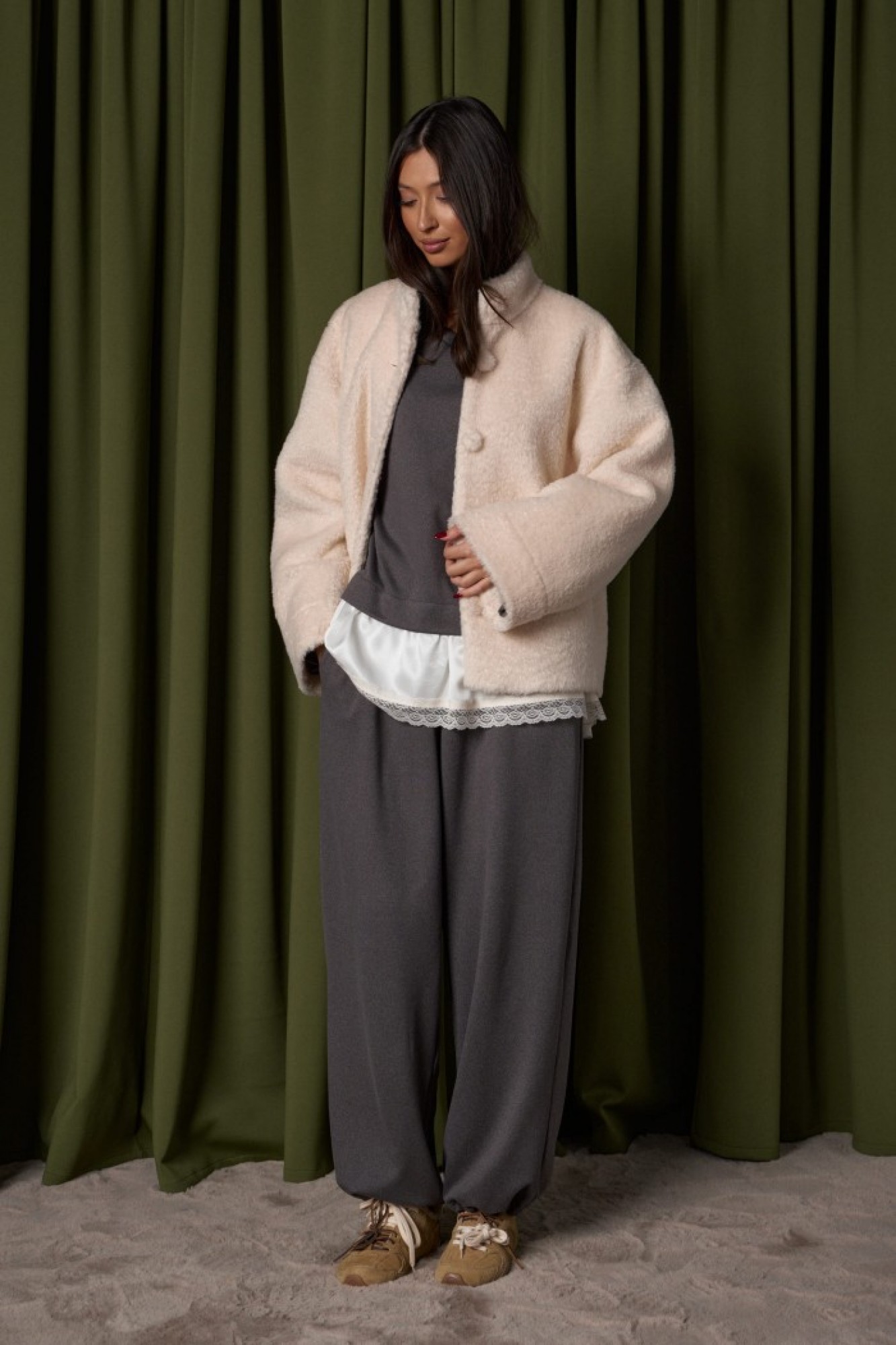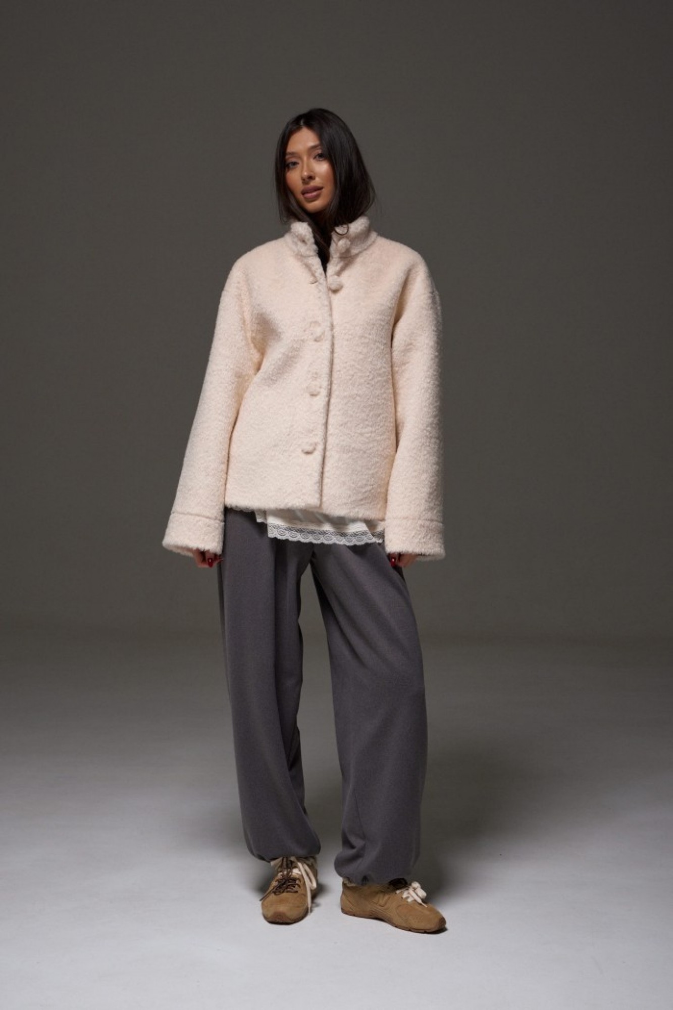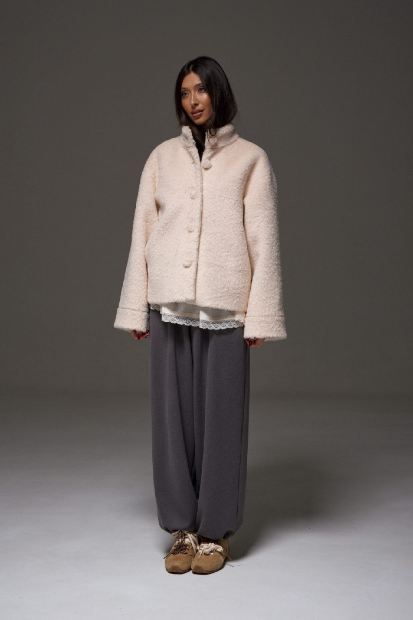 Кардиган бежевого цвета, изготовлен из фактурного полотна. Характеристики: прямой крой, воротник-стойка, брендированная подкладка, застежка центральная на петли пуговицы, рукав свободного кроя спущен.