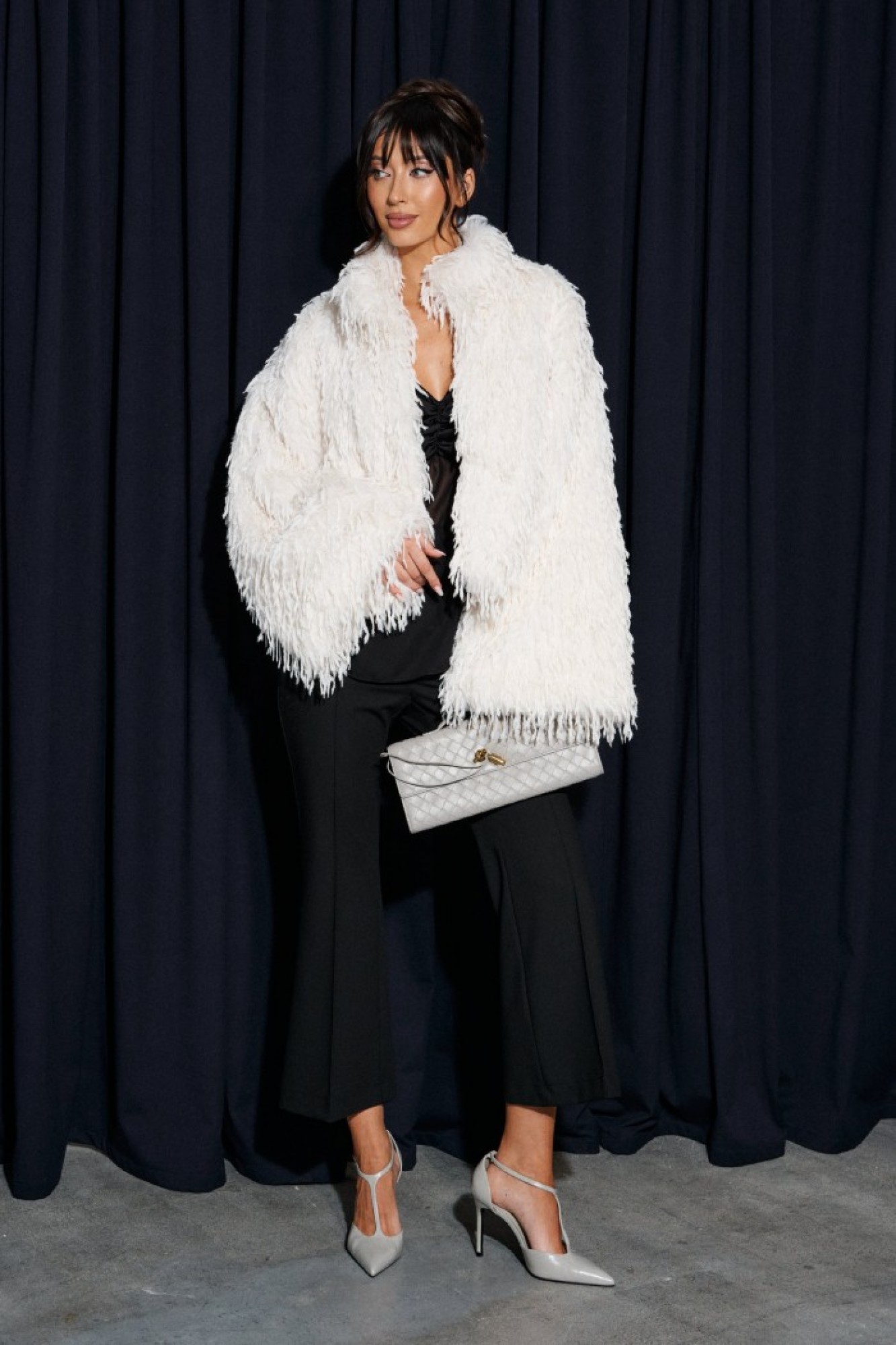 Шубка свободного кроя. Выполнена из мягкой пушистой ткани "пёрышки" тёплого белого цвета. Со стёганной подкладкой. Воротник стойка. Рукав втачной, спущенный. Застёжка центральная - крючки (3 шт).